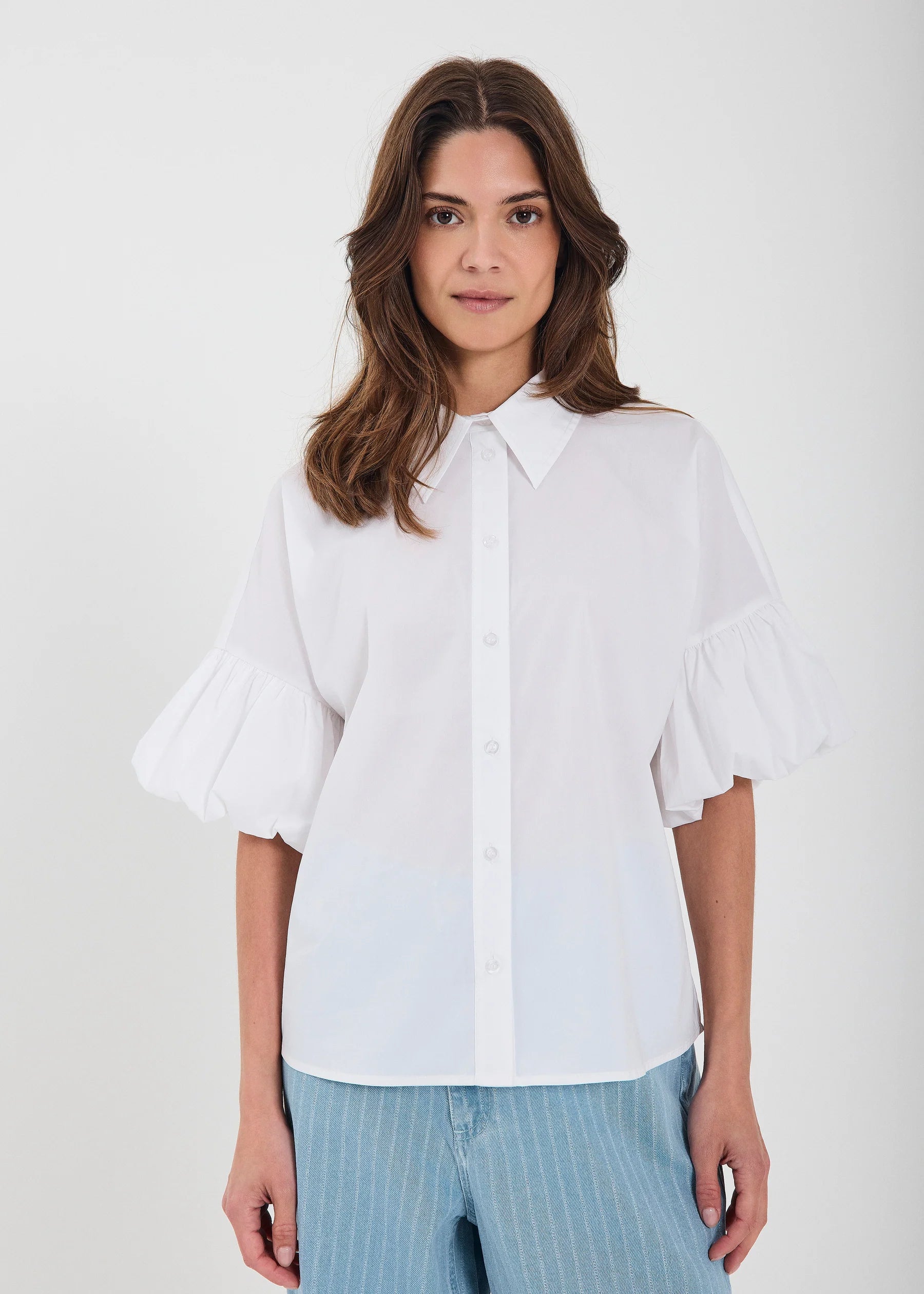 Betty SS Shirt fra Norr er laget av en lett bomullsblanding i vanlig passform. Den har en klassisk krage, knappelukking foran og voluminøse ¾-ermer med rynkedetaljer som gir en moderne, feminin vri til et tidløst basisplagg. Perfekt å kombinere med denim for et avslappet antrekk eller skreddersydde plagg for et mer polert antrekk.