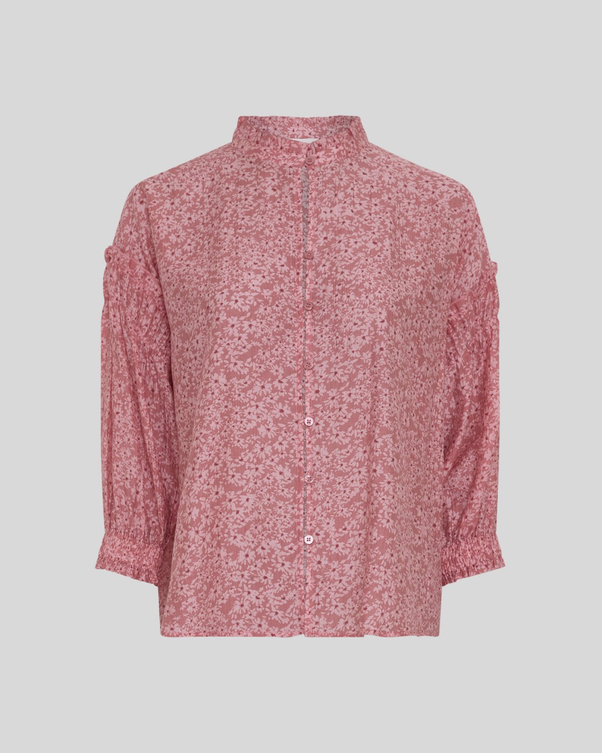 MSCHSeraphina 3/4 Shirt fra MSCH Copenhagen er en bluse i lett vevd kvalitet med heldekkende blomstertrykk. Designet med ståkrage med lett volangkant, gjennomgående knappelukking og 3/4-ermer med elastisk volangkant. Løs passform.