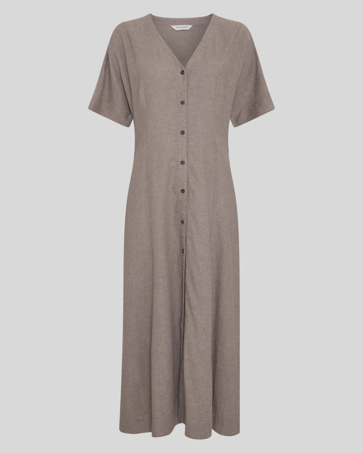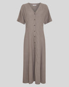 MSCHViana Ginia 2/4 Dress er en lang kjole i linblanding. Designet med V-hals og knappelukking helt ned foran. Korte ermer og en lett A-formet silhuett.