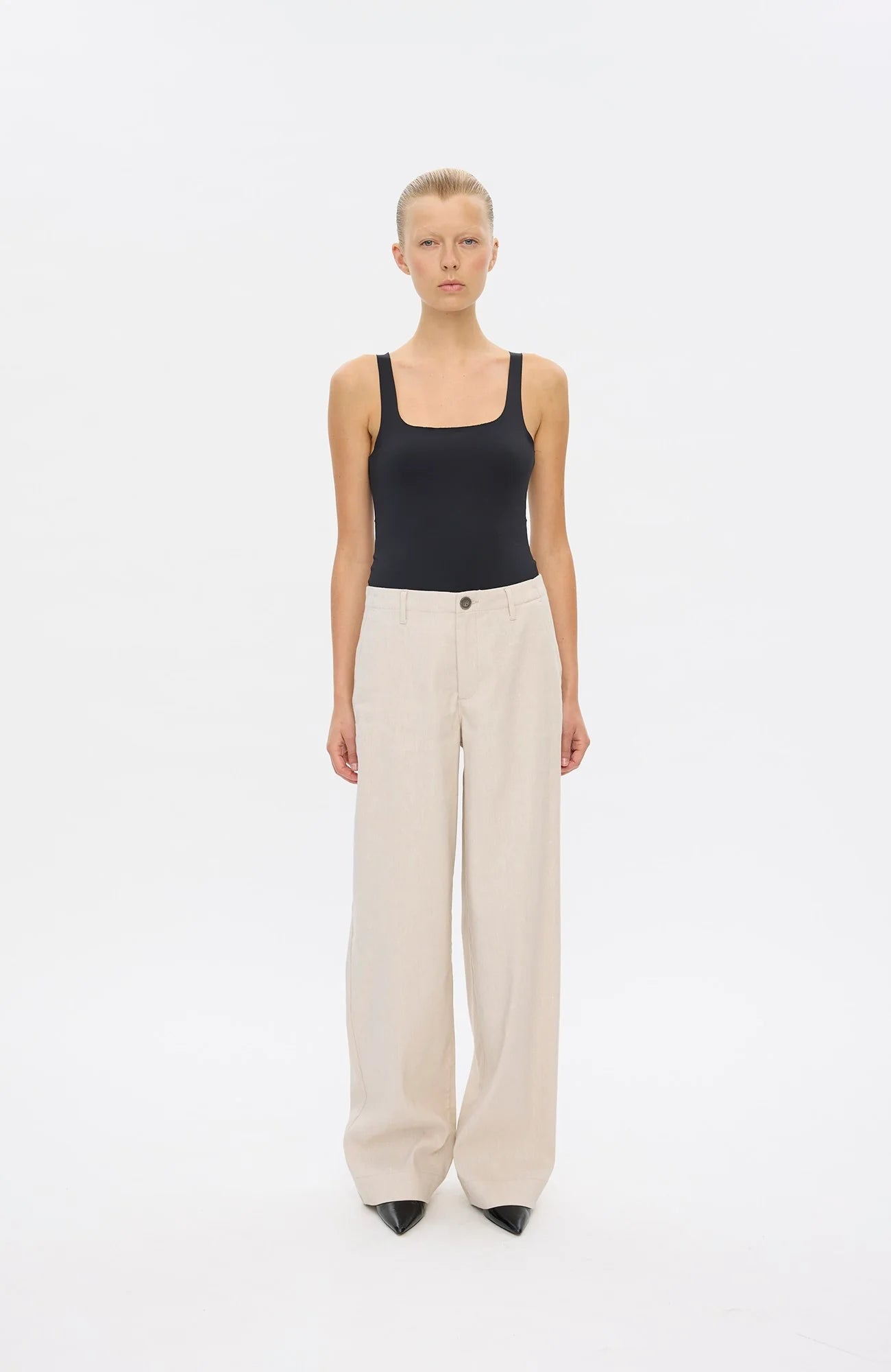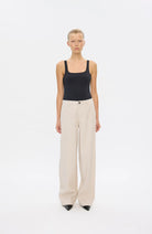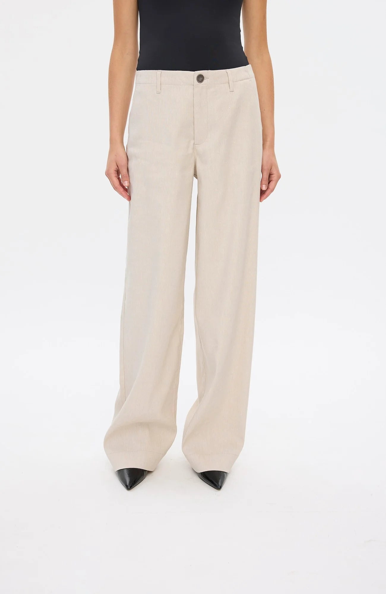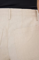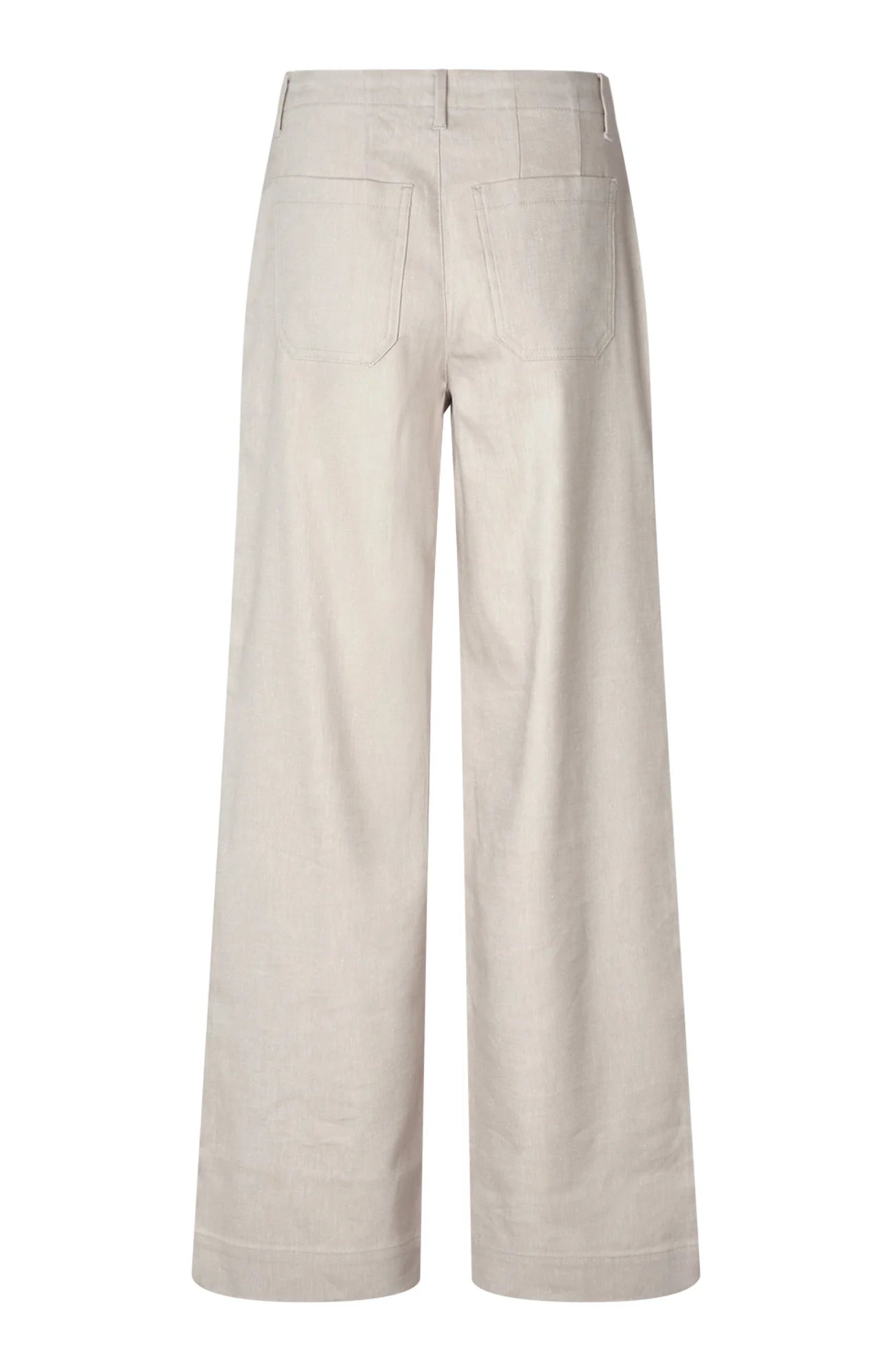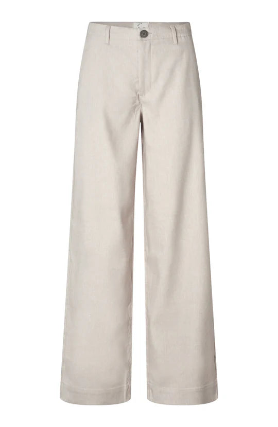EricaFV 769 Sand Linen fra Five Units har et avslappet og rent utseende, og har en oppbygd linning med belteløkker og glidelåsgylf med knappelukking. De har en rett, vid benskåret silhuett, og er subtilt detaljert med pyntesøm og påsydde baklommer.