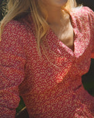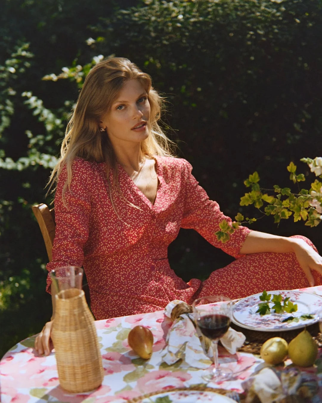 Spring Button-Down Dress fra byTiMo har en maxilengde, en tettsittende midje med vaffelsøm bak, V-hals og knapper foran for lukking. Ermene er trekvartlange med rynking langs sidene og lett puffede skuldre. Fargen på kjolen er rød med svakt gule prikker.