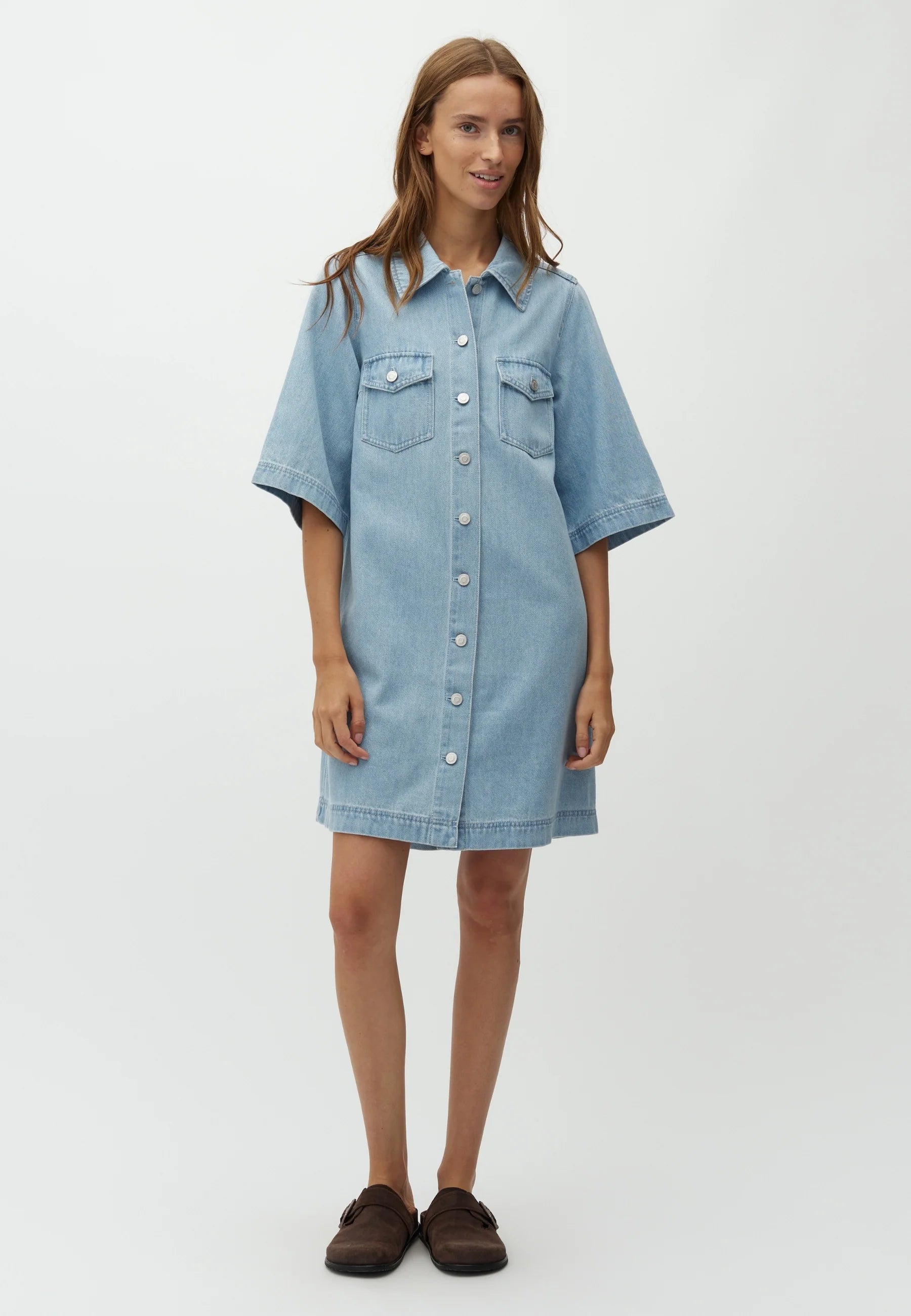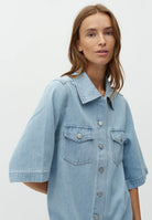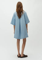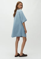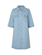 Mira-M Stellan Dress fra MbyM er en avslappet og stilren denimkjole som kombinerer komfort med et tidløst uttrykk. Den lyse denimvasken gir et mykt og sommerlig preg, perfekt for både hverdagsbruk og uformelle anledninger. Kjolen har en løs og behagelig passform med korte ermer og klassisk skjortekrage, som gir et rent og moderne uttrykk. De gjennomgående knappene i front og brystlommer tilfører et hint av klassisk denimstil, mens den lette kvaliteten gjør den behagelig å ha på hele dagen. Den faller fint på kroppen og gir en uanstrengt, flatterende silhuett som er enkel å style. Bruk den alene med sandaler for en enkel sommerlook, eller style med sneakers eller boots for et mer edgy uttrykk. En allsidig favoritt som raskt blir en go-to i garderoben.
