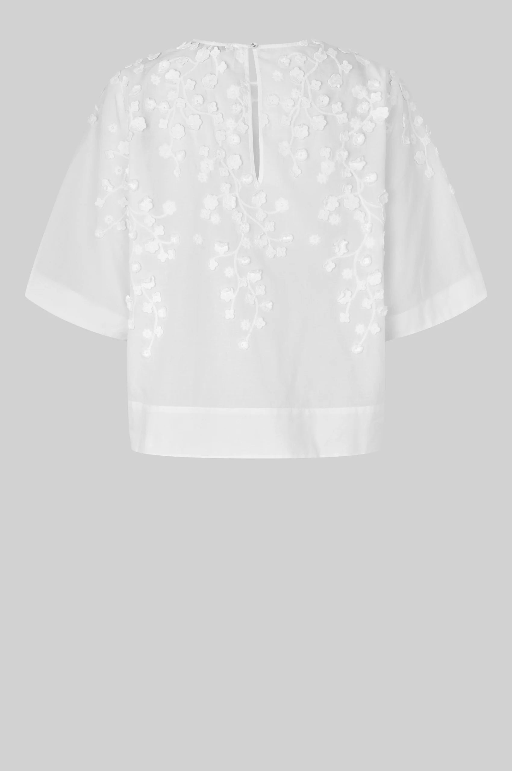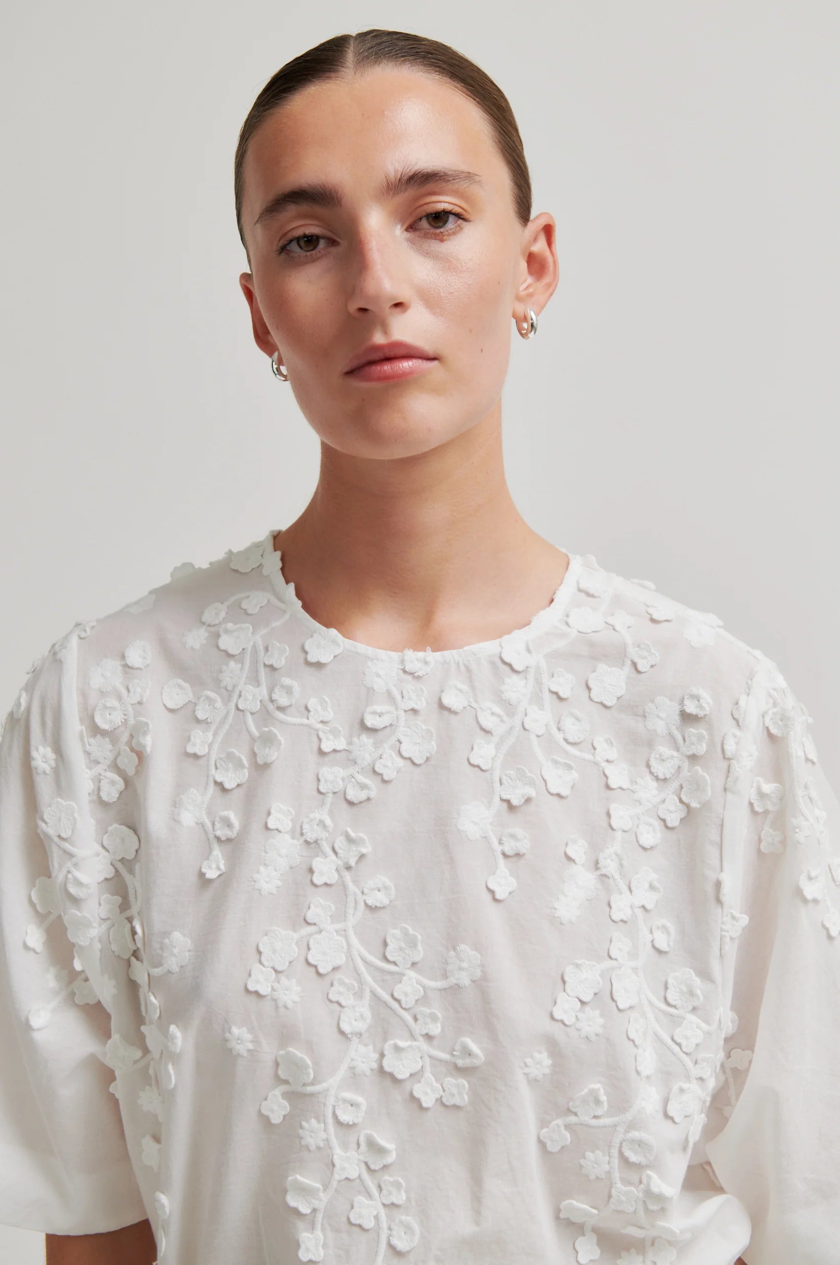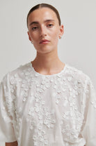 Farrow Blouse fra Second Female er en søt bluse med broderi. Blusen er laget i myk bomull med 3D-broderte blomster. Har rund hals og knappelukking bak i nakken. Korte ermer med omvendte folder for ekstra fasong. Vid, firkantet passform.