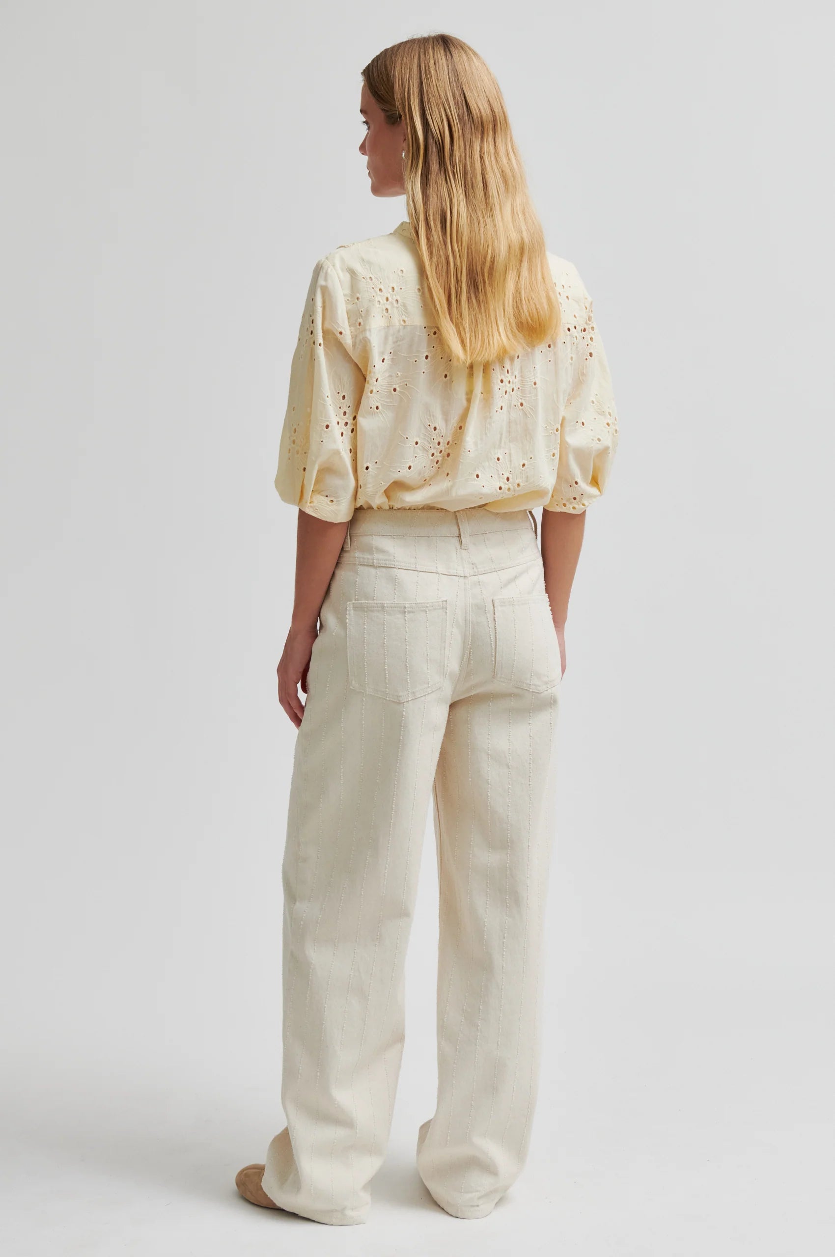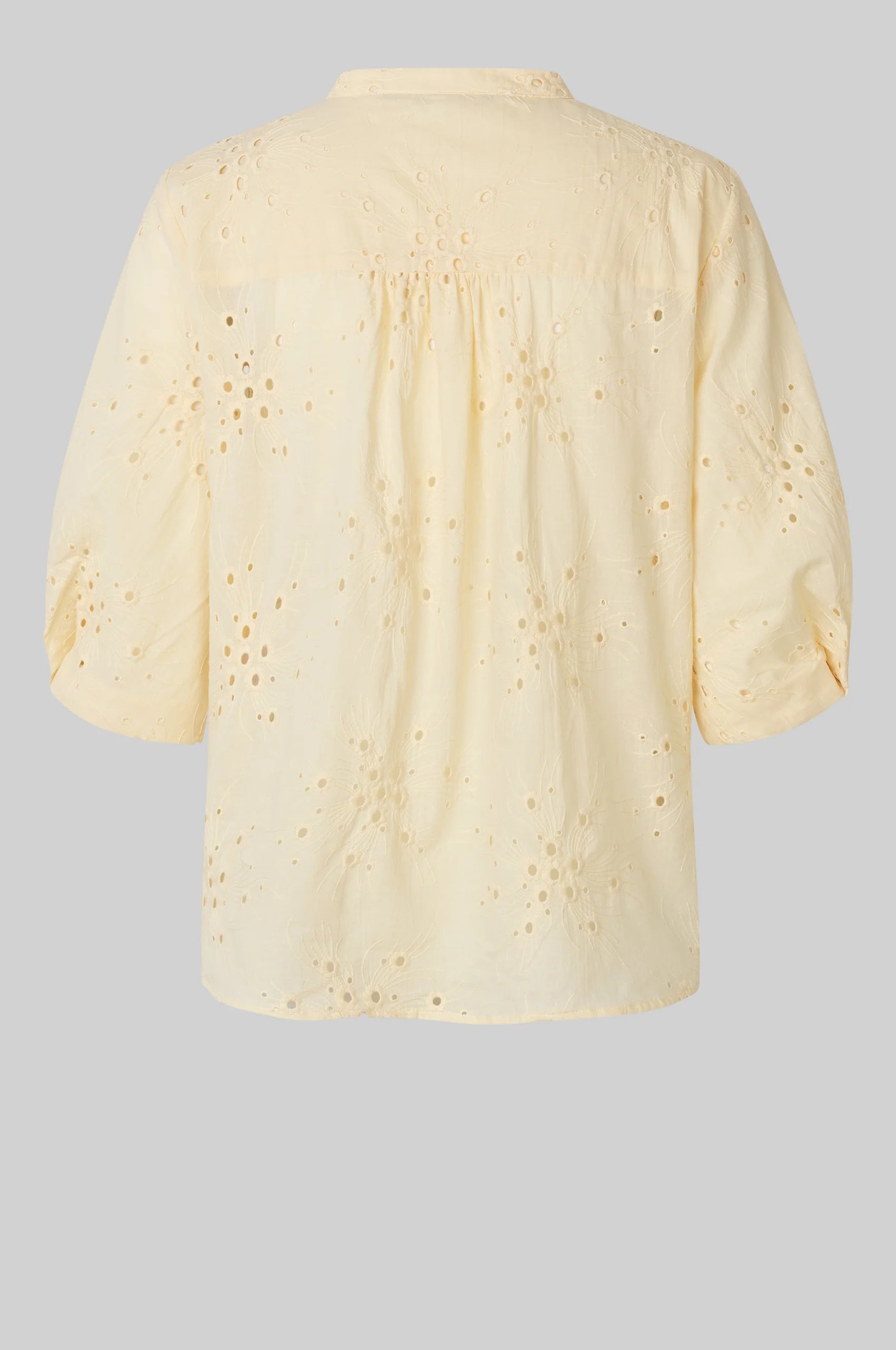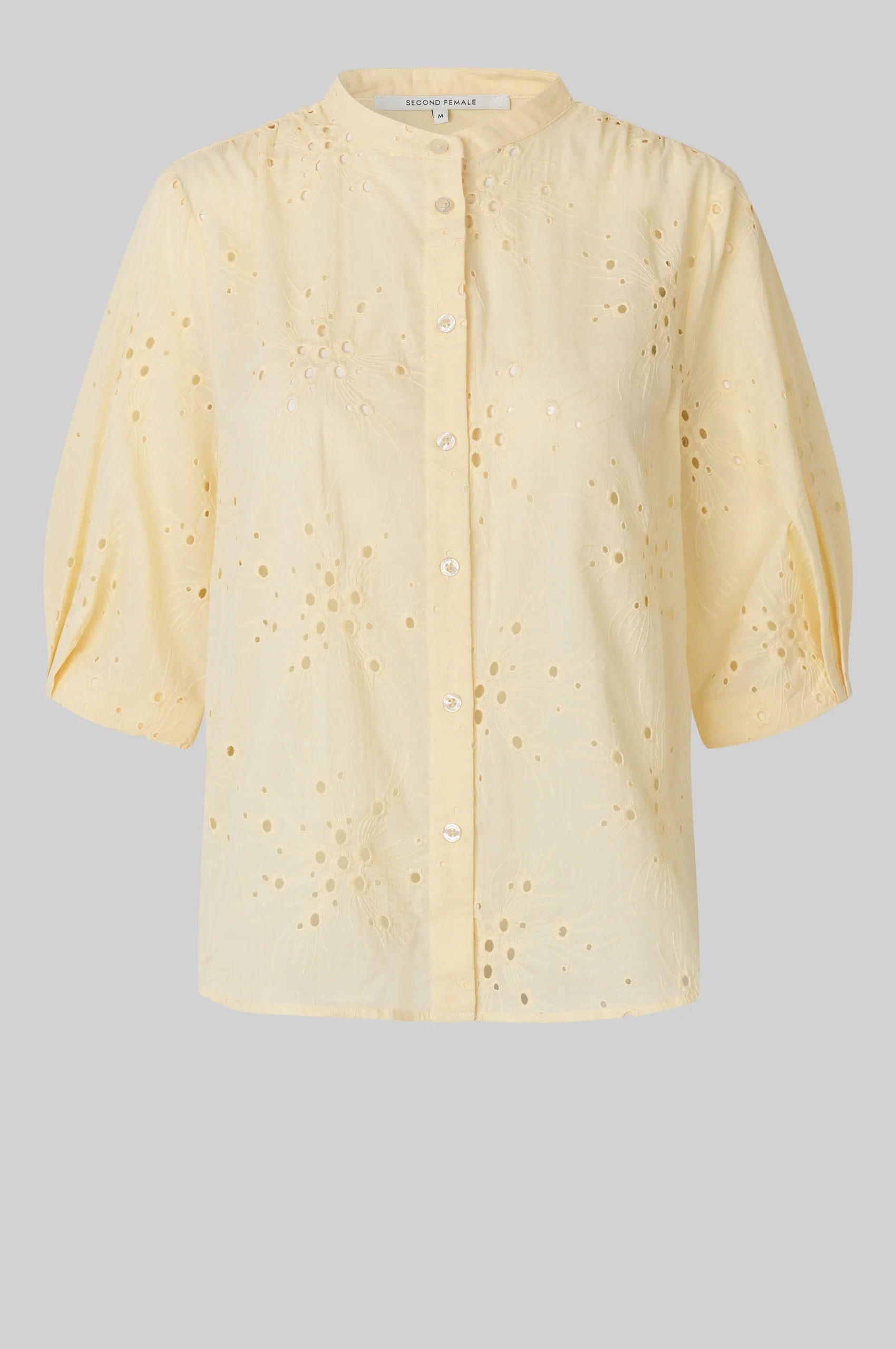 Cavana Shirt fra Second Female i en nydelig gul farge er en skjorte med utskjæringsmønster. Blusen er laget i glatt bomull med utskjæringsbroderi. Rund krage og knappelukking. Avkortede ermer med brettet kant og plisserte detaljer. Formsydd kant. Normal passform.