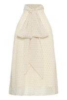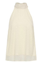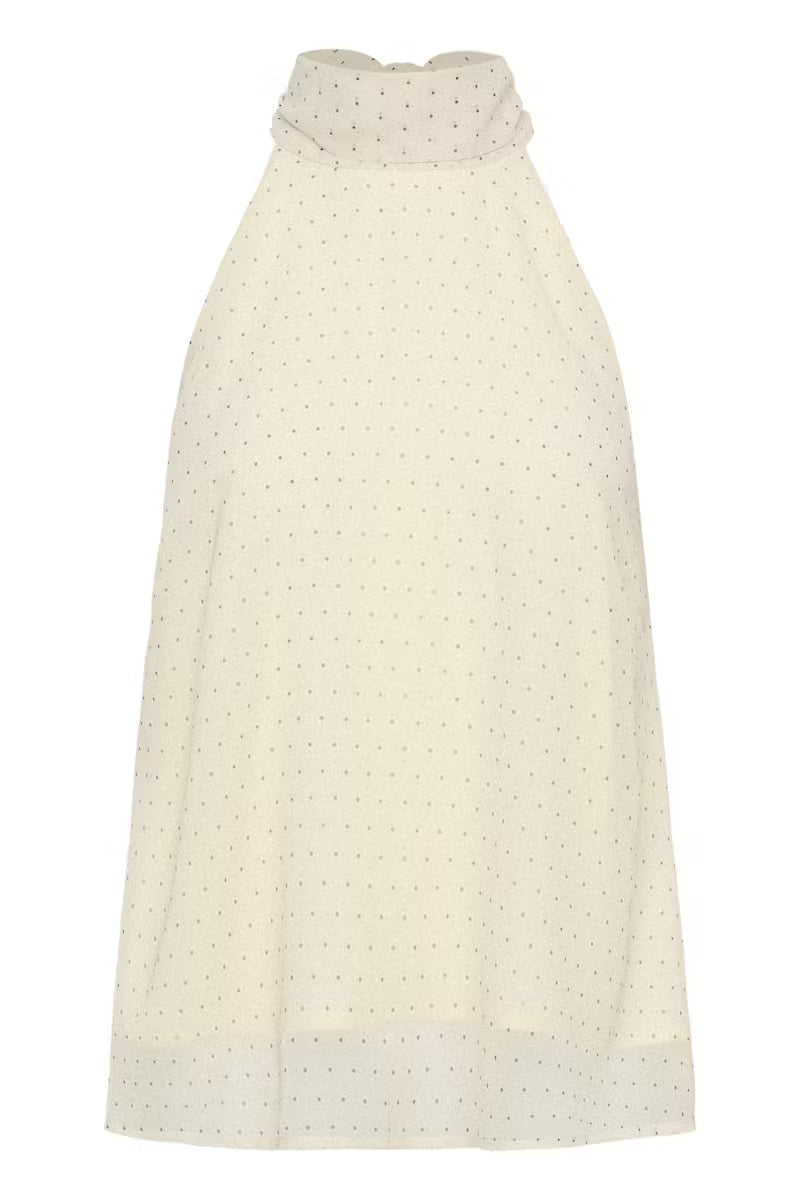 alterneck-topp med høy hals og skjerfdetalj, prikket halvgjennomsiktig tekstur og løs passform. Ermeløs silhuett gir moderne uttrykk.