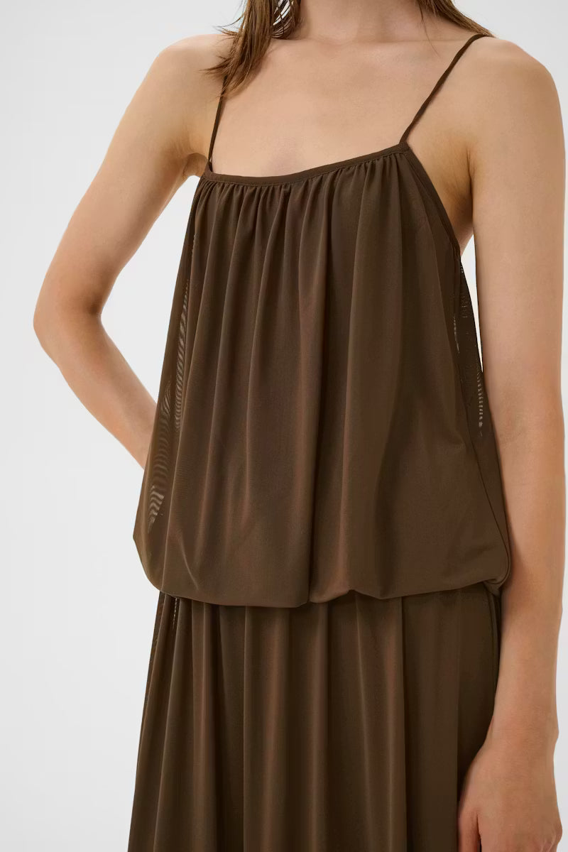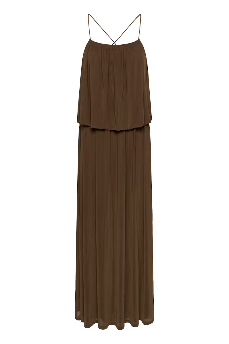 GZsamera Dress fra Gestuz er en maksikjole med mykt drapert overlagsliv, tynne spaghettistropper og avslappet fasong. Luftig, flytende tekstur og gulvlang lengde.