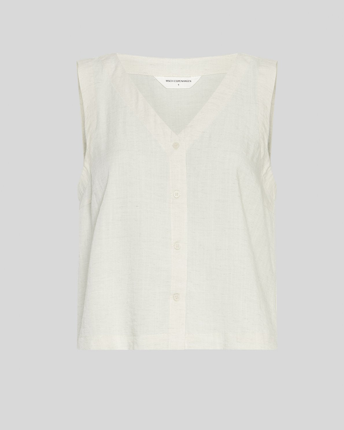MSCHDaria SL Shirt fra MSCH Copenhagen er en ermeløs skjorte i lett vevd kvalitet. Designet med V-hals og knappelukking foran. Rett silhuett med en lett struktur i materialet.