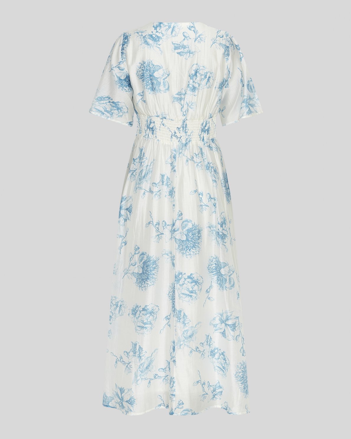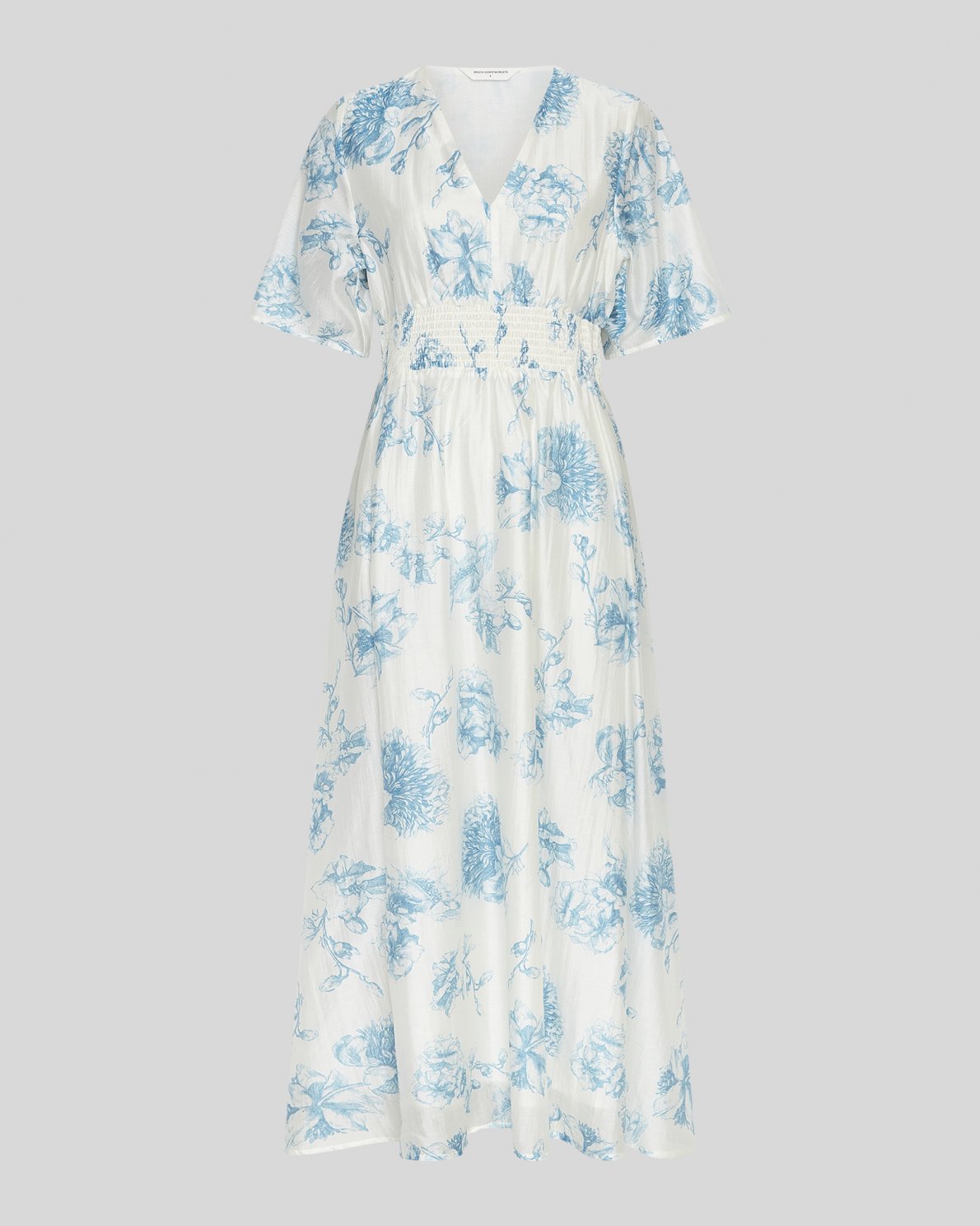 MSCHEvangelia 2/4 Dress fra MSCH Copenhagen har blomstertrykk, V-hals, 2/4-ermer og smockdetalj i midjen. Designet i en lang lengde med mykt fall.