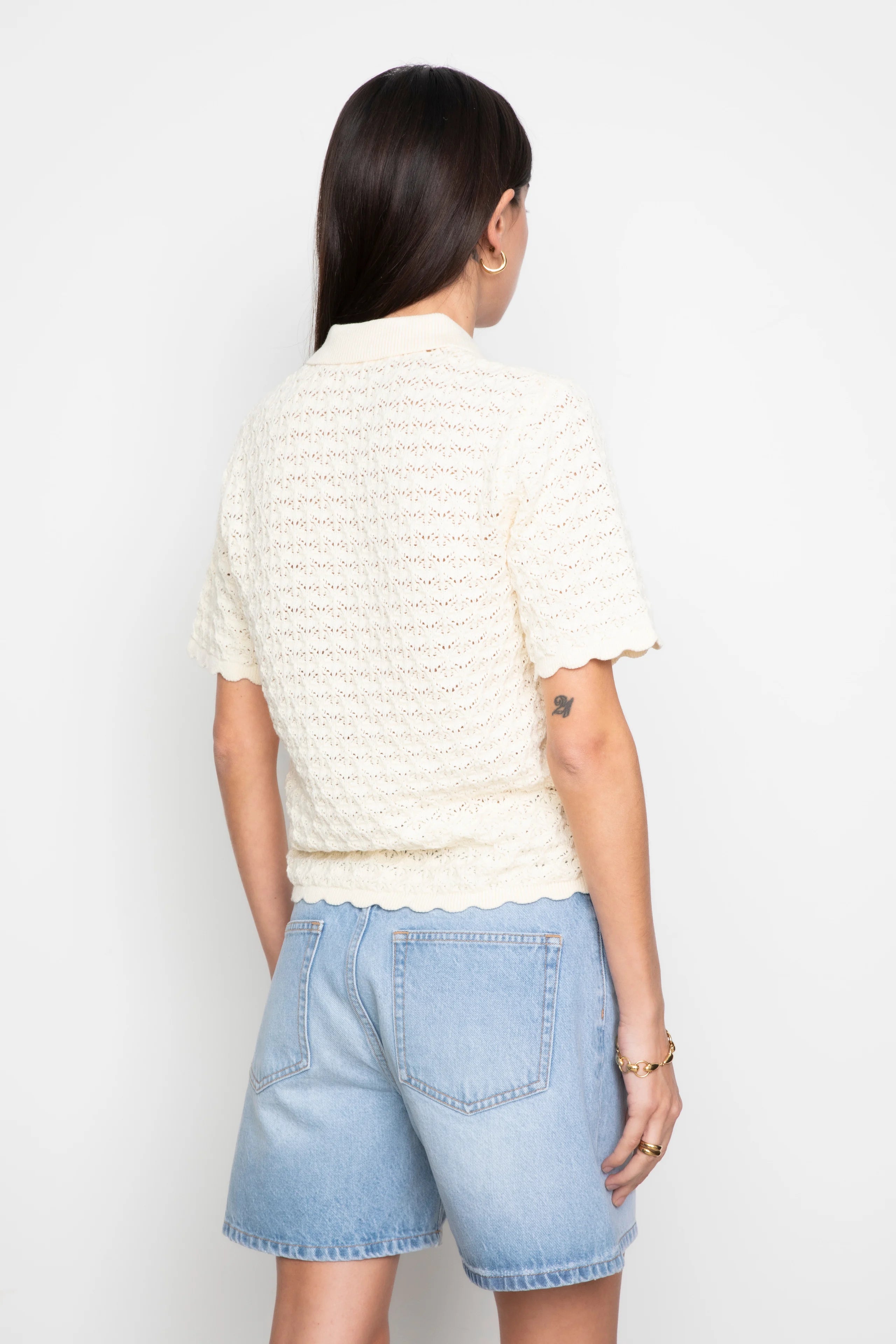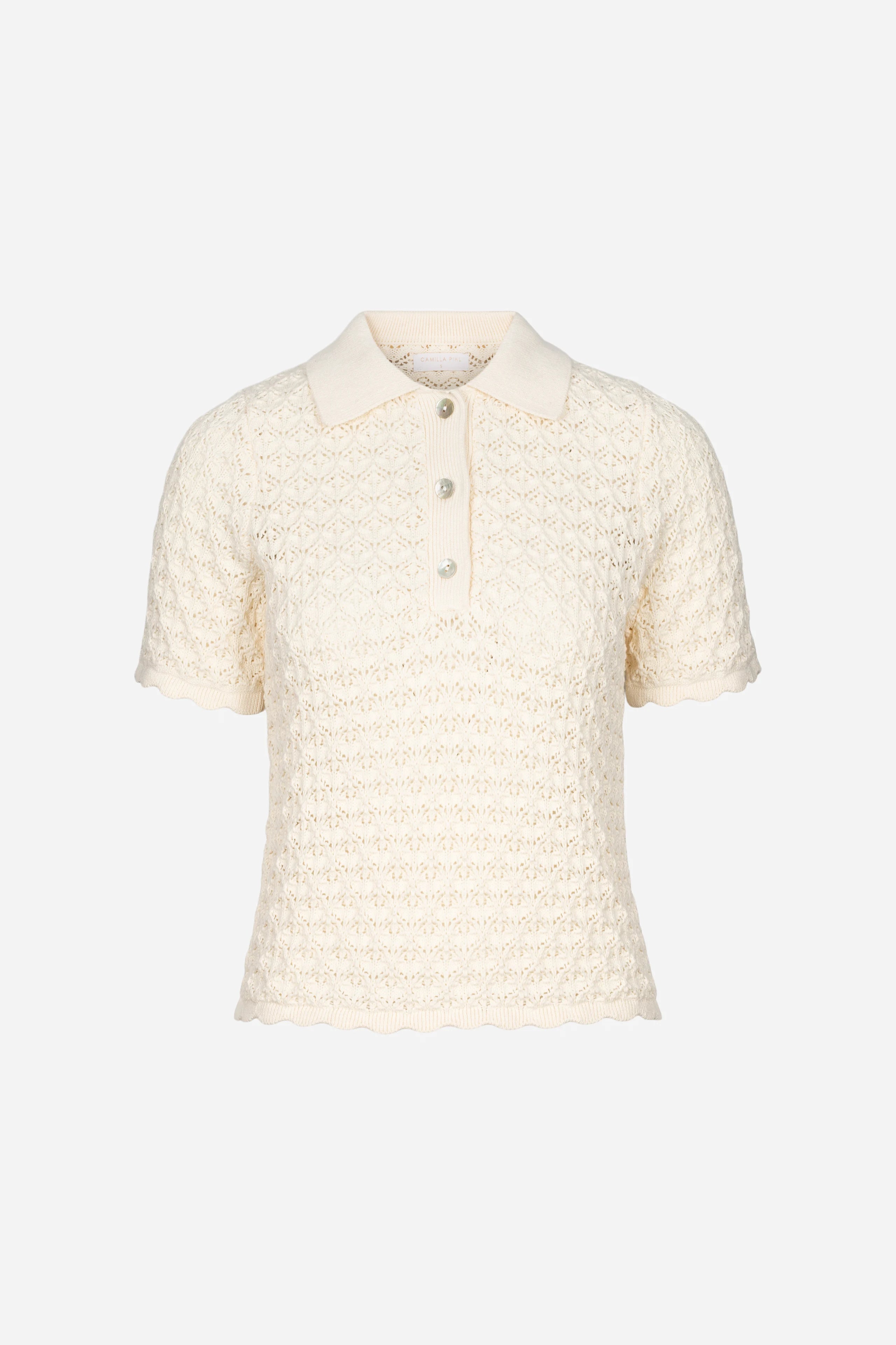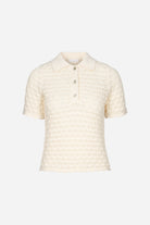Gwen Knit Tee fra Camilla Pihl er en strikket kortermet poloskjorte laget av en bomullsblanding med et sesongbasert heklemønster. Den har tre knappelukkinger langs stolpen foran, og gir en moderne vri på en tidløs strikkeklassiker.