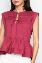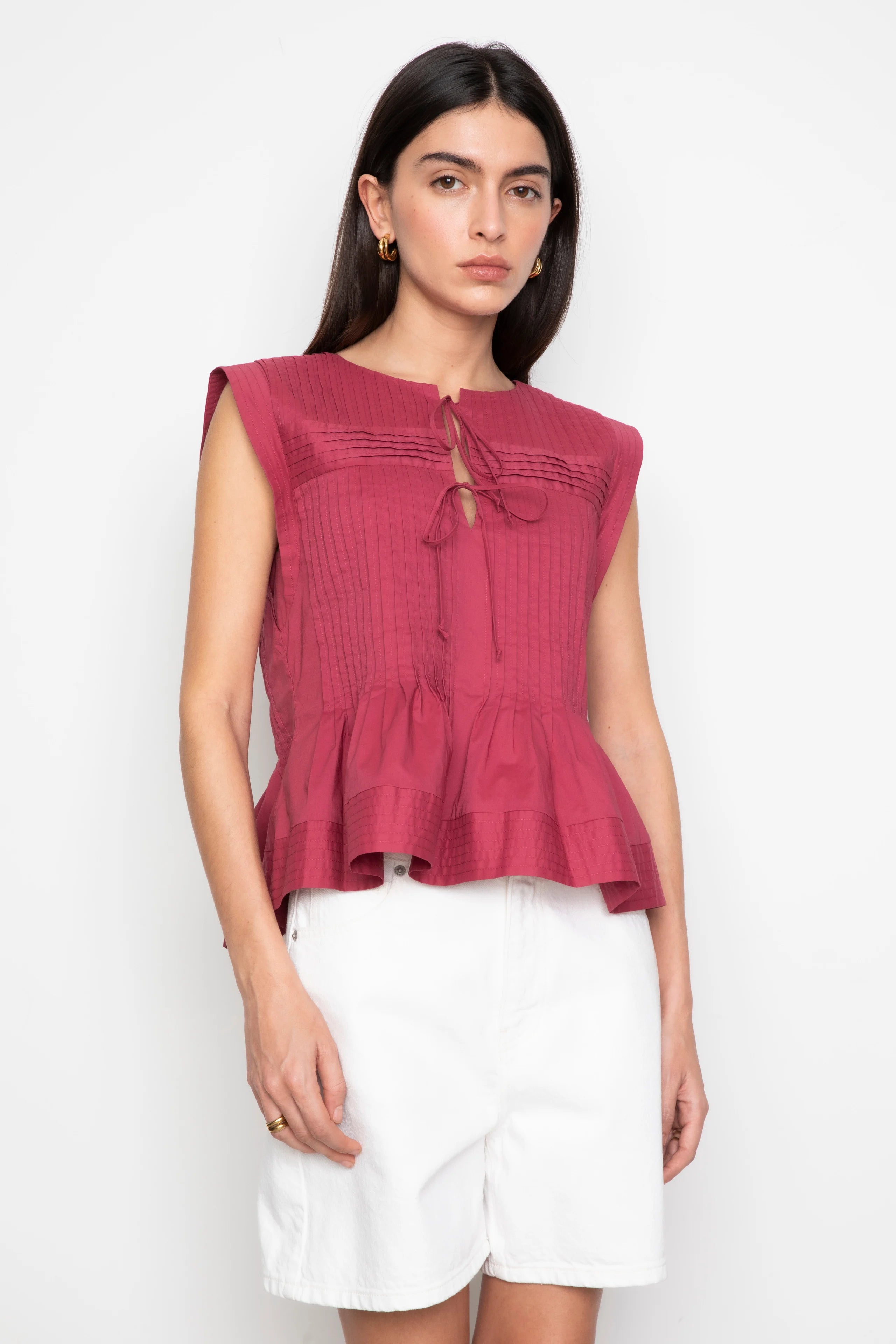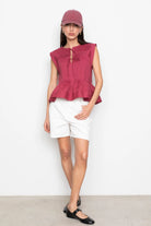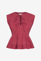 Mavie Top fra Camilla Pihl er en myk bomullsmodell med leggdetaljer på brystet og en peplumkant. Den er designet med en åpen front som lukkes med knytebånd, og gir en lett og feminin silhuett.