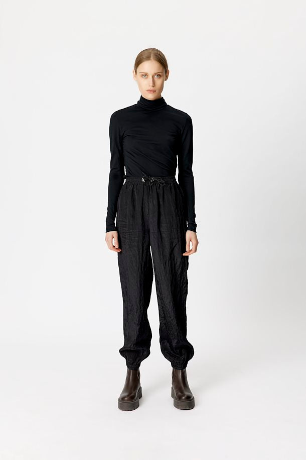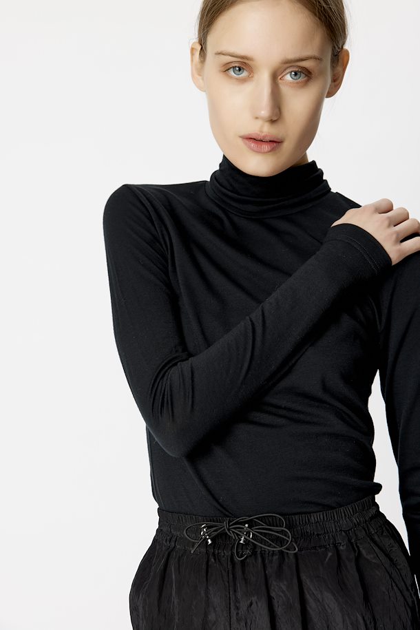 Figursydd langermet turtleneck med et silkeaktig og moderne utseende. Genseren har en konvertibel hals og tilpasset struktur i en spesiell stoffblanding som skaper en flatterende silhuett. Bruk halsen rullet helt åpen eller fold den sammen etter hvilken look du ønsker.