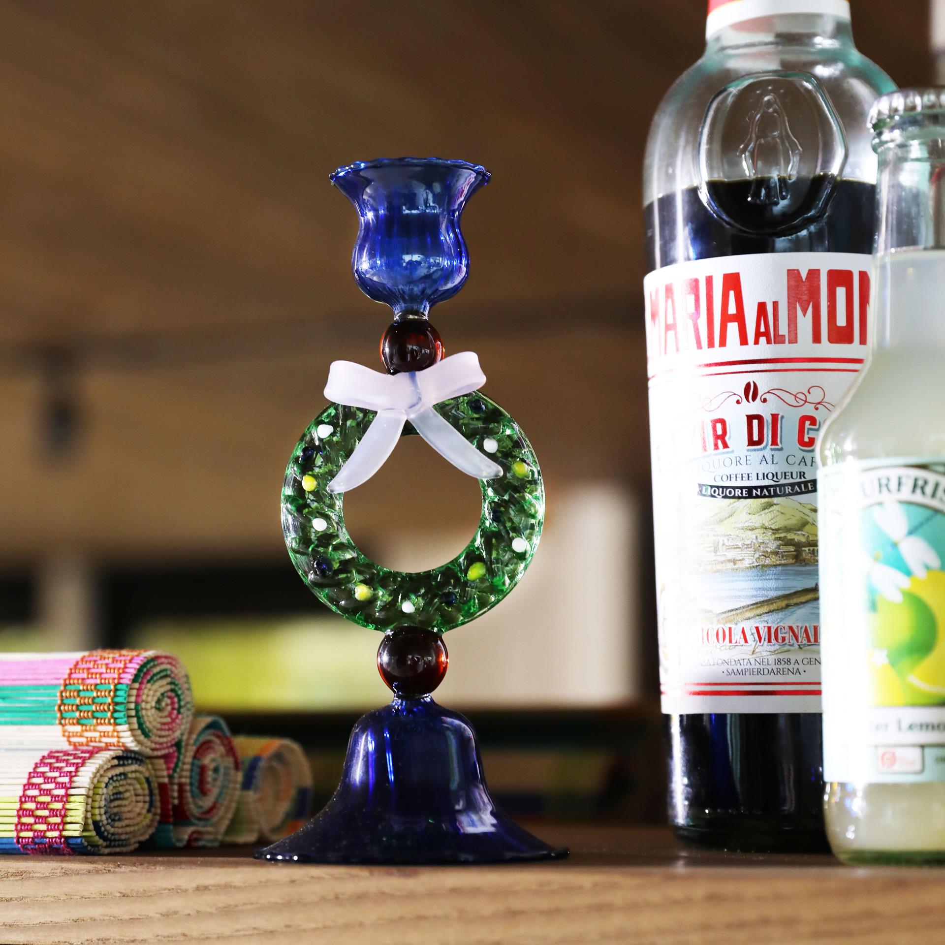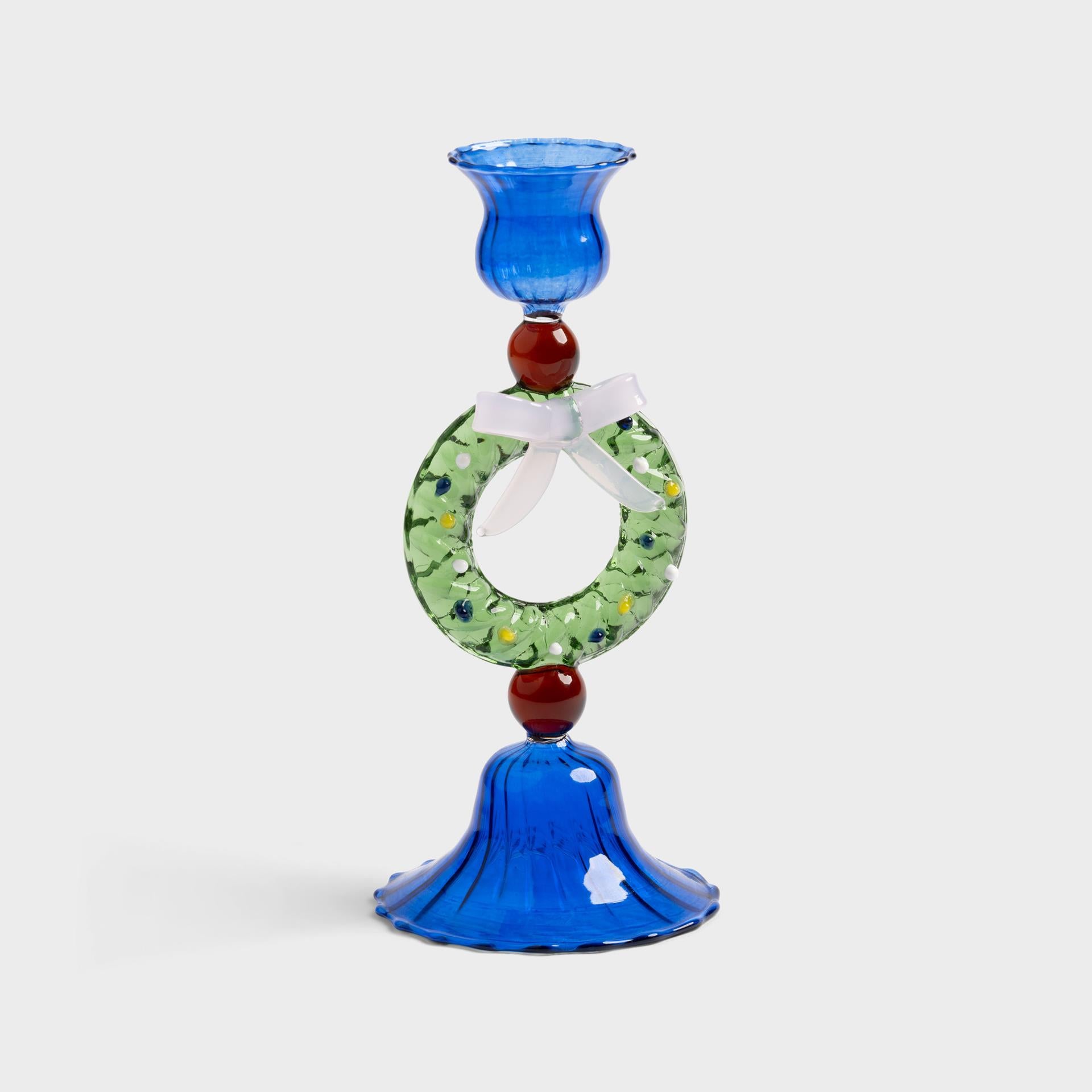 Merry Wreath er en håndblåst lysestake fra &klevering i glass. Lysestaken har et nydelig julemotiv, en grønn julekrans med en pen sløyfe og blå detaljer. Perfekt for å lyse opp høytiden!