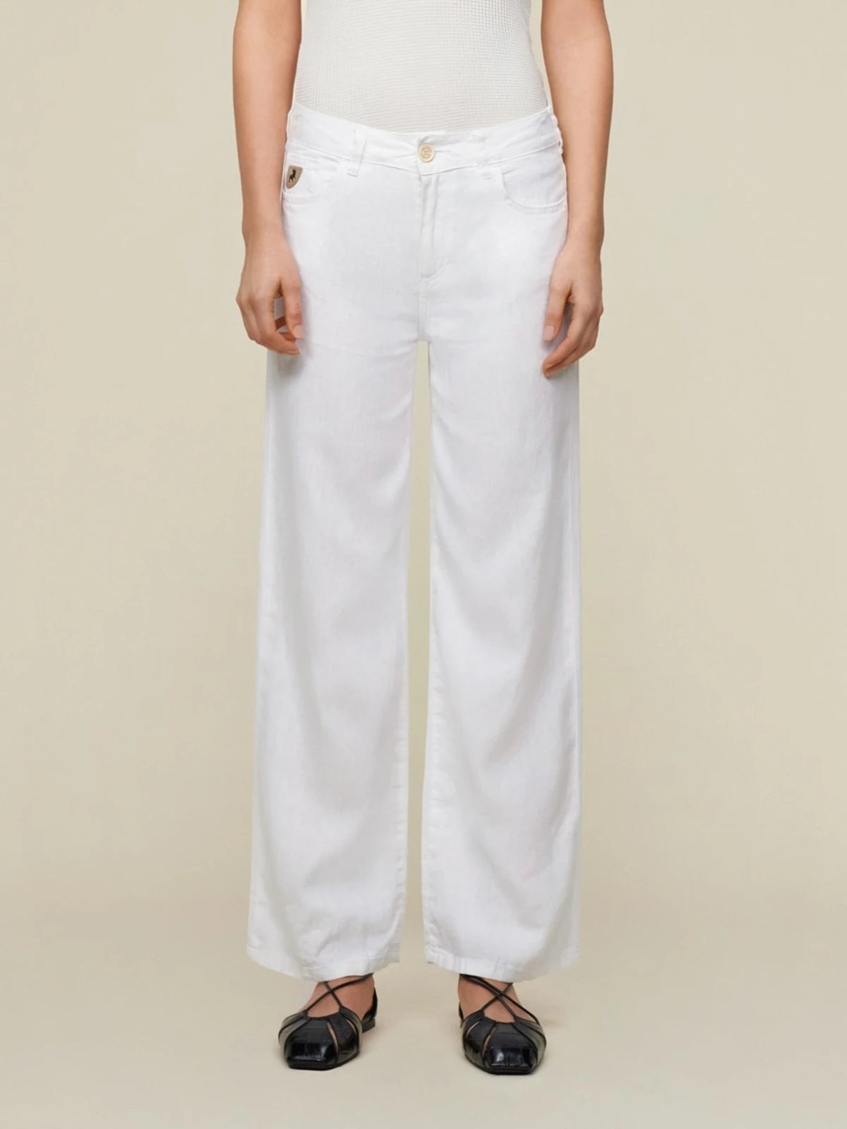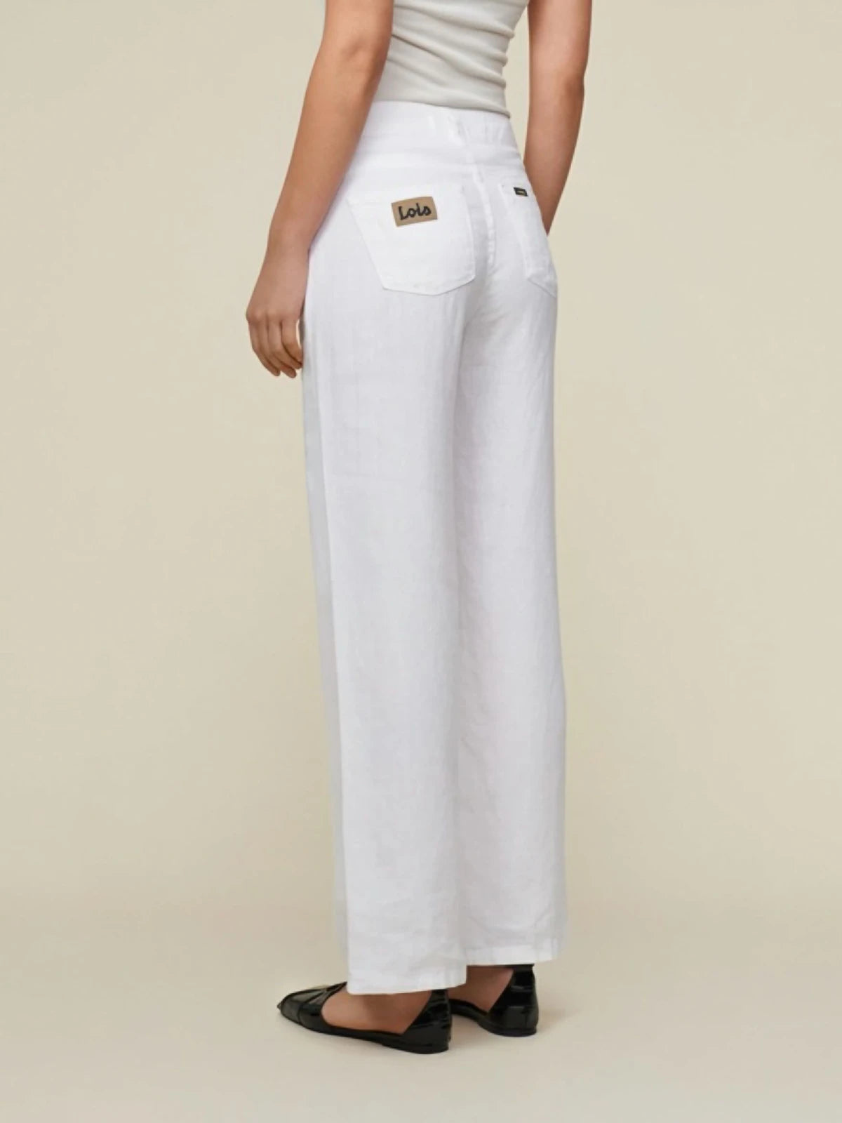 Culotte 8032 Linen Summer White fra Lois er en lett linbukse med avslappet passform og høyt liv. Modellen har beltehemper, rette og vide ben og klassisk 5-lommersdesign. Buksen lukkes med knapp og glidelås i front. En fin sommerbukse som passer godt på varme dager.