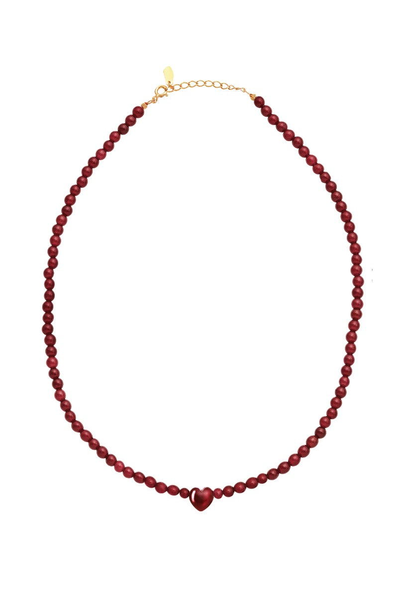 Sienna Heart Necklace fra Maanesten er et vakkert smykke fra valentinskolleksjonen. Halskjedet er dekorert med mørkerøde perler hele veien rundt, kombinert med et nydelig lite hjerteanheng i matchende rød stein. Et romantisk og elegant smykke som er like fint alene som sammen med andre favorittkjeder.