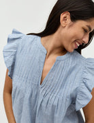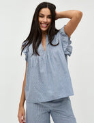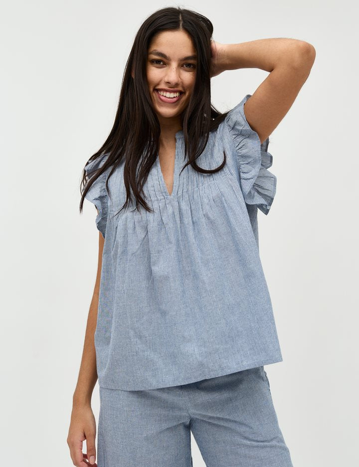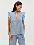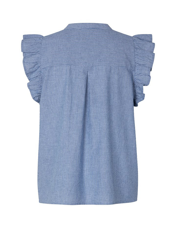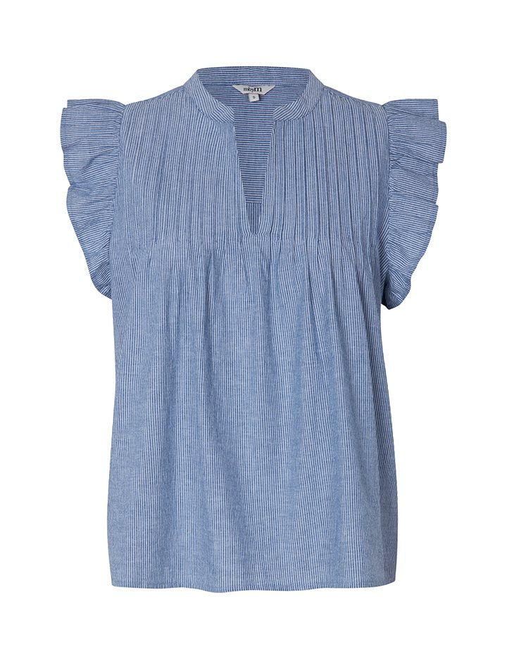 Gemala-M Top fra MbyM er en ermeløs topp i 100 % bomull med fine volangdetaljer på skuldrene. Toppen har en rund hals med V-utringning og en avslappet passform som gir en komfortabel og luftig silhuett. Vevd mønster i stoffet og delikate striper i blått og hvitt gir et sommerlig uttrykk. Normal lengde – perfekt til både bukser og skjørt.