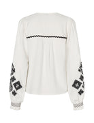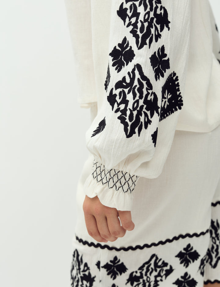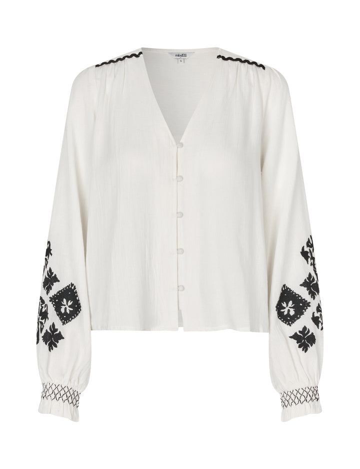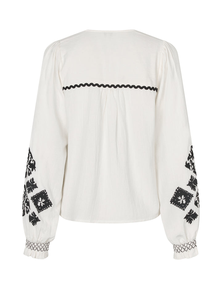 Kanja-M Contrasta Shirt fra MbyM er en vakker langermet bluse med broderidetaljer. Denne blusen kan brukes hele året, men er perfekt sammen med den deilige, matchende shortsen på varme sommerdager.