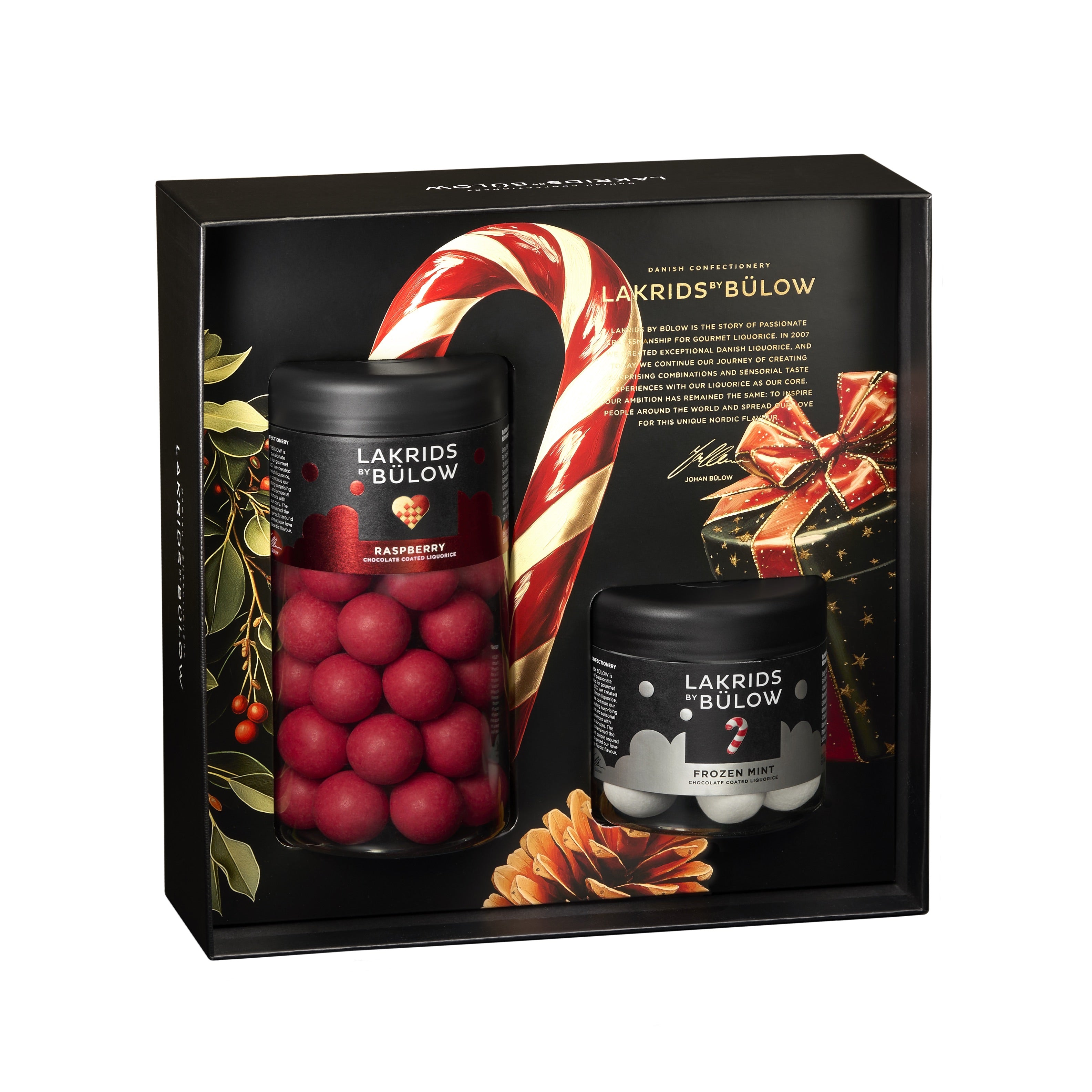 Black Box med Crispy Raspberry og Frozen gir en magisk smaksopplevelse. Crispy Raspberry har en kjerne av søt lakris og kombinerer hvit sjokolade med friske rosa bringebær og et hint av jordbær, dekket av et sprøtt sukkerskall. Frozen Mint tar deg med til snødekte vidder med søt lakris, myk hvit sjokolade og et overraskende touch av mynte. Perfekt å nyte selv eller gi som gave denne vinteren.