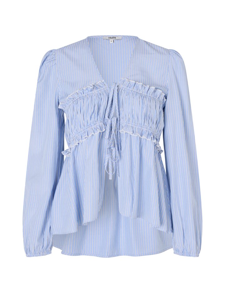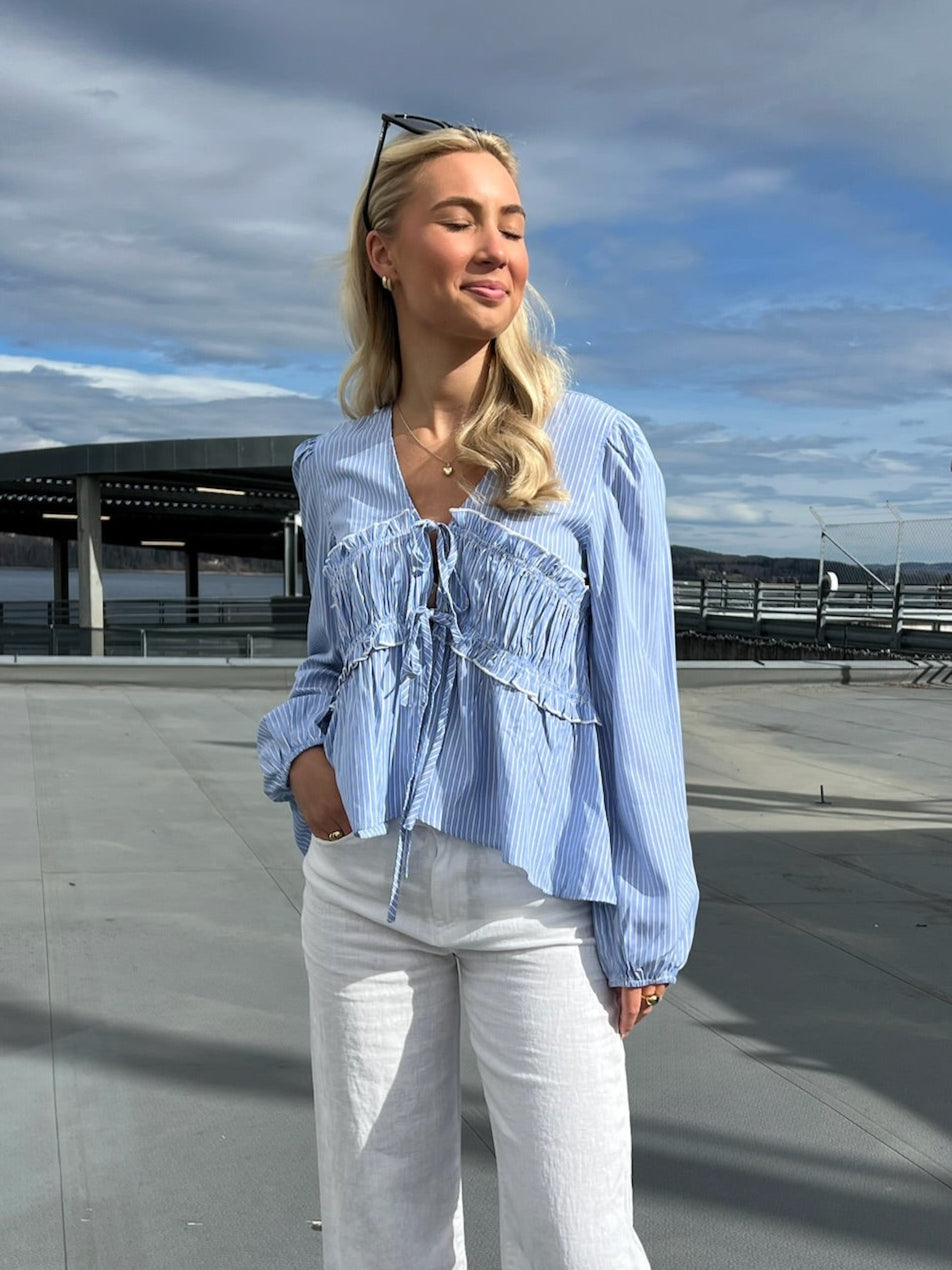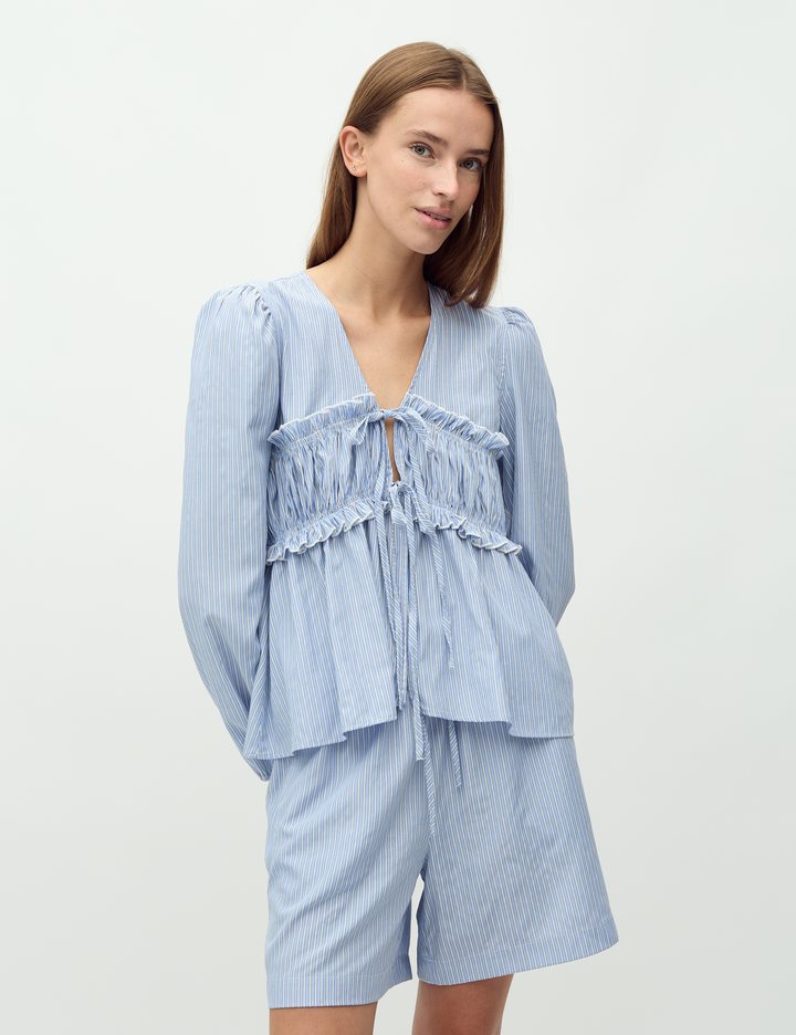 Pipa-M Zinnia Blouse fra MbyM er en feminin bluse med knyting foran. Blusen har V-hals og strikk på ermene, og en løs passform.