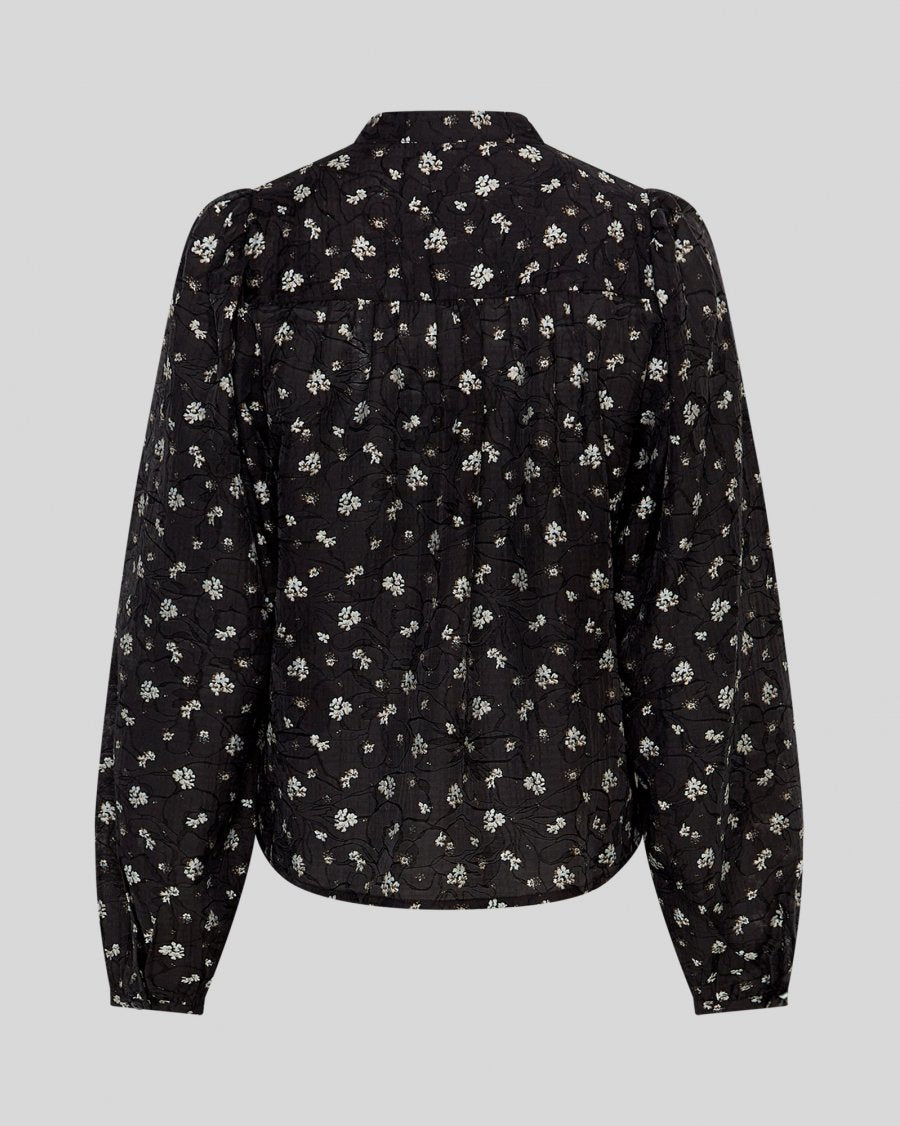 Nancy Shirt fra MSCH Copenhagen er en lett bluse med romantiske detaljer. Den har en subtil mandarin-krage, lange voluminøse ermer og et delikat rødt blomsterprint på en sort, semitransparent base. De markerte skuldrene og skjulte knappestolpen gir et raffinert uttrykk, mens den lette kvaliteten tilfører både eleganse og komfort. Perfekt til både hverdag og fest.