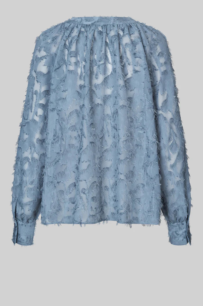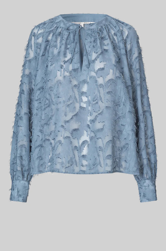 Carey Blouse fra Second Female er en nydelig bluse med struktur. Laget i lett, gjennomsiktig stoff med teksturert mønster. Blusen har en liten krage og åpen hals med knytefeste, og voluminøse raglanermer.