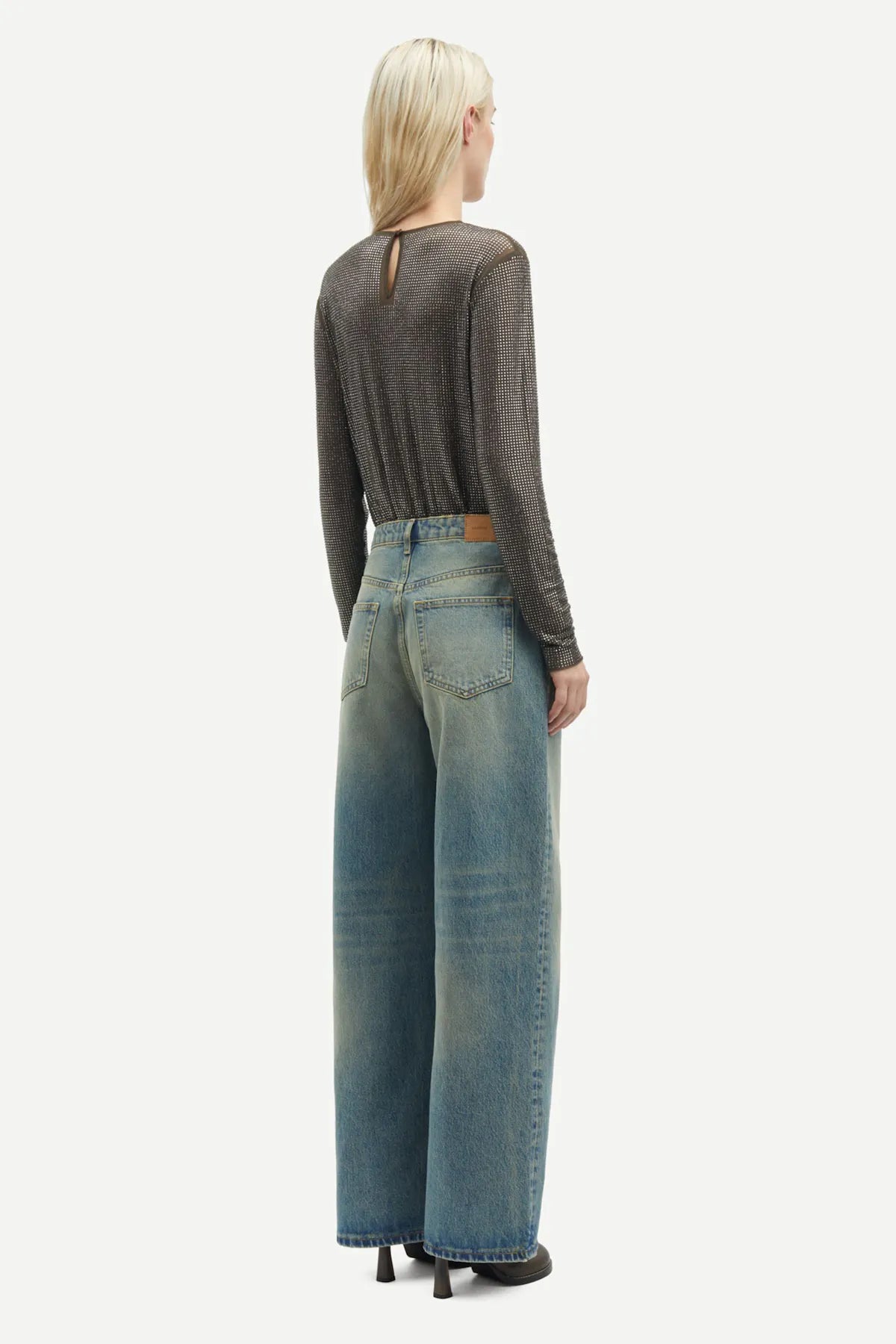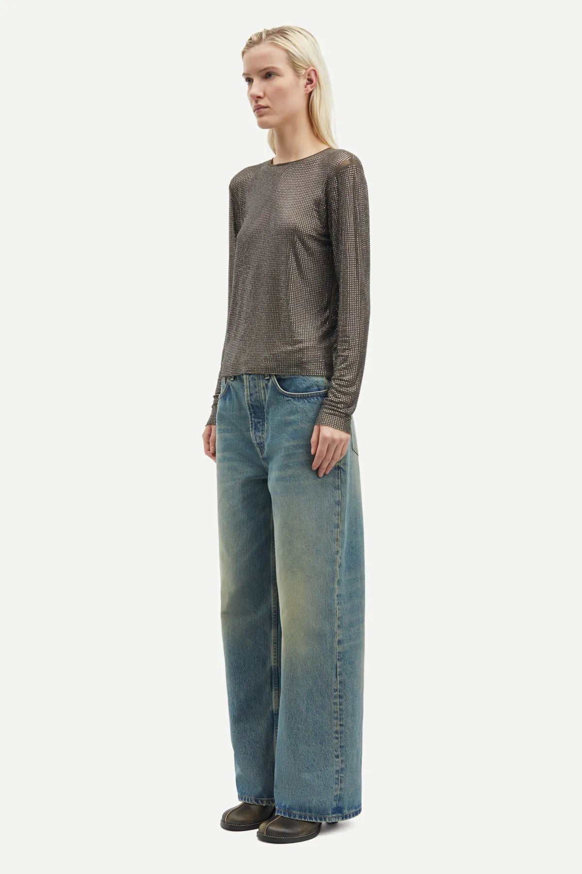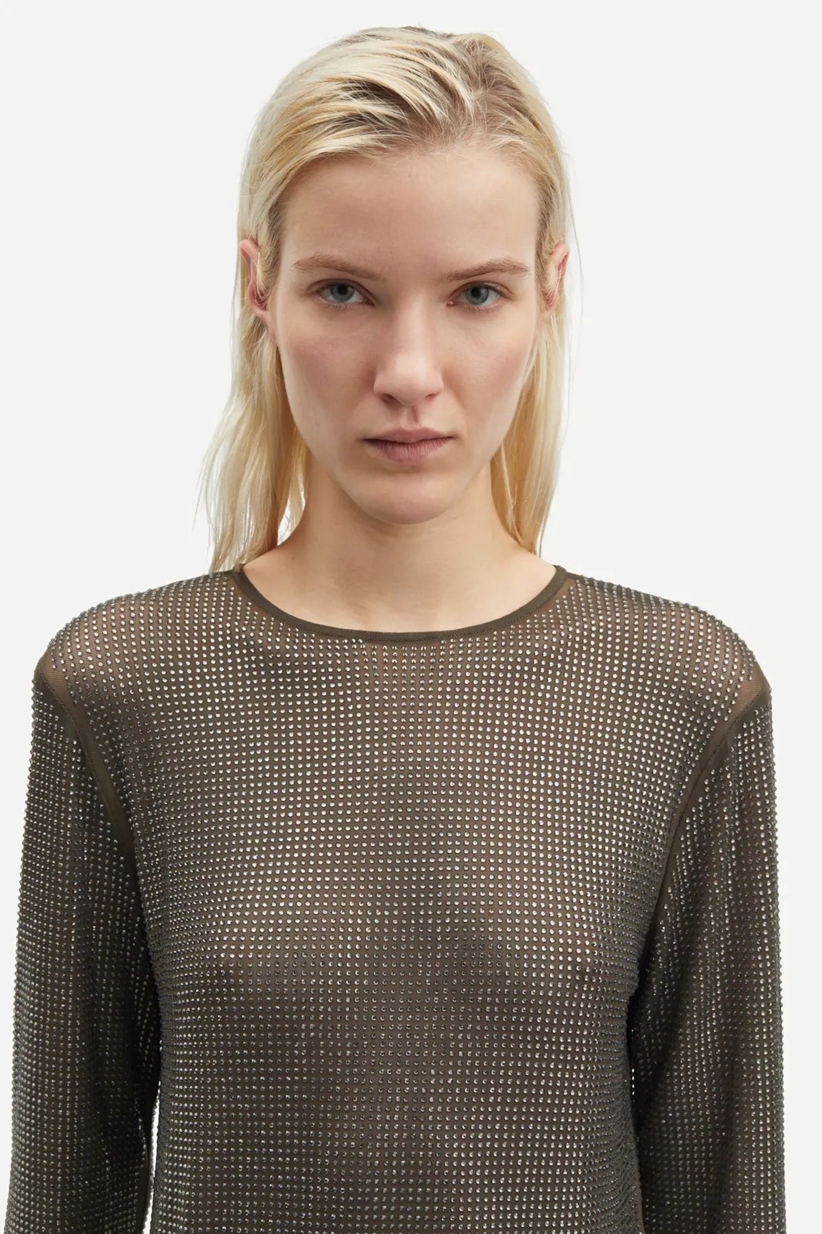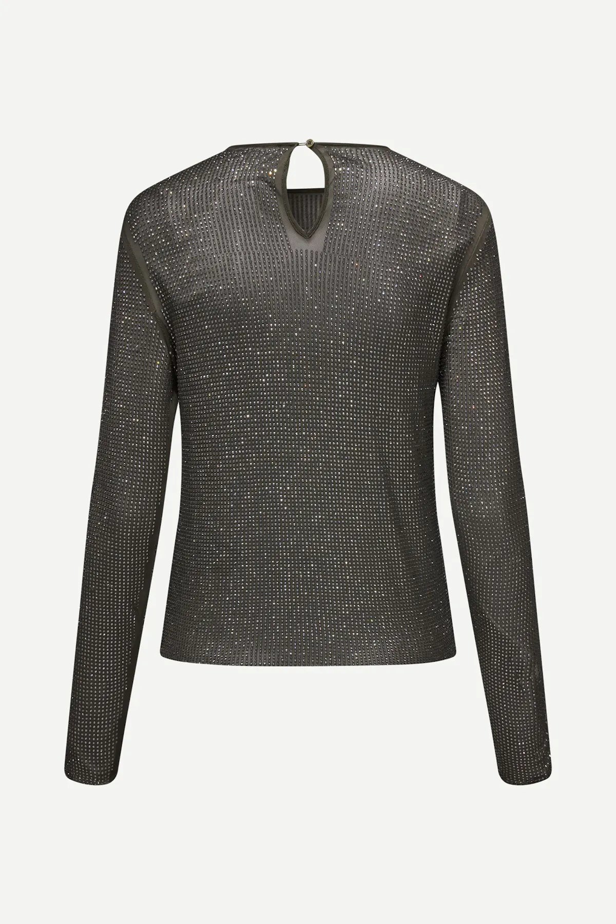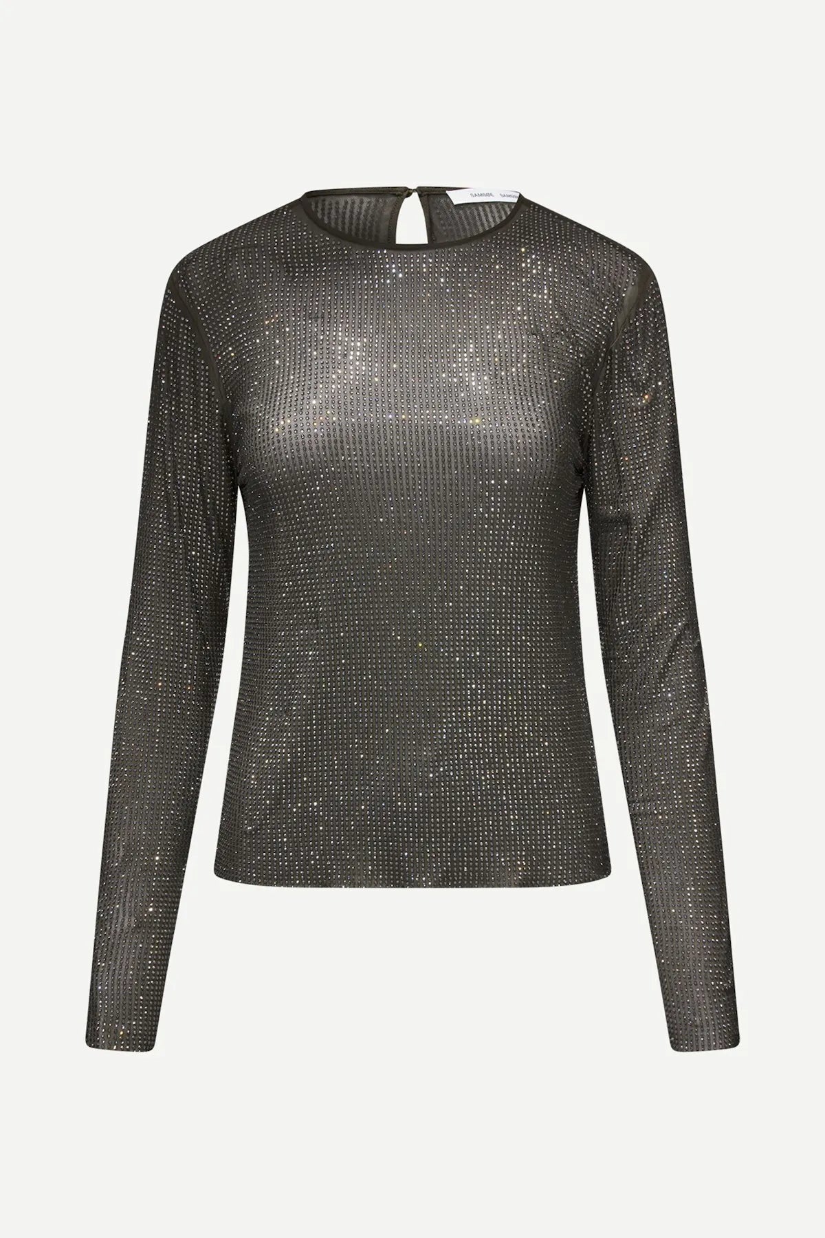 Samagda Top fra Samsøe Samsøe er en lett gjennomskinnelig topp med lange ermer. Toppen er dekt med glitrende krystaller. Lukkes med knapp i nakken.