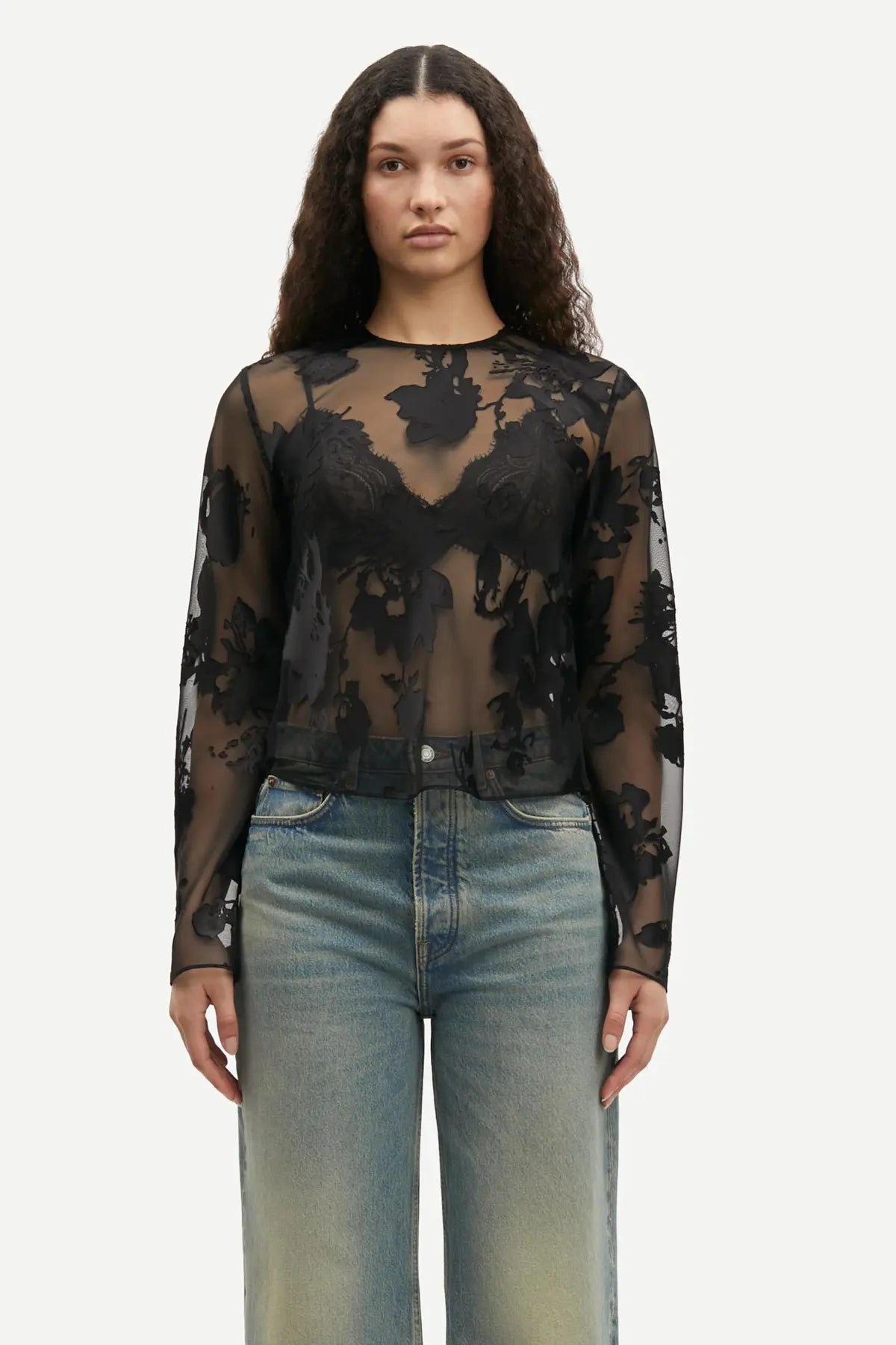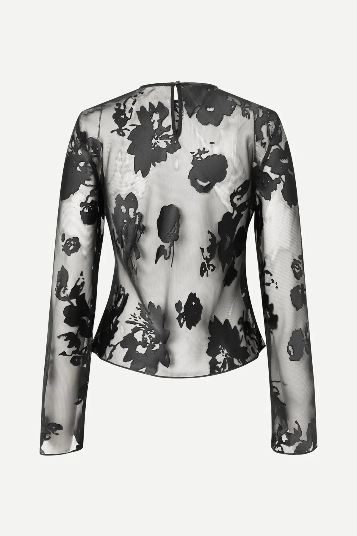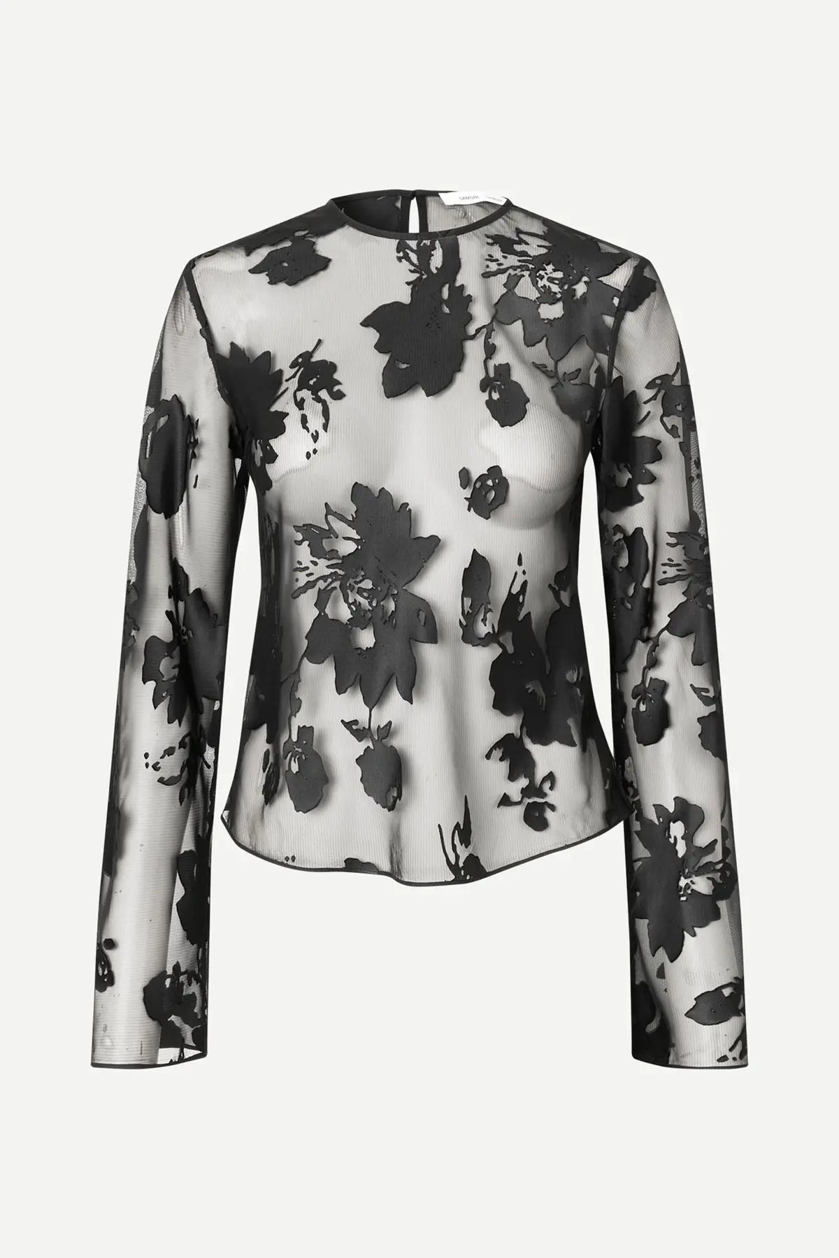 Samadda Bluse fra Samsøe Samsøe er en stilig gjennomskinnelig bluse med svart blomstermønster. Blusen har normal passform og lukkes med knapp i nakken.