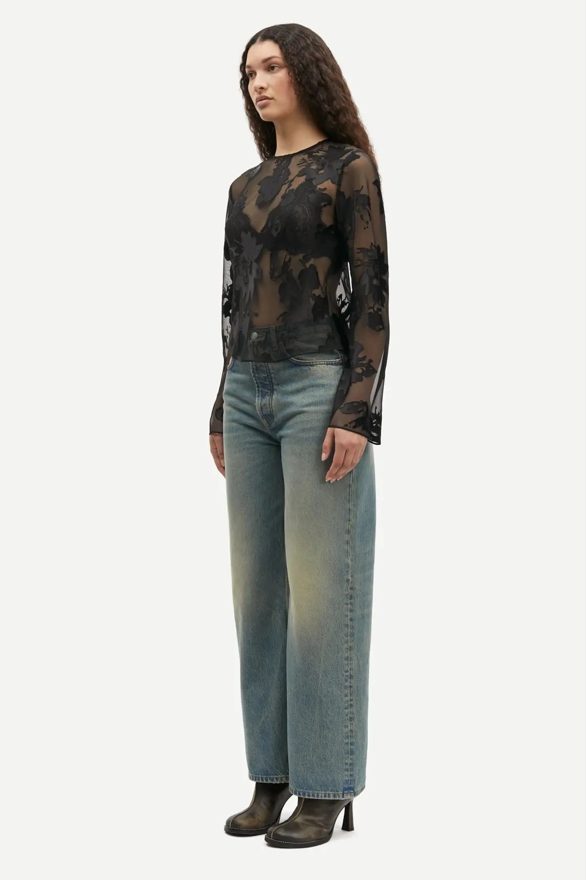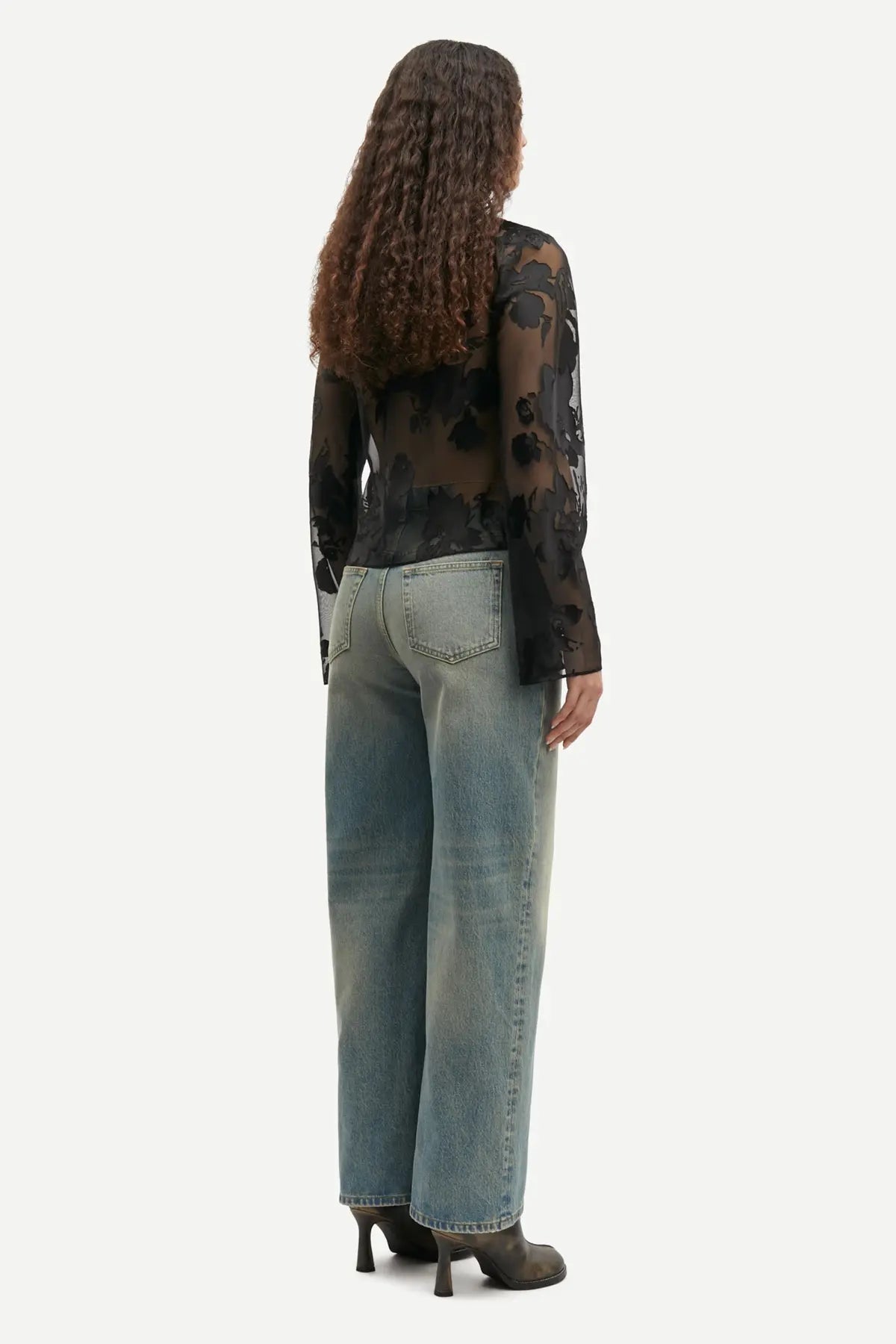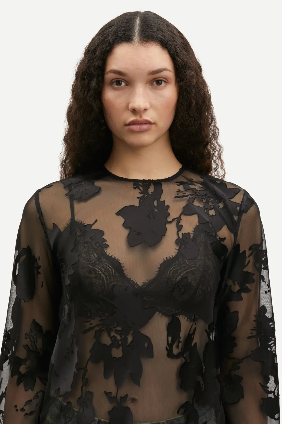Samadda Bluse fra Samsøe Samsøe er en stilig gjennomskinnelig bluse med svart blomstermønster. Blusen har normal passform og lukkes med knapp i nakken.