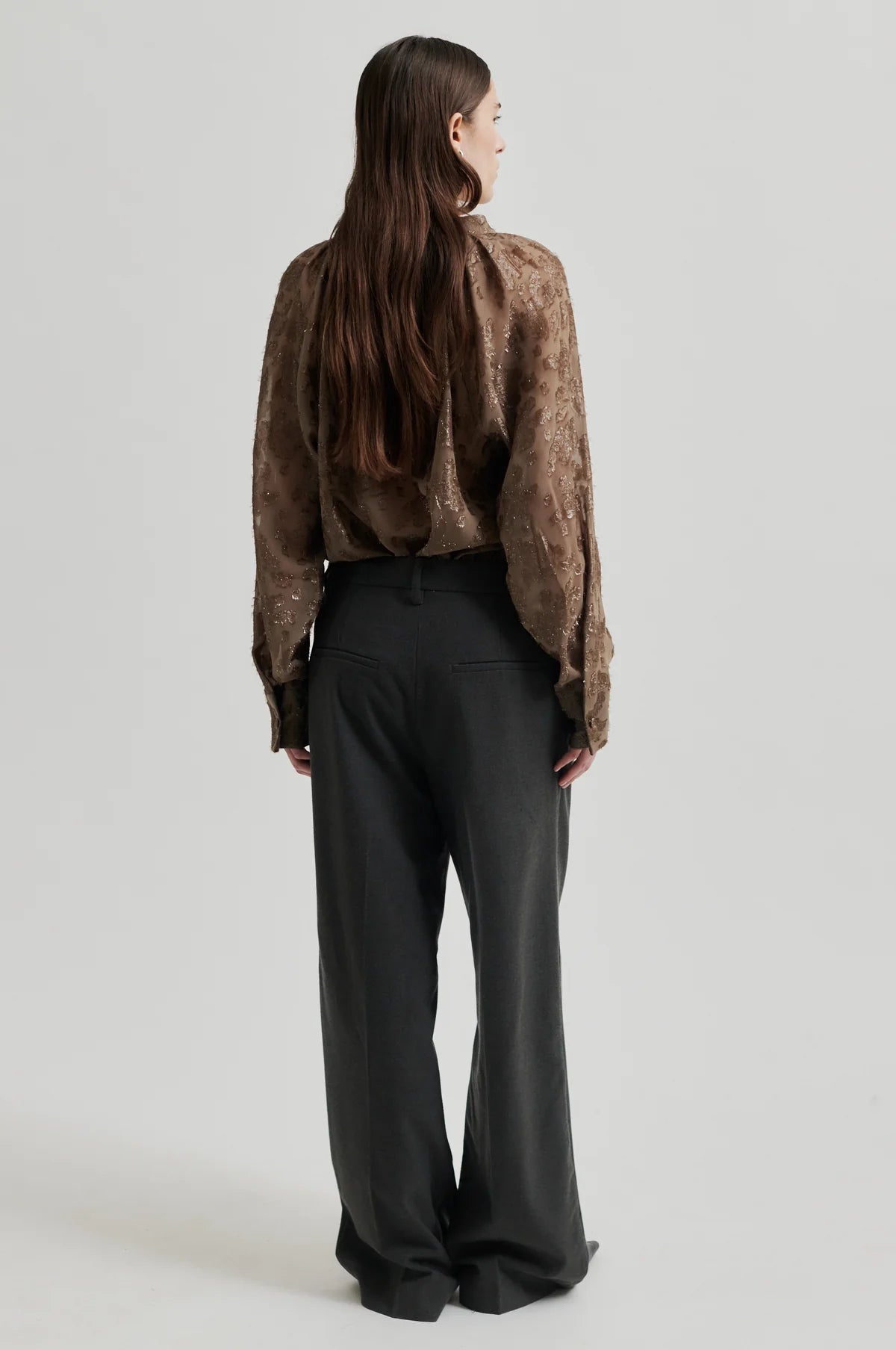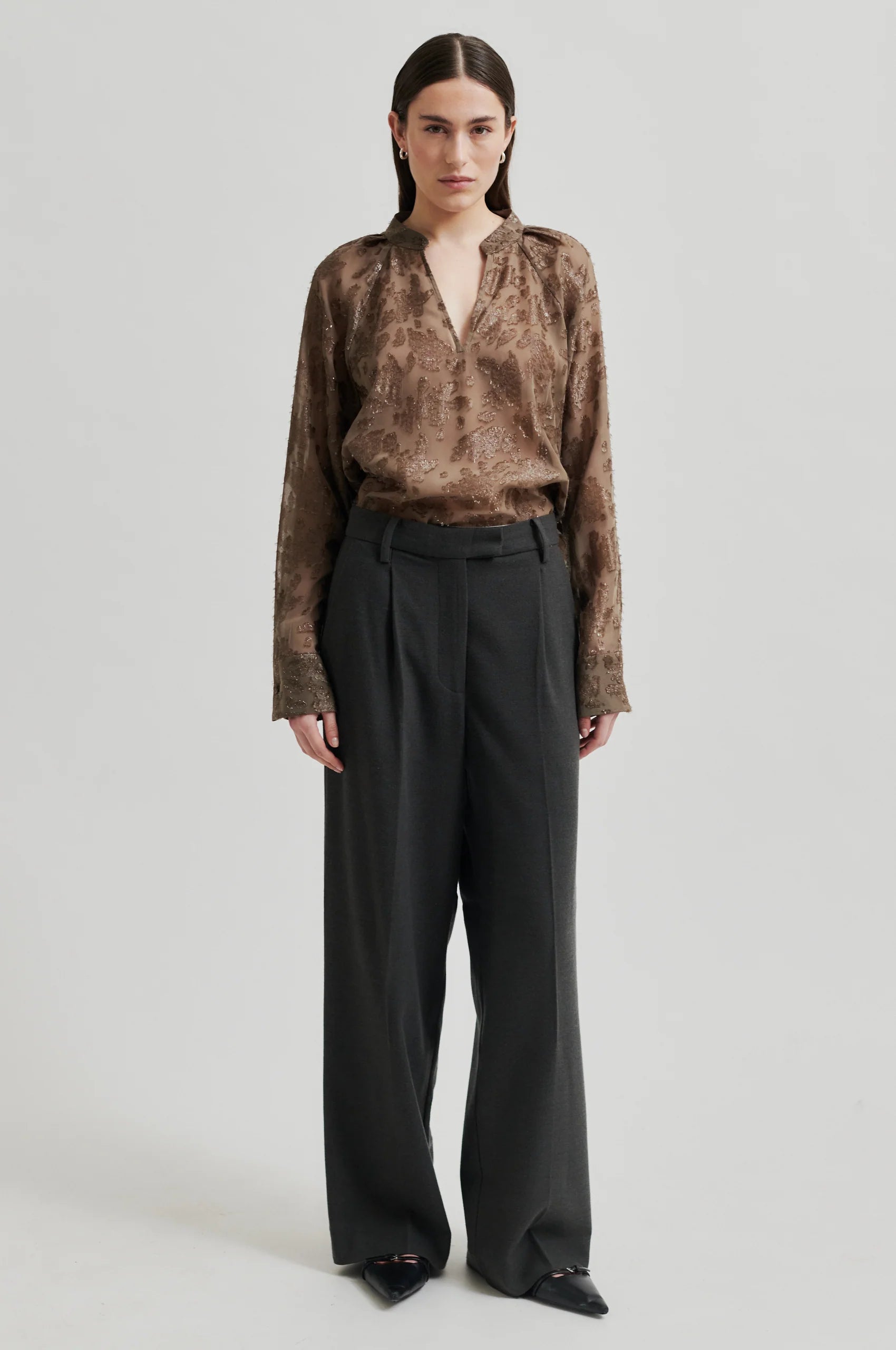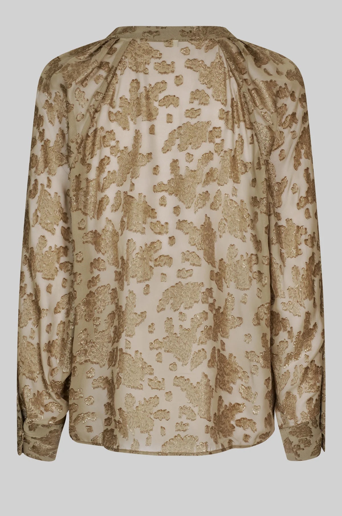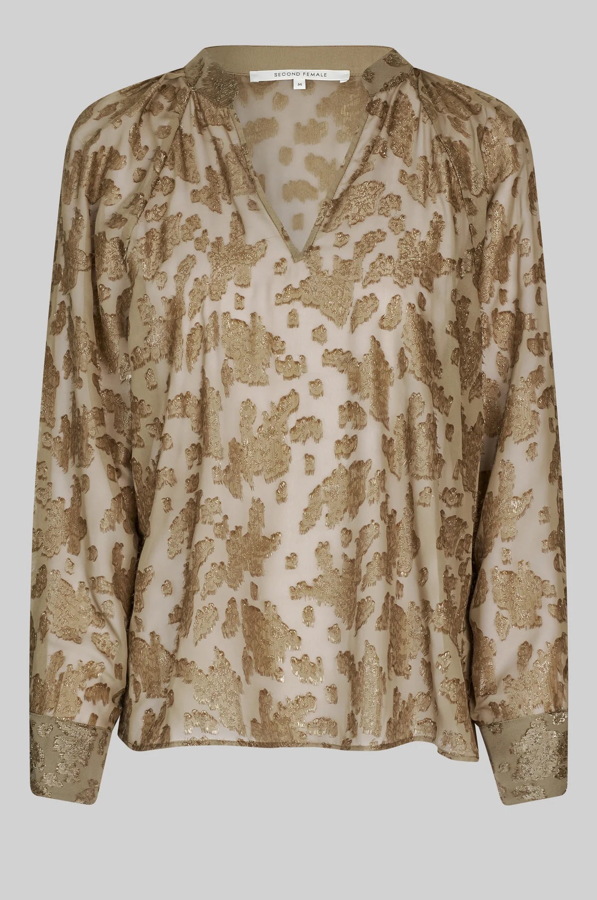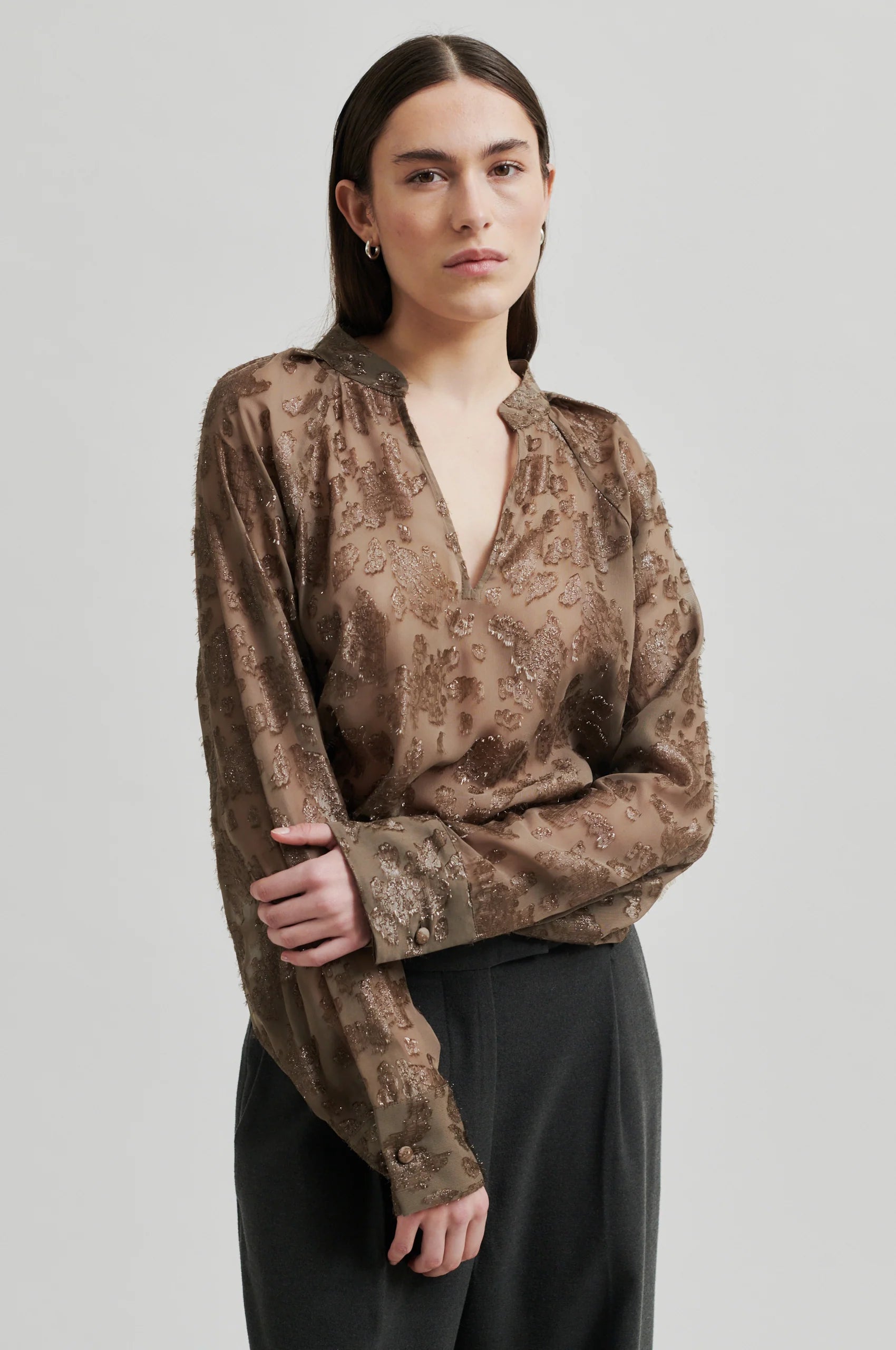 Carisa er en teksturert bluse fra Second Female som er laget av lett, semitransparent stoff med et glitrende, teksturert mønster. Blusen har en liten ståkrage og åpen halslinje, med fine rynker rundt halsen som skaper ekstra volum. Den har raglanermer med skjortemansjetter og knappelukking, noe som gir et klassisk preg. Den løse og flytende silhuetten gjør denne blusen til et perfekt valg for en elegant og moderne stil.