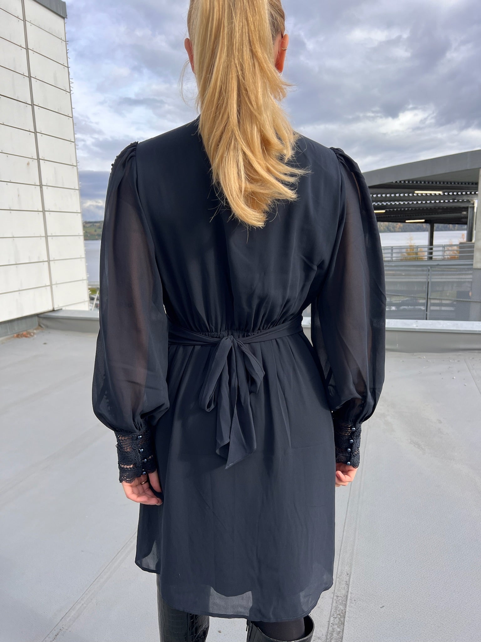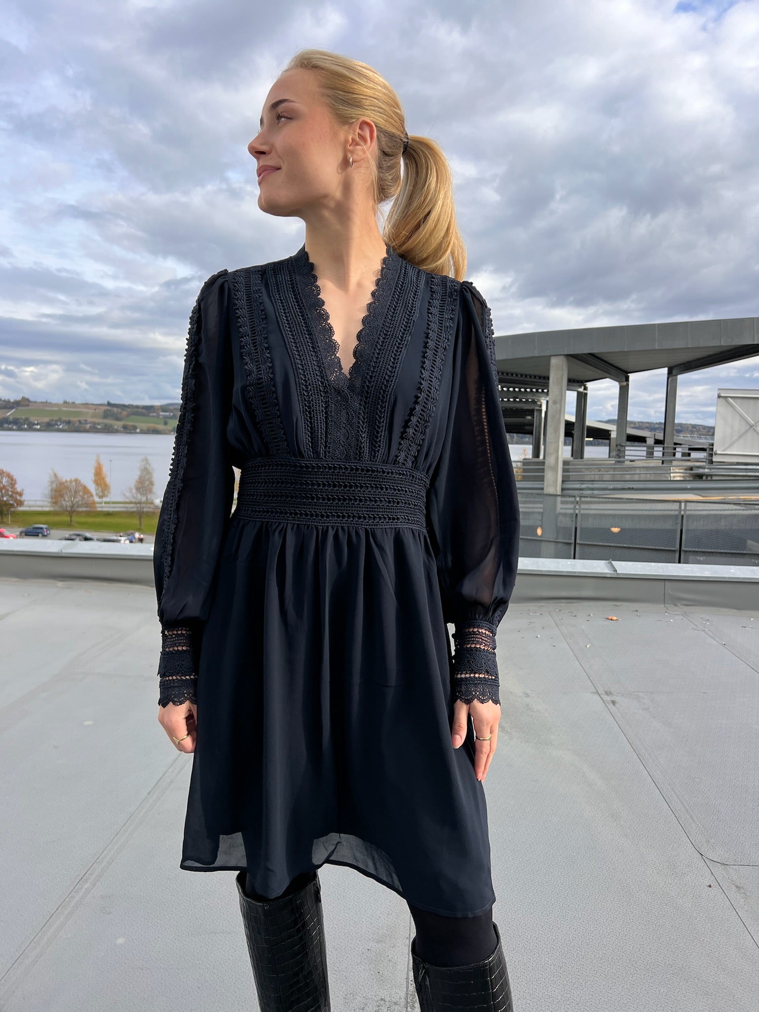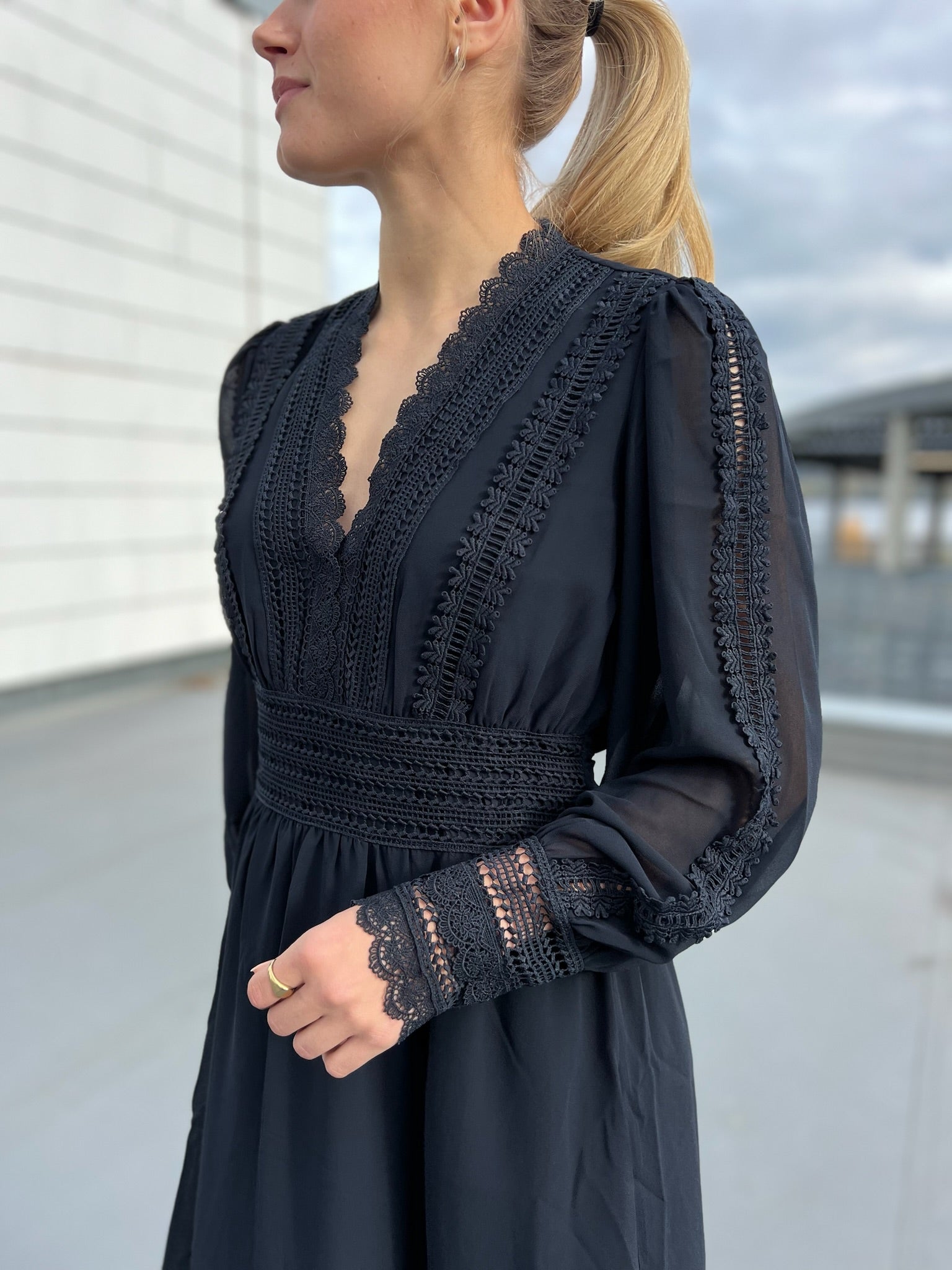LotusGo Dress fra Gossia er en knelang kjole med vakre blonder og broderidetaljer. Kjolen har V-hals som er innrammet av dekorative blonder som også går nedover toppen av kjolen. Ermene er lange og har matchende blondepynt ved mansjettene, som gir en romantisk og elegant touch. Stoffet er lett og flytende, noe som er med på å gi kjolen et elegant fall. Kjolen har knyting i midjen med sløyfen bak og kan strammes inn etter ønsket passform.