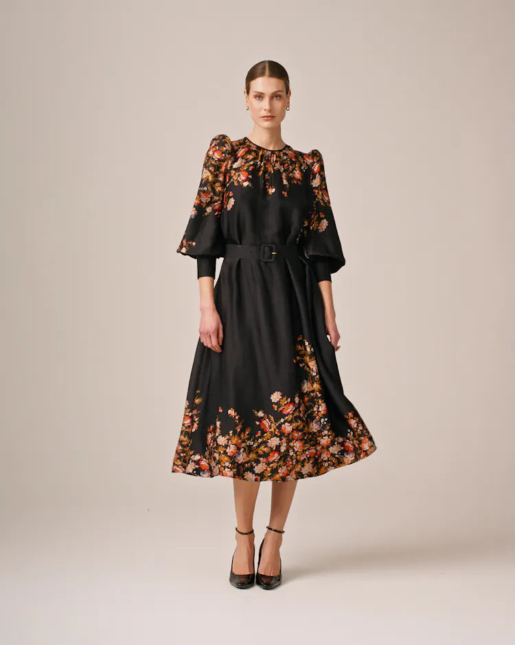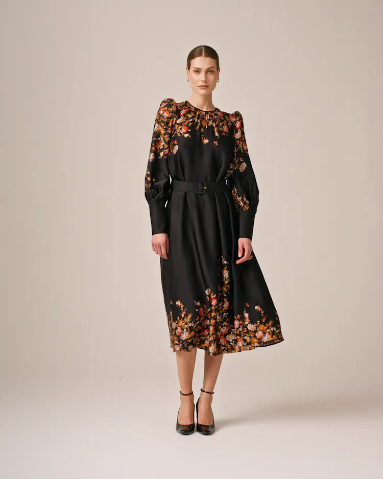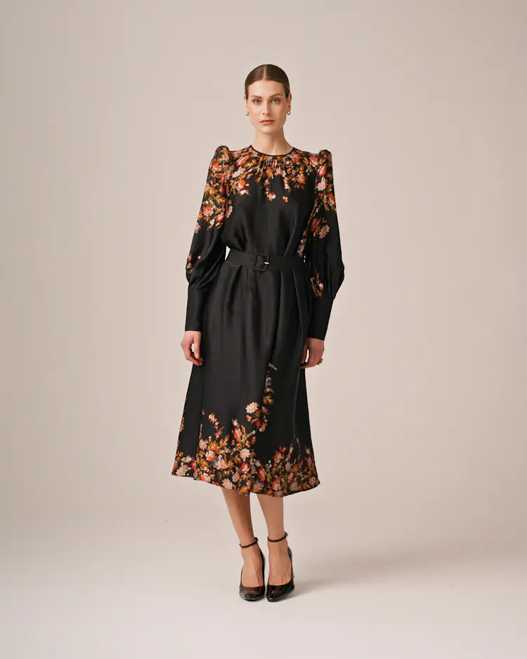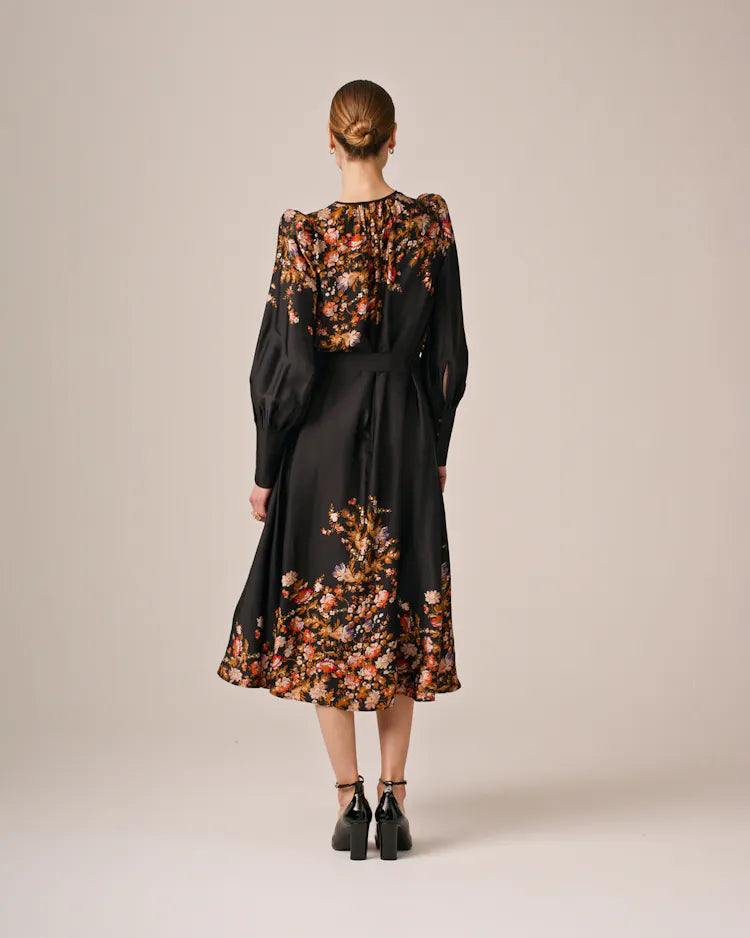 Satin Midi Dress fra byTiMo er laget i elegant og luksuriøs viskosekvalitet. Kjolen har midi-lengde, avslappet silhuett, rund krage og lange, voluminøse ermer med stramme mansjetter. Skuldrene er puffede og polstrede. Den kommer med et løst, matchende belte. Kjolen lukkes bak med glidelås.