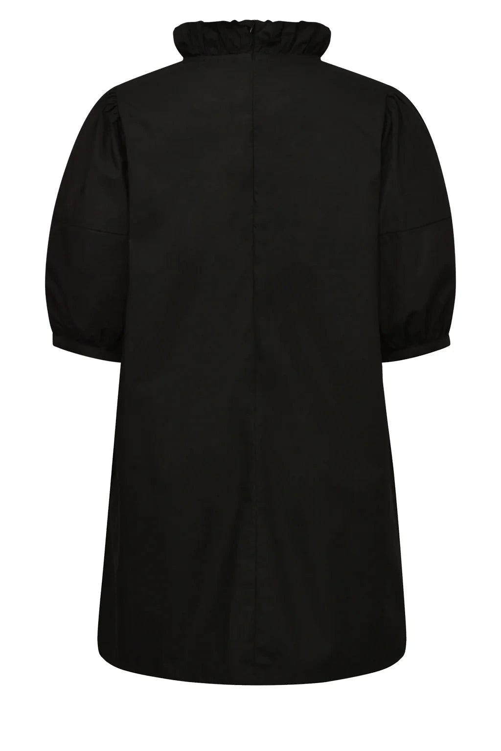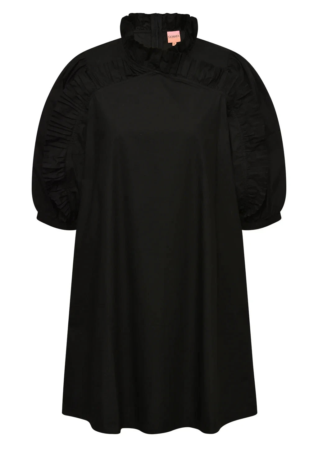 MilleGO Dress fra Gossia er en vakker kjole i myk og deilig bomullspoplin. Kjolen har en kort lengde, løstsittende fasong, med smale skuldre, og puffede albuelange ermer. Kjolen har vakre volang-detaljer i halsen som fortsetter inn i ermet.
