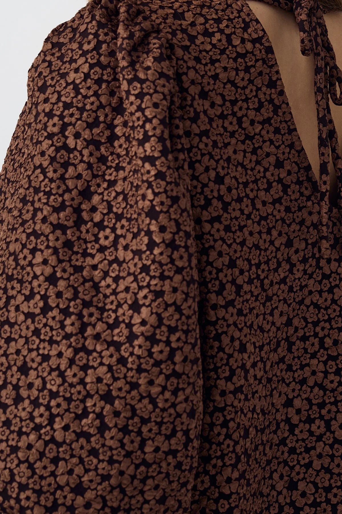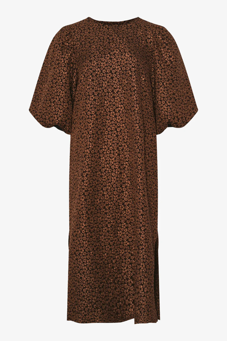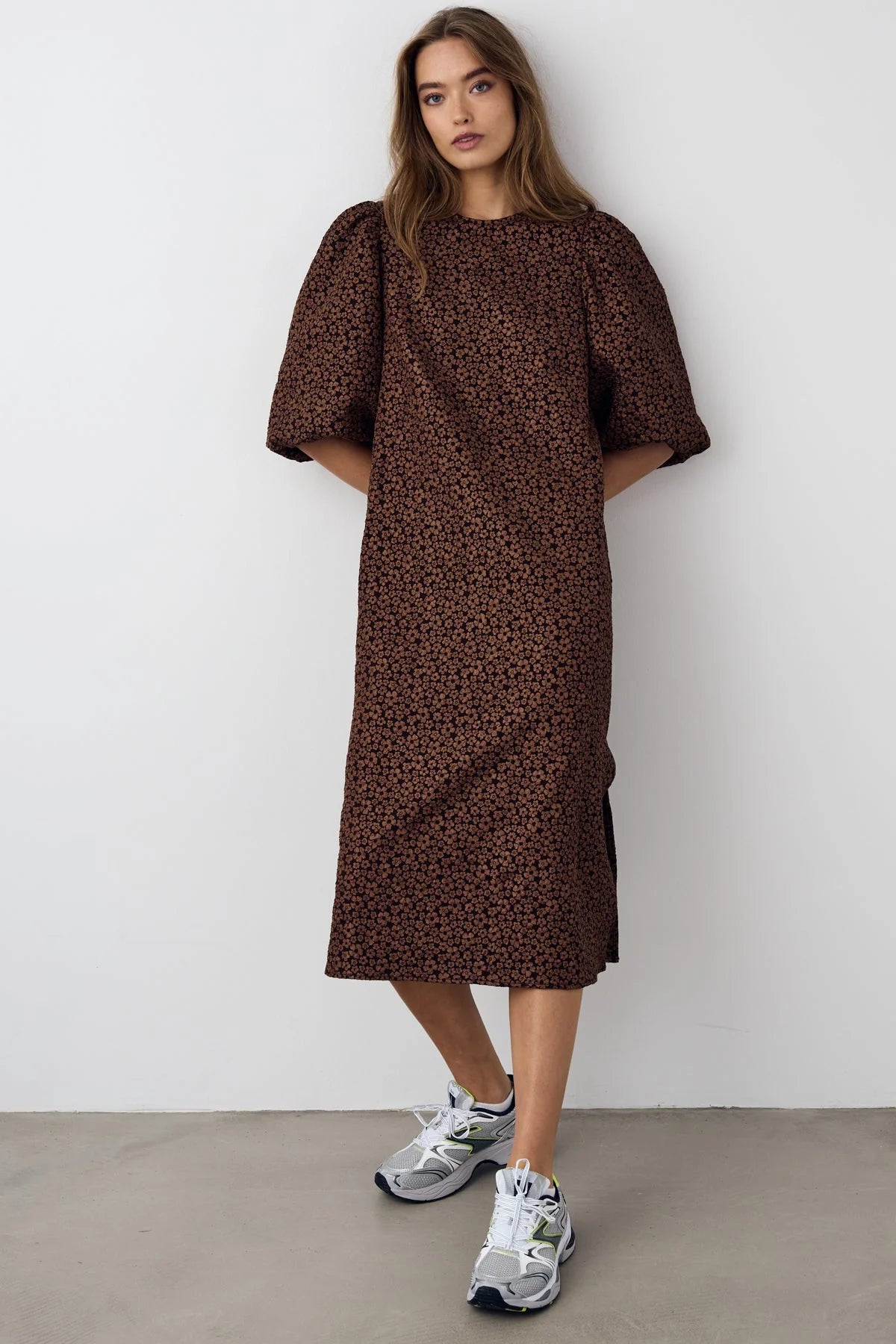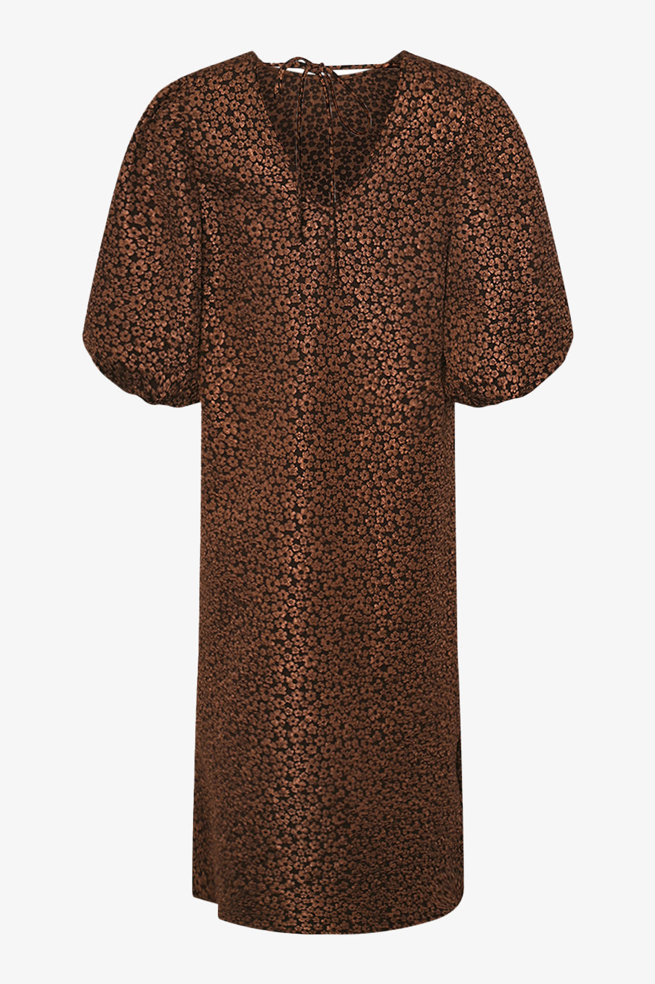 Reno Pastis Long Dress fra Noella er en brunfarget midikjole. Kjolen har puffermer og løs passform med A - snitt. Kjolen har et småblomstret print i brunt med knyting i nakken og V utringing i ryggen.