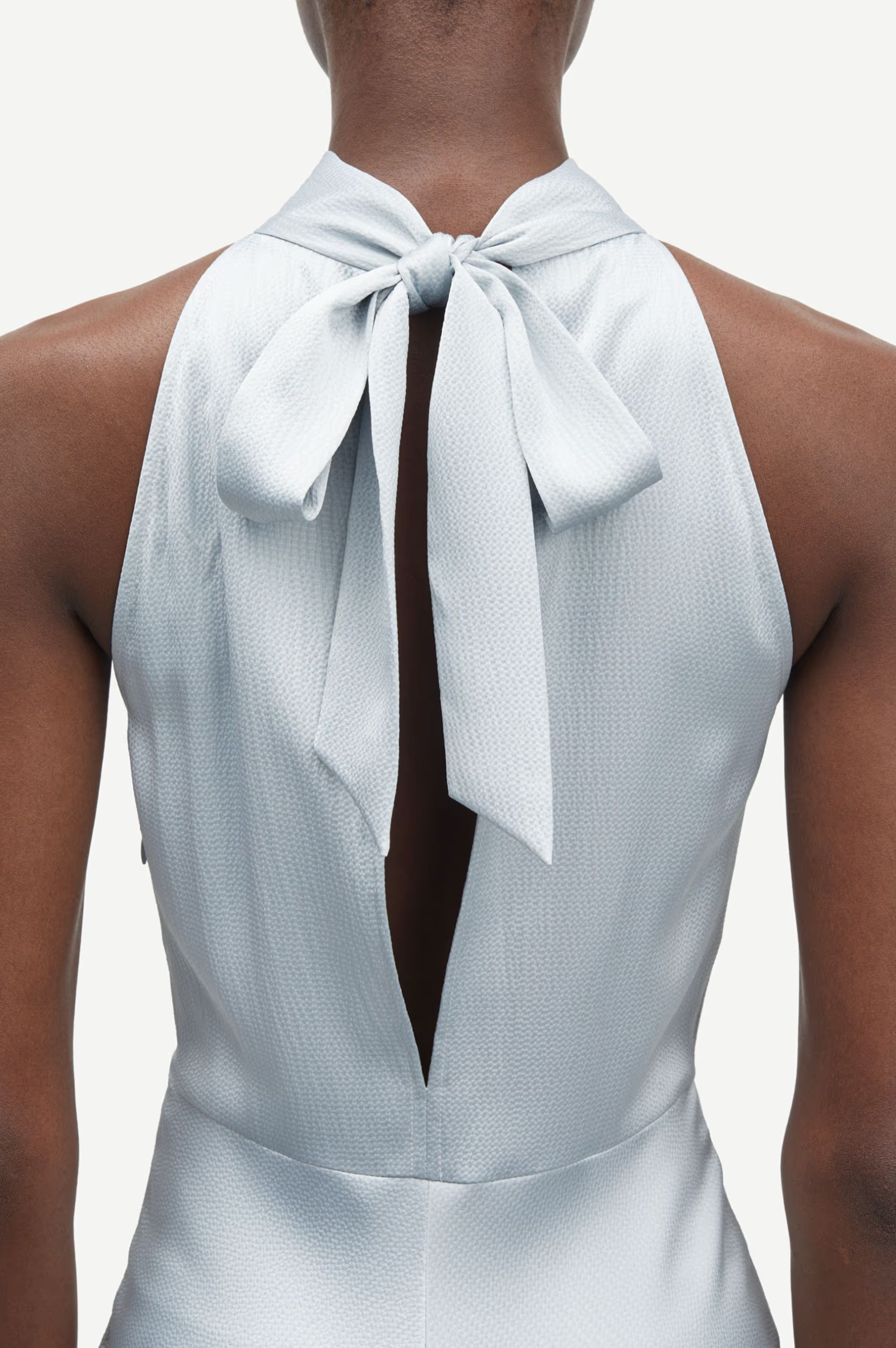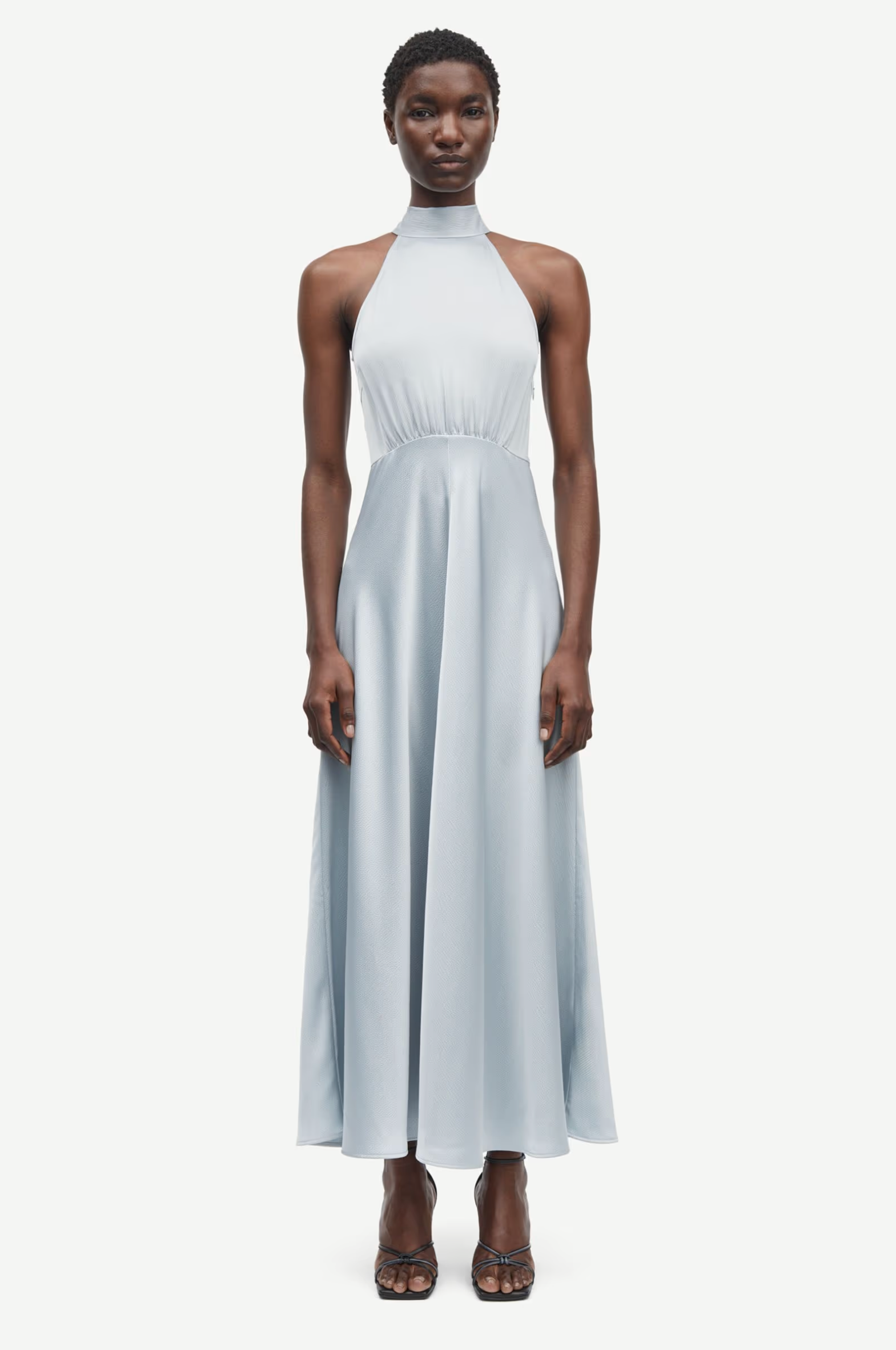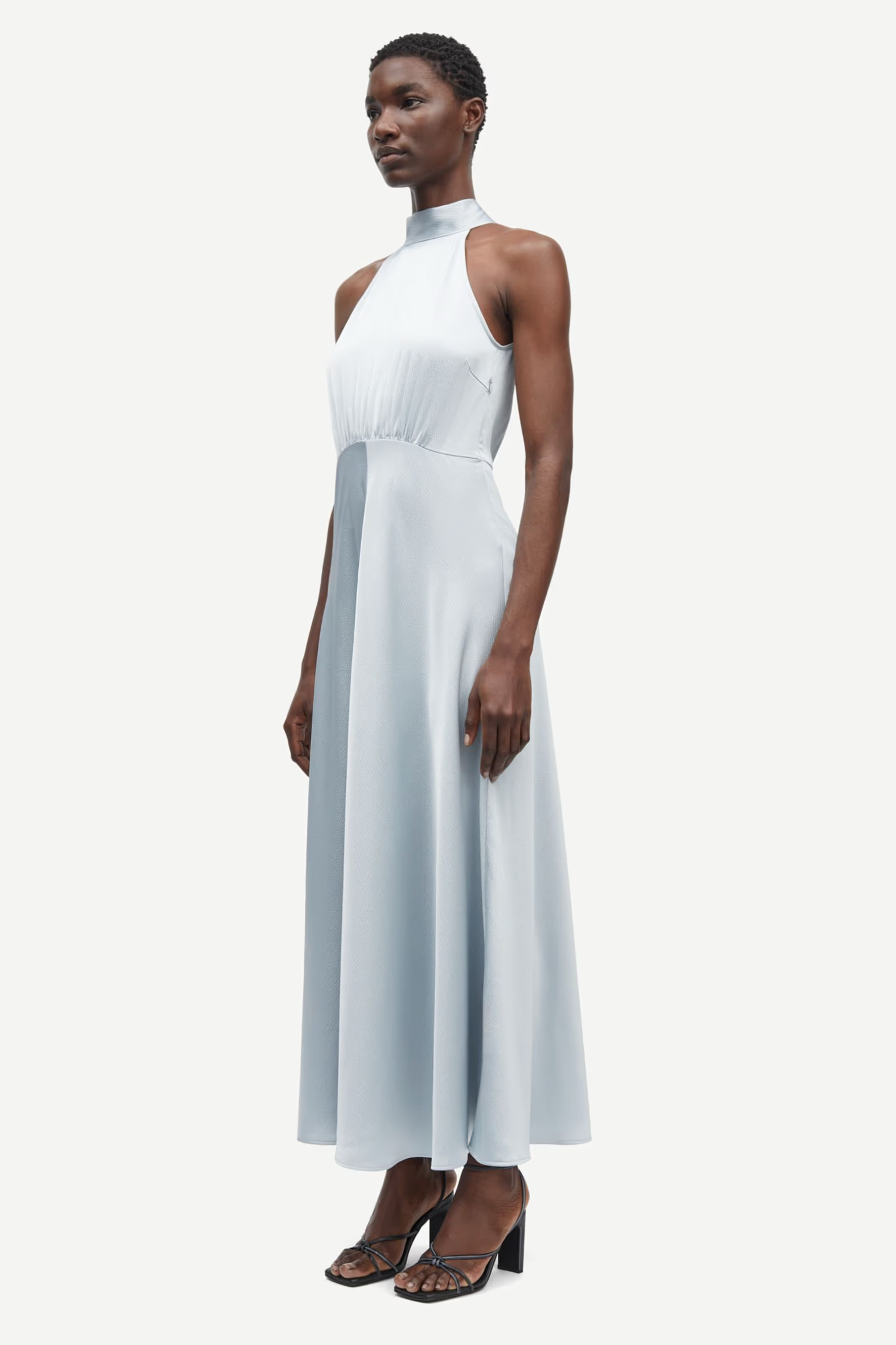 Rheo Dress er en ermeløs midikjole i sateng fra Samsøe Samsøe med normal passform og utsvingt skjørt. Selvknytende lukking bak og glidelås på siden. Delt åpning bak. Hovedmateriale laget av en elastisk blanding med resirkulert polyester. Dette produktet er GRS-sertifisert. Hvert trinn i forsyningskjeden har møtt strenge sosiale, miljømessige og kjemiske krav.