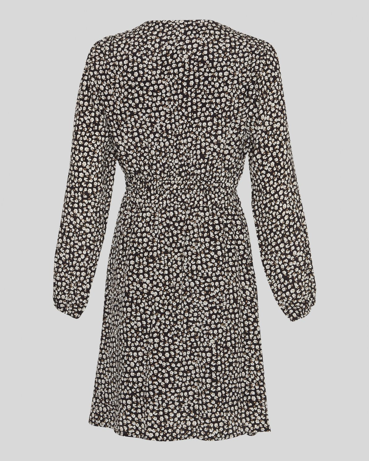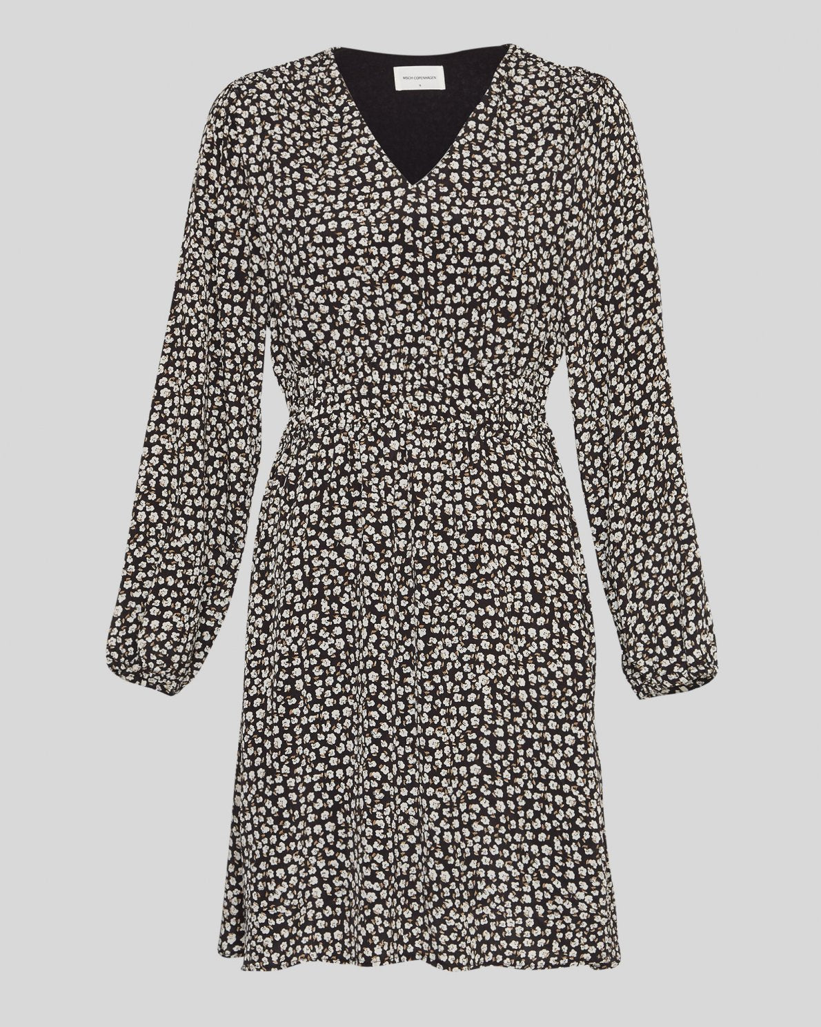 Zeida Rhian er en kort blomstrete kjole fra MSCH Copenhagen. Kjolen har V-hals, lange ermer med smale elastiske mansjetter og elastisk liv. Kjolen er svart med små hvite blomster, en flott balanse mellom feminine detaljer og mørke toner, perfekt for vinteren.