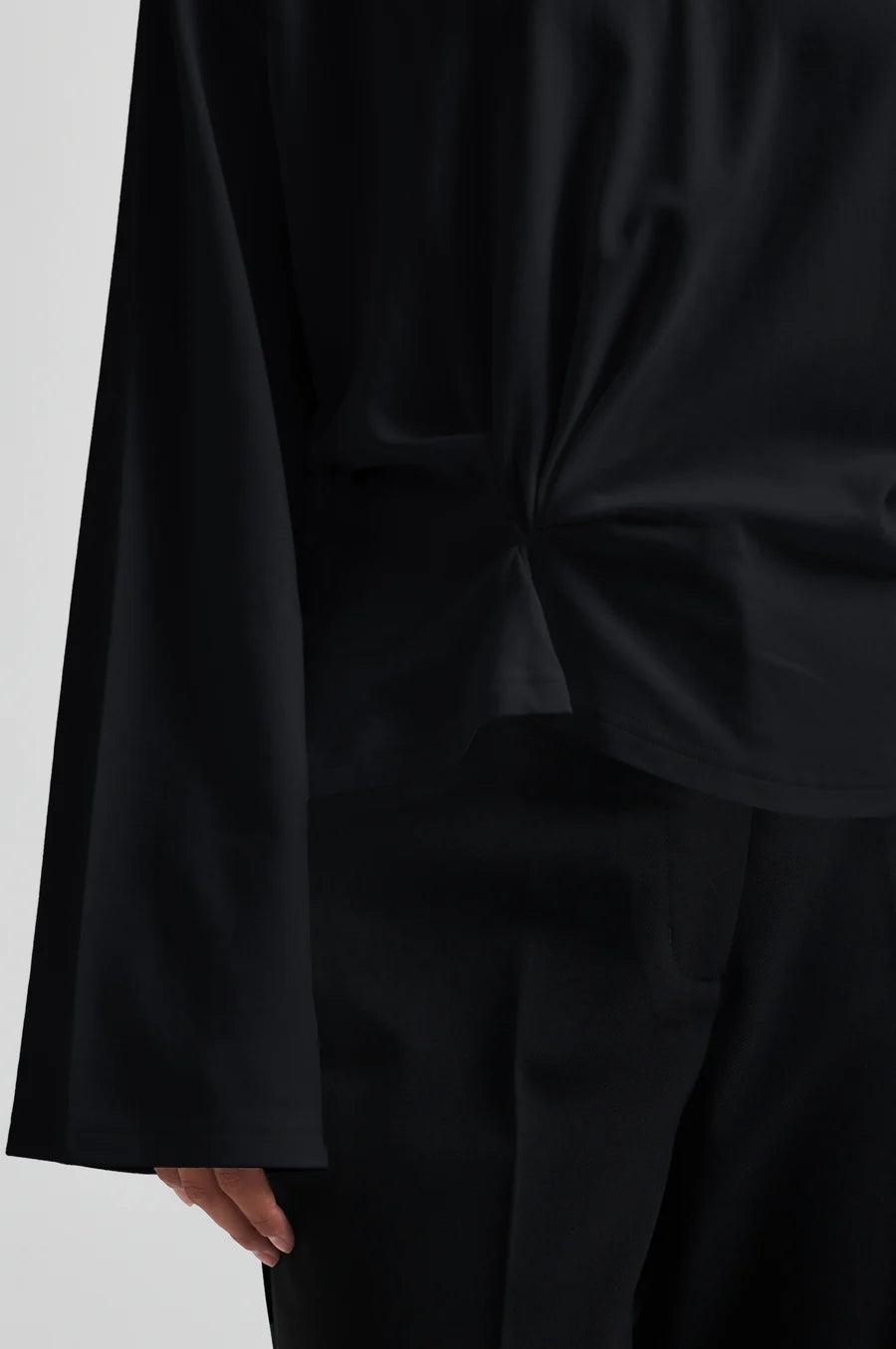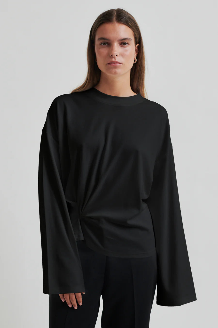 Missouri LS Tee fra Second Female er en langermet t-skjorte med rund hals og nedslitte skuldre med lange ermer. Samlet detalj foran som skaper drapert effekt. Avslappet passform øverst med mer tilpasset midje.