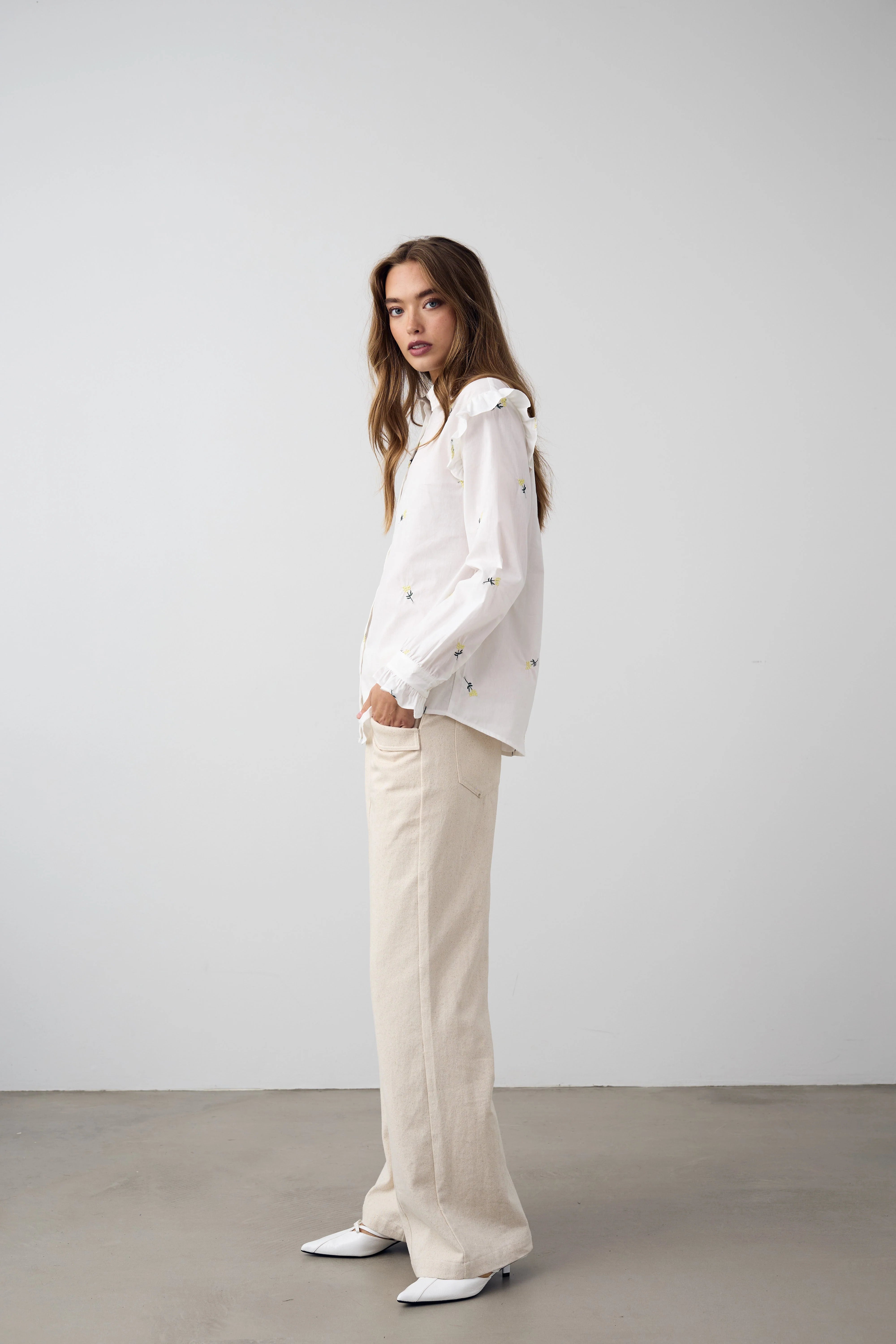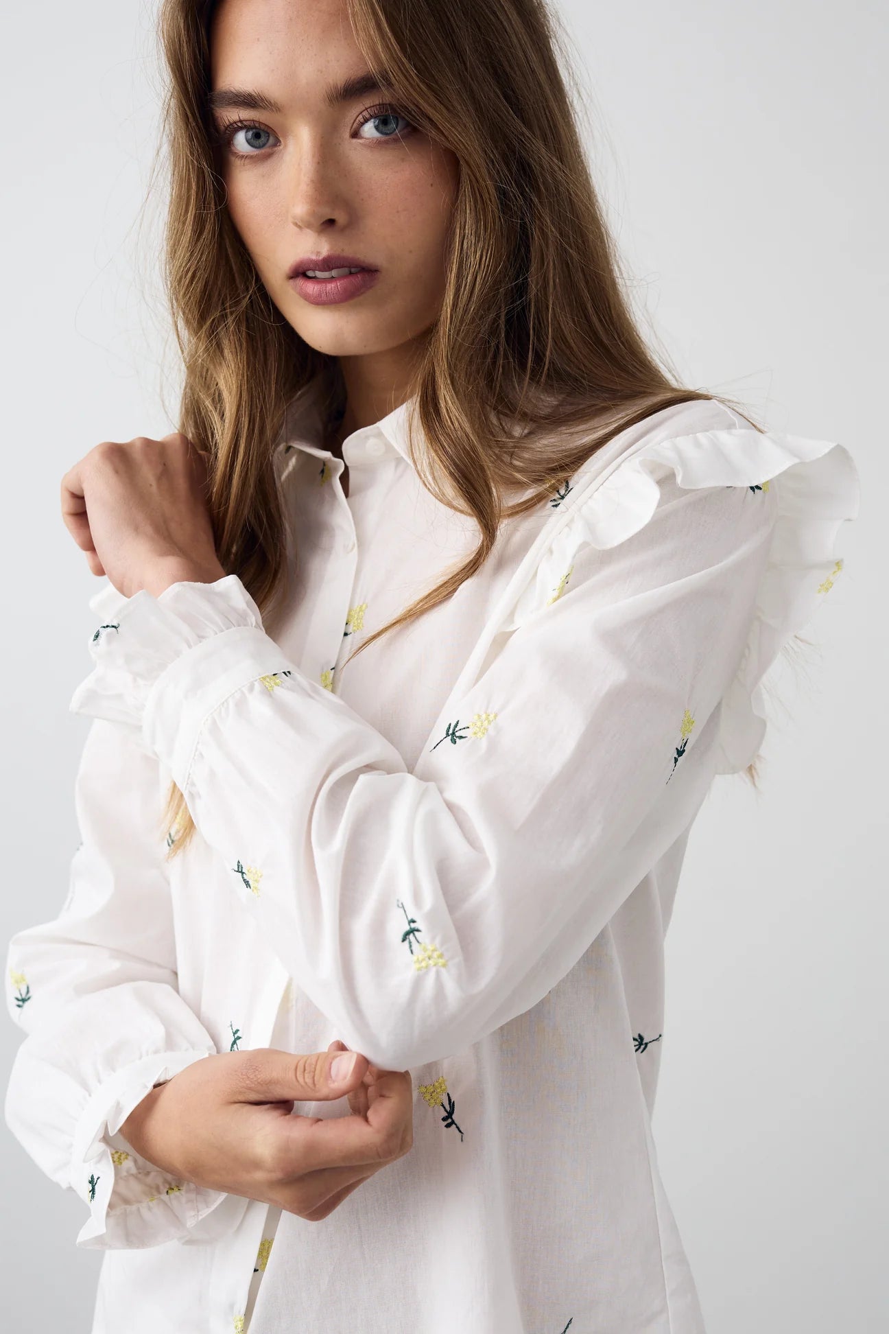 Kinisha Blouse fra Noella er en bluse med søte detaljer. Skjorten har volanger på skuldrene og nederst på ermene og broderte småblomster. Blusen har en klassisk passform med krage, knappestolpe og lange ermer. Den har en avtakbar sløyfe i halsen.