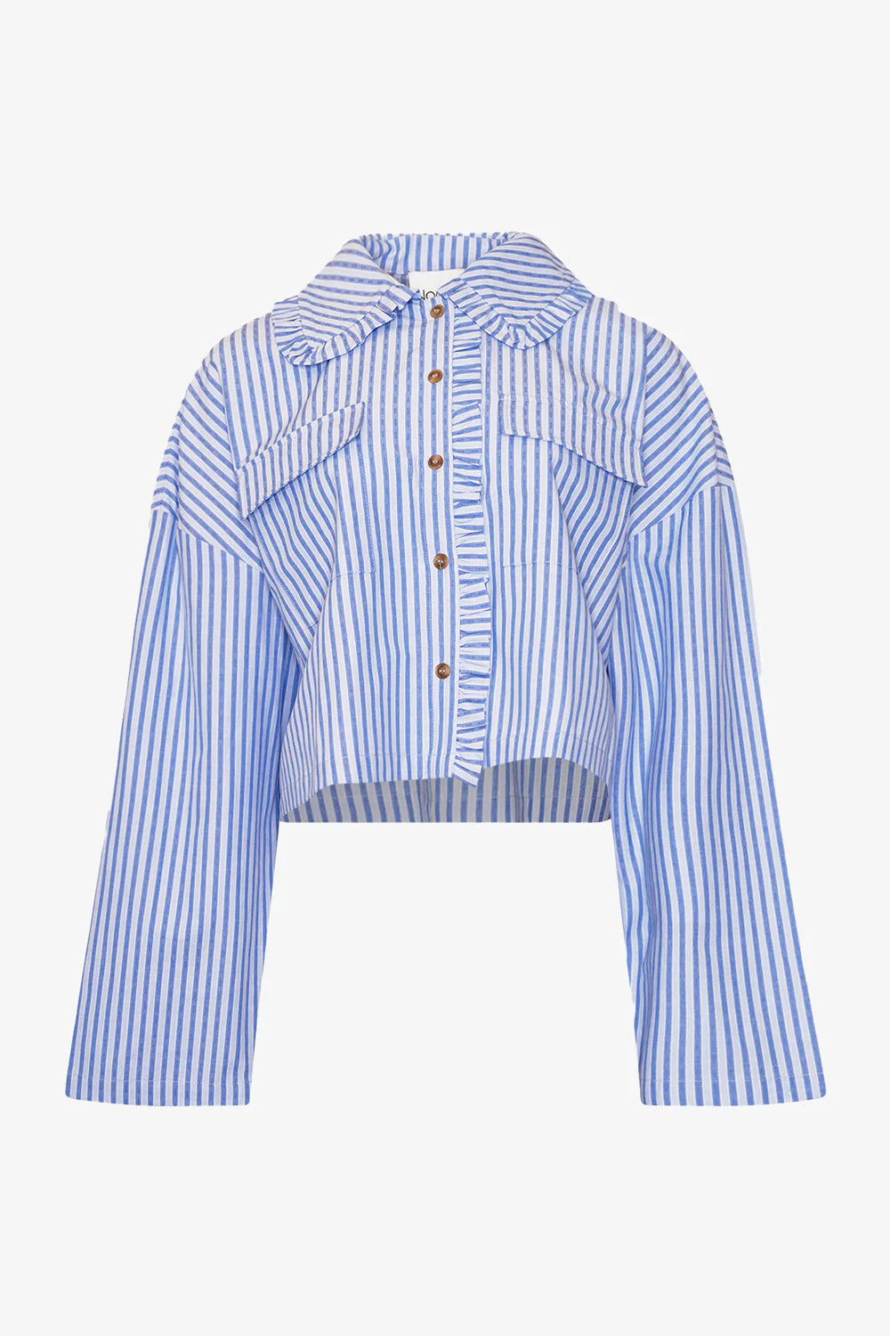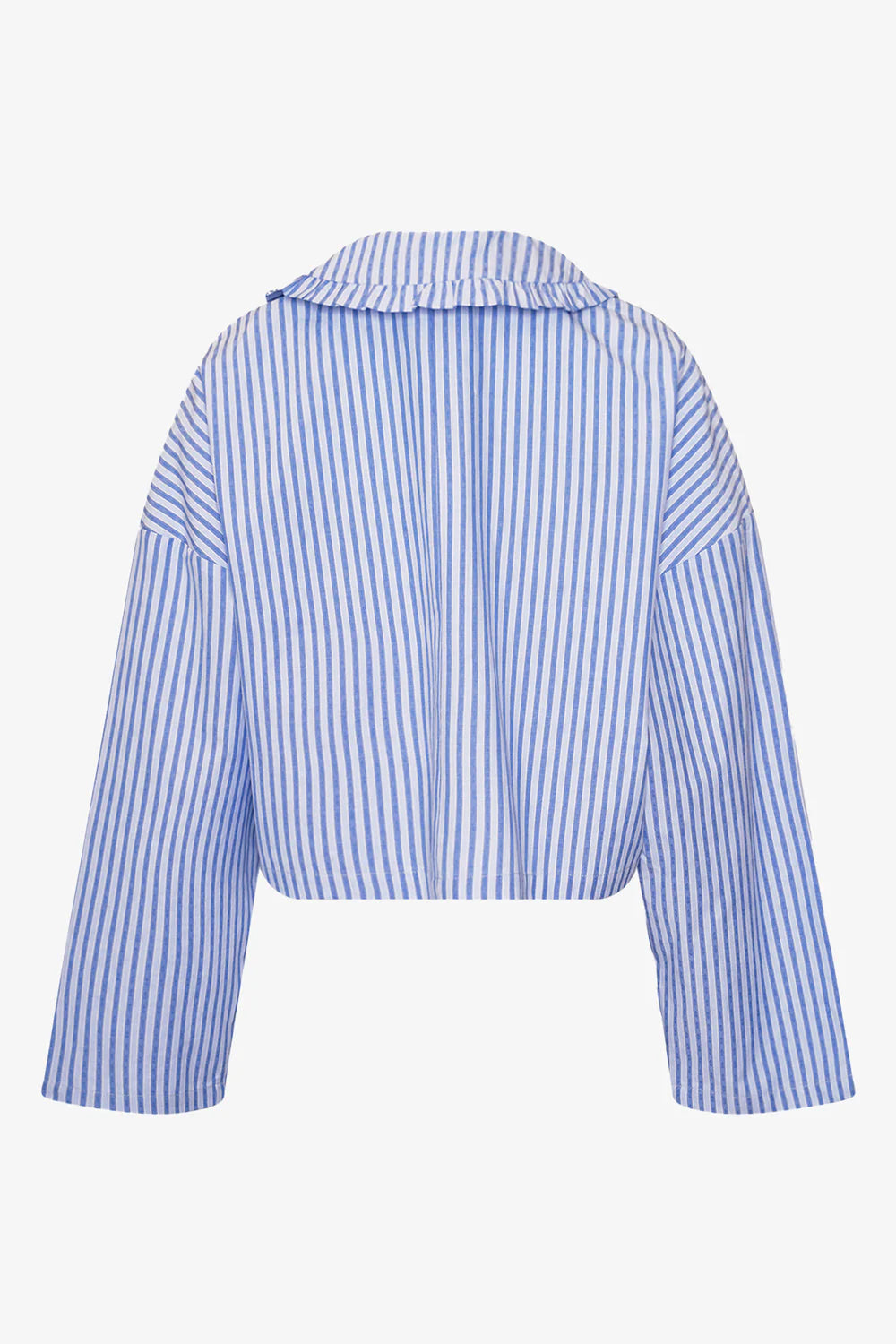 Kendyll Shirt fra Noella er en søt stripete skjorte med rette armer. Overdelen er kort i modellen og har volanger rundt kragen og knappestolpen.