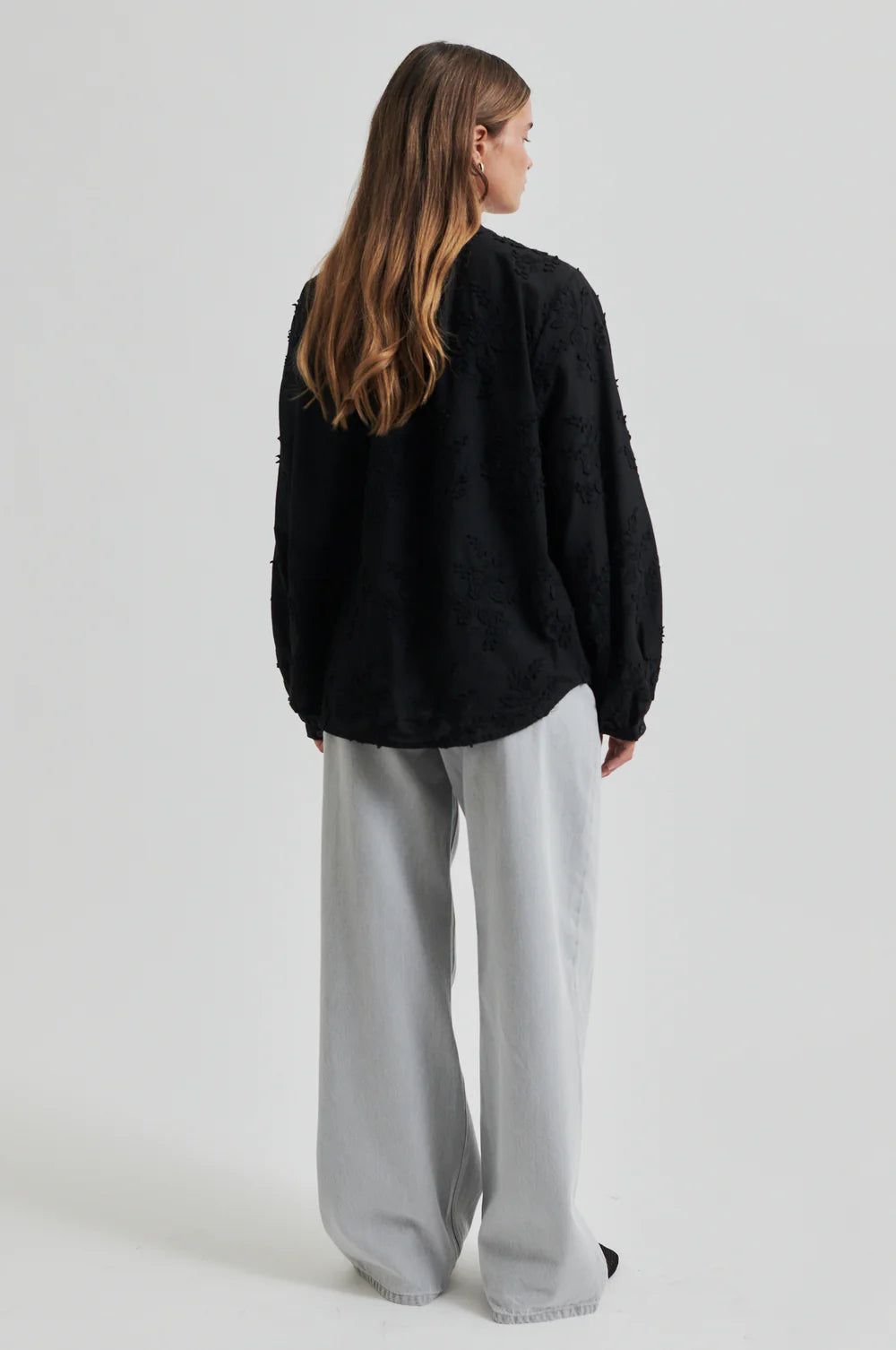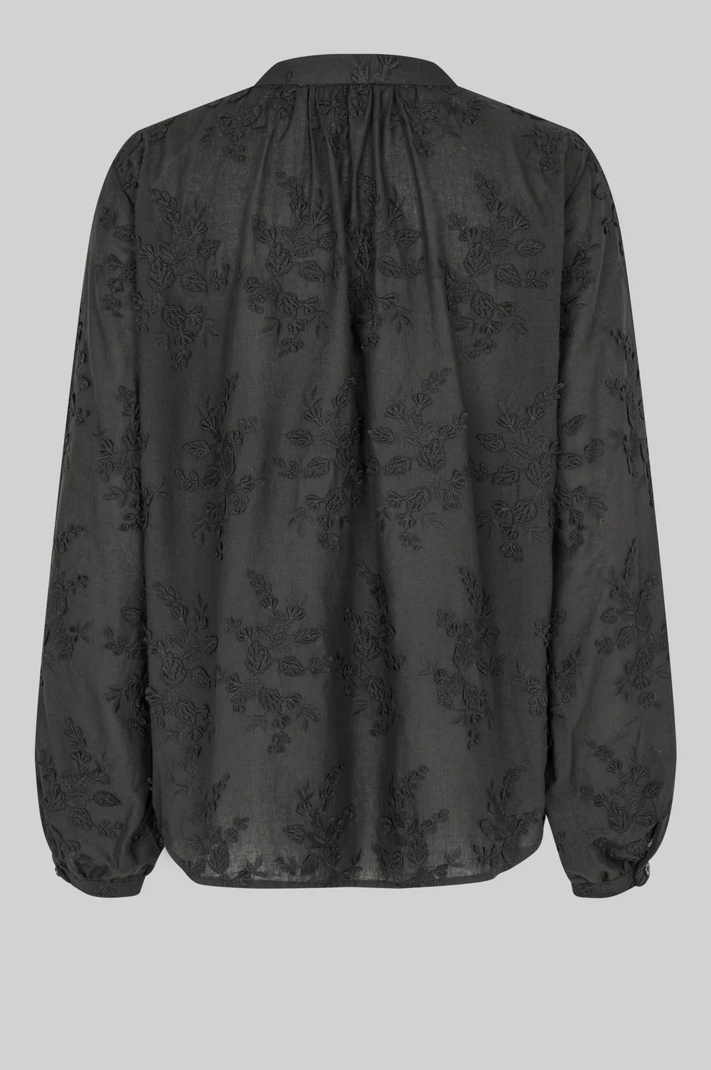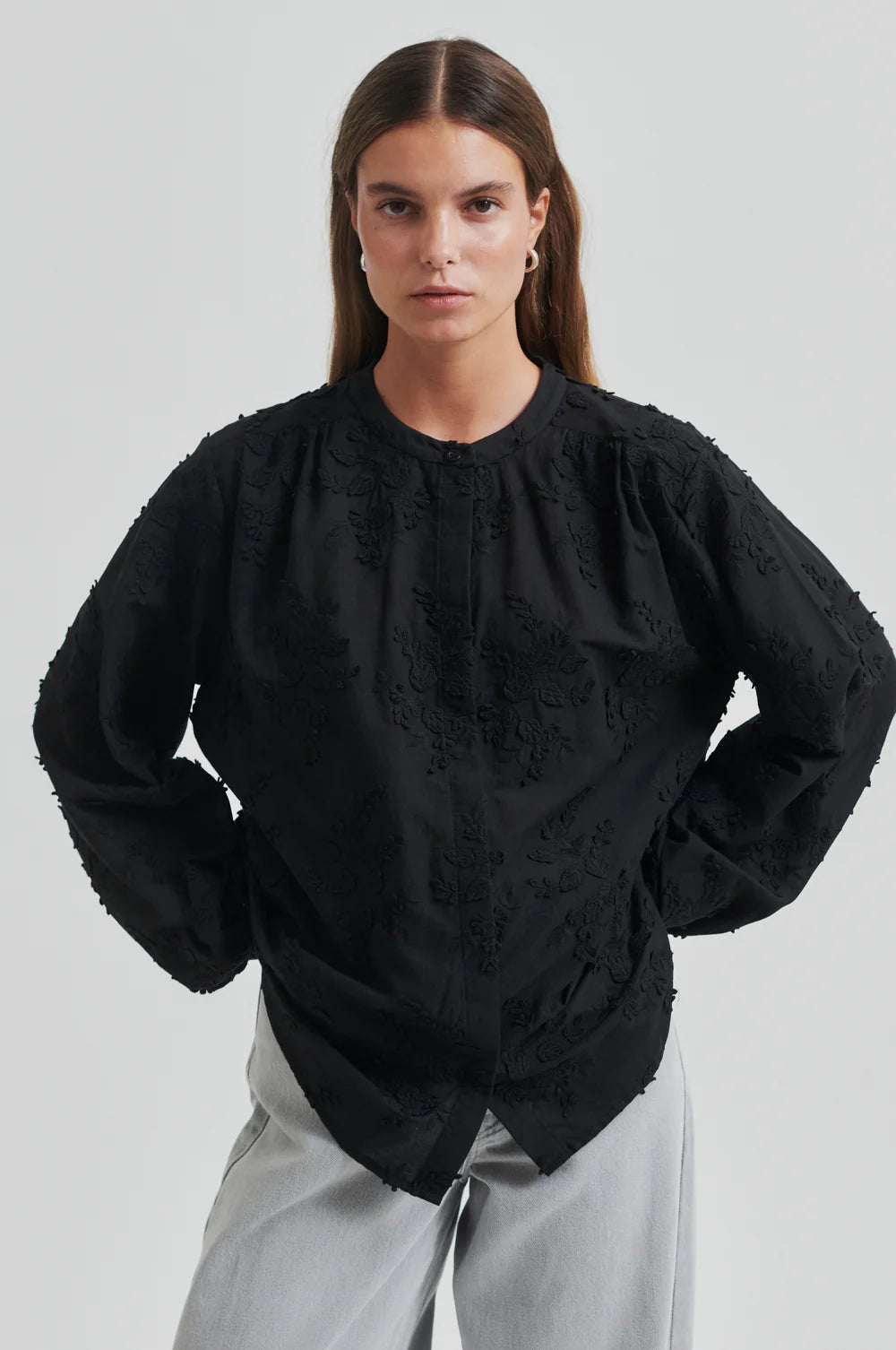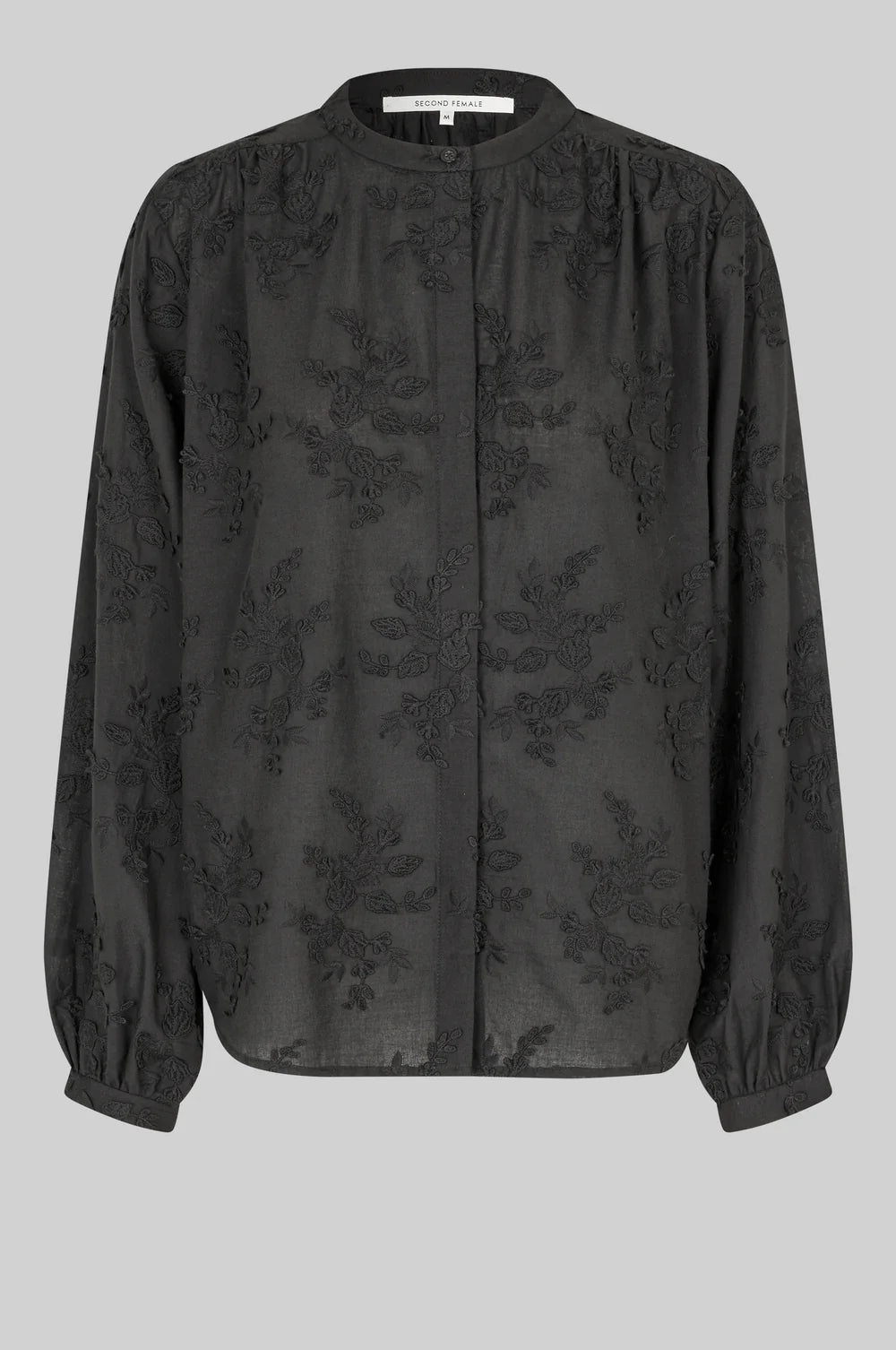 Cavan Shirt fra Second Female er en skjortefavoritt med 3D-blomster, laget av lett, halvgjennomsiktig bomull med blomsterdetaljer over hele. Blusen har en rund krage og skjult knappelukking med en synlig toppknapp, lange ermer med knappede mansjetter og små rynkedetaljer foran og bak i halsen for ekstra volum. Buet nederkant og en løs, luftig passform