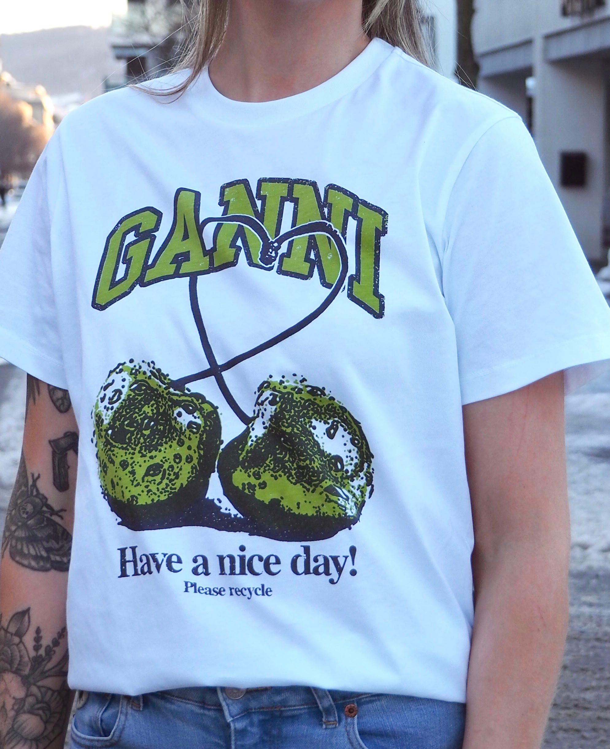 Basic Jersey Cherry Relaxed T-shirt fra GANNI kombinerer tidløs enkelhet med et lekent preg. Den er laget i myk jerseykvalitet og har en avslappet passform, klassisk rund hals og korte ermer for en komfortabel og allsidig stil. Det grønne kirsebærmotivet og det ikoniske GANNI-printet gir et friskt og iøynefallende uttrykk som tilfører antrekket ditt en unik karakter. Perfekt å style med alt fra jeans til skjørt for en uanstrengt, cool look.