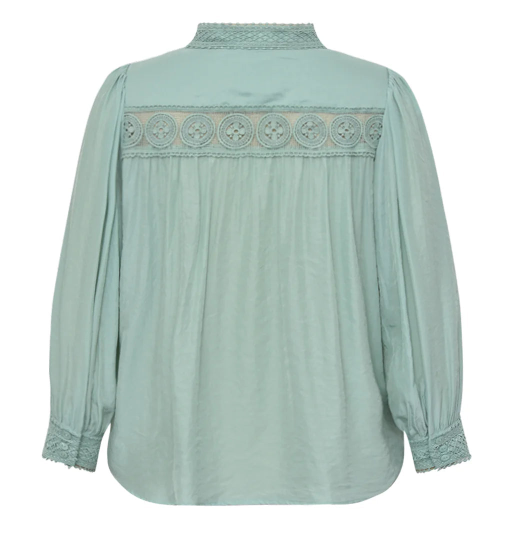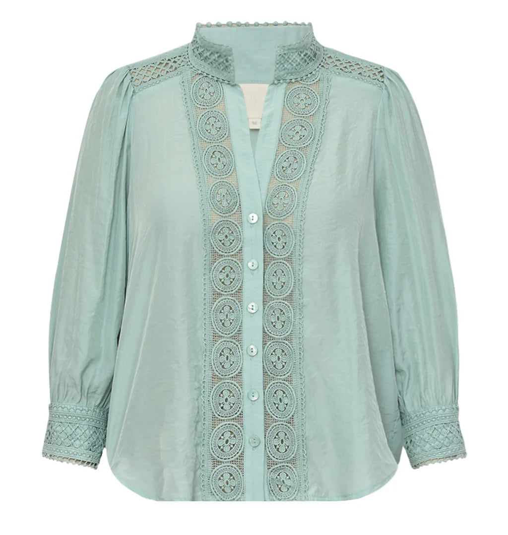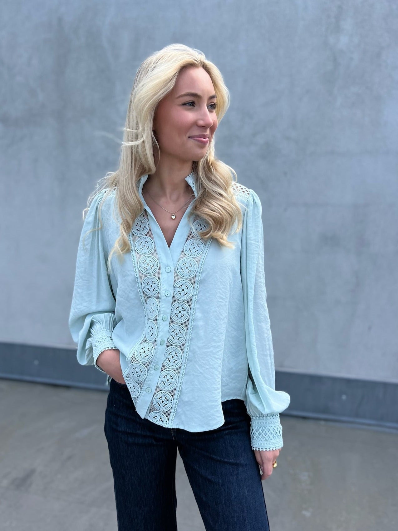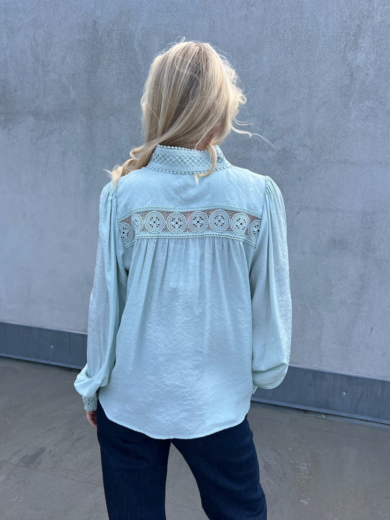 ydelig skjortebluse fra Gossia med elegante blondedetaljer langs stolpelukkingen, kragen og skuldrene. De lange ermene har delikate blondedetaljer ved mansjettene, som gir et ekstra feminint uttrykk. Dette er en virkelig elegant og sofistikert skjortebluse som passer til enhver anledning.