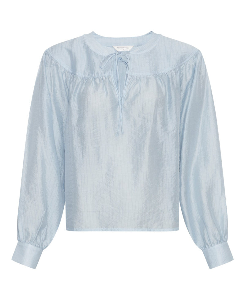 Bean Shirt i nydelig, lys blå fra MSCH Copenhagen er en flott bluse med en tidløs passform som enkelt kan kombineres med både uformelt og formelt antrekk. Skjorten har rund hals med knyting, lange ermer med mansjetter og en løs passform. Overdelen er laget av et behagelig materiale.