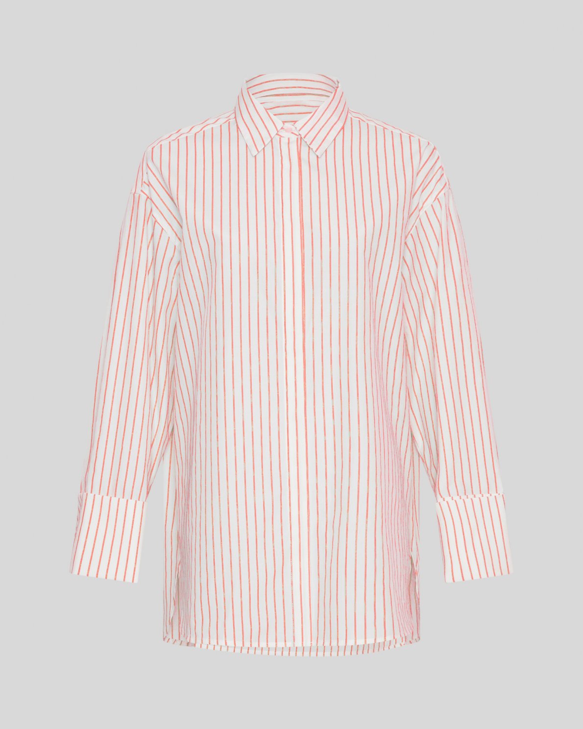 MSCHErina Zenika Shirt fra MSCH Copenhagen er en oversized poplinskjorte med en klassisk krage, droppede skuldre og franske mansjetter. Den hvite skjorten med røde striper gir en frisk og tidløs look – perfekt for våren, i årets trendfarge.