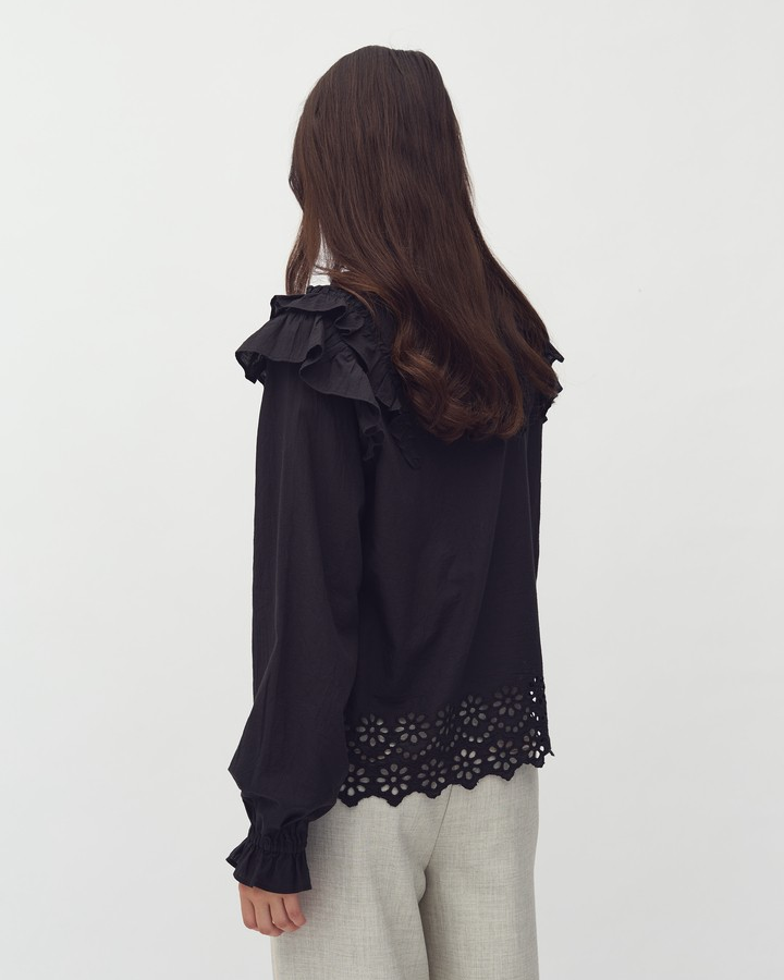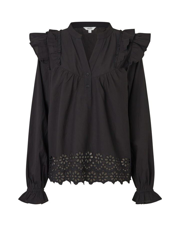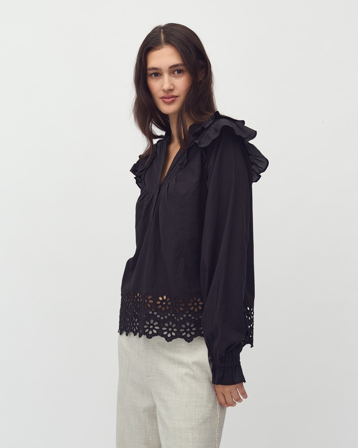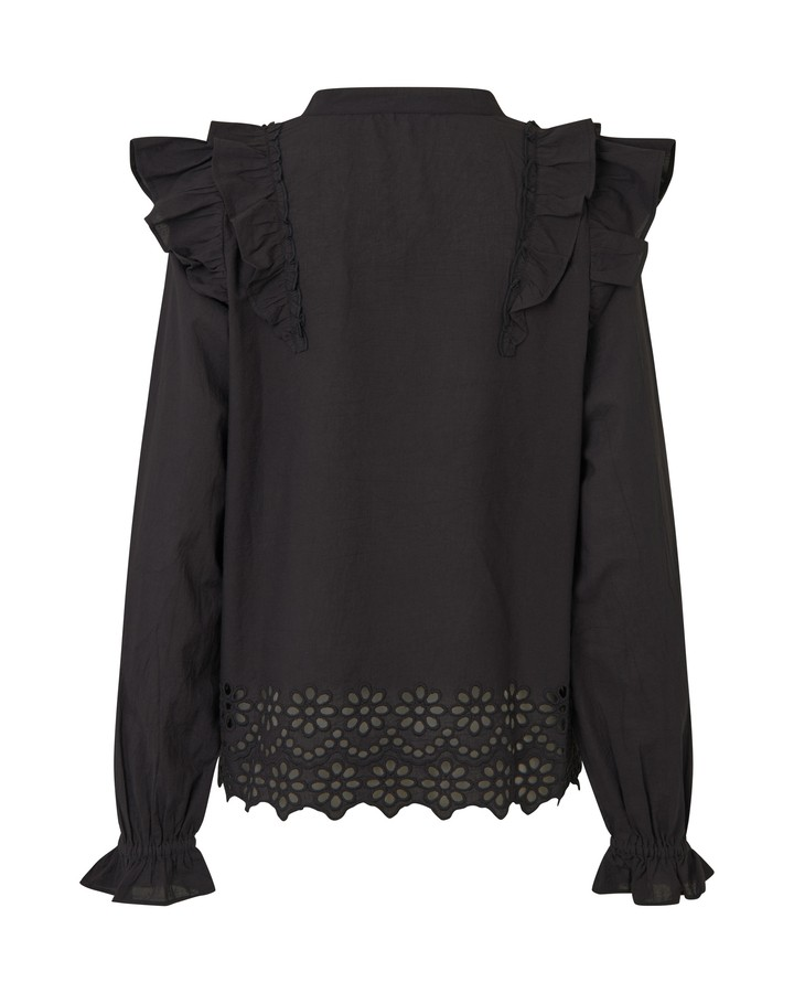 Natia-M Kalevi Blouse fra M by M er en nydelig bluse med blondedetaljer. Skjorten har volanger over skuldrene, knepping i front og volangdetaljer rundt håndleddene.