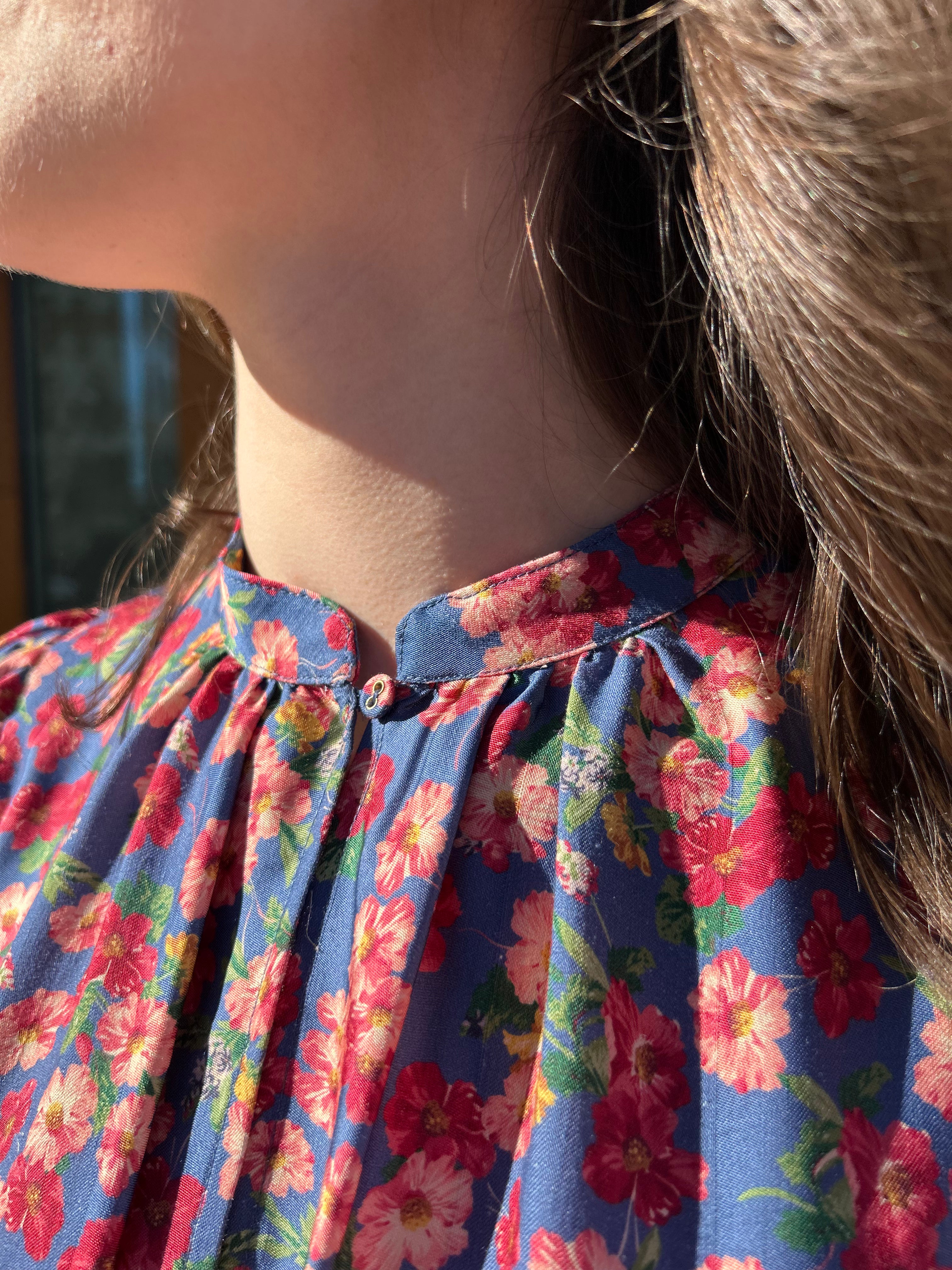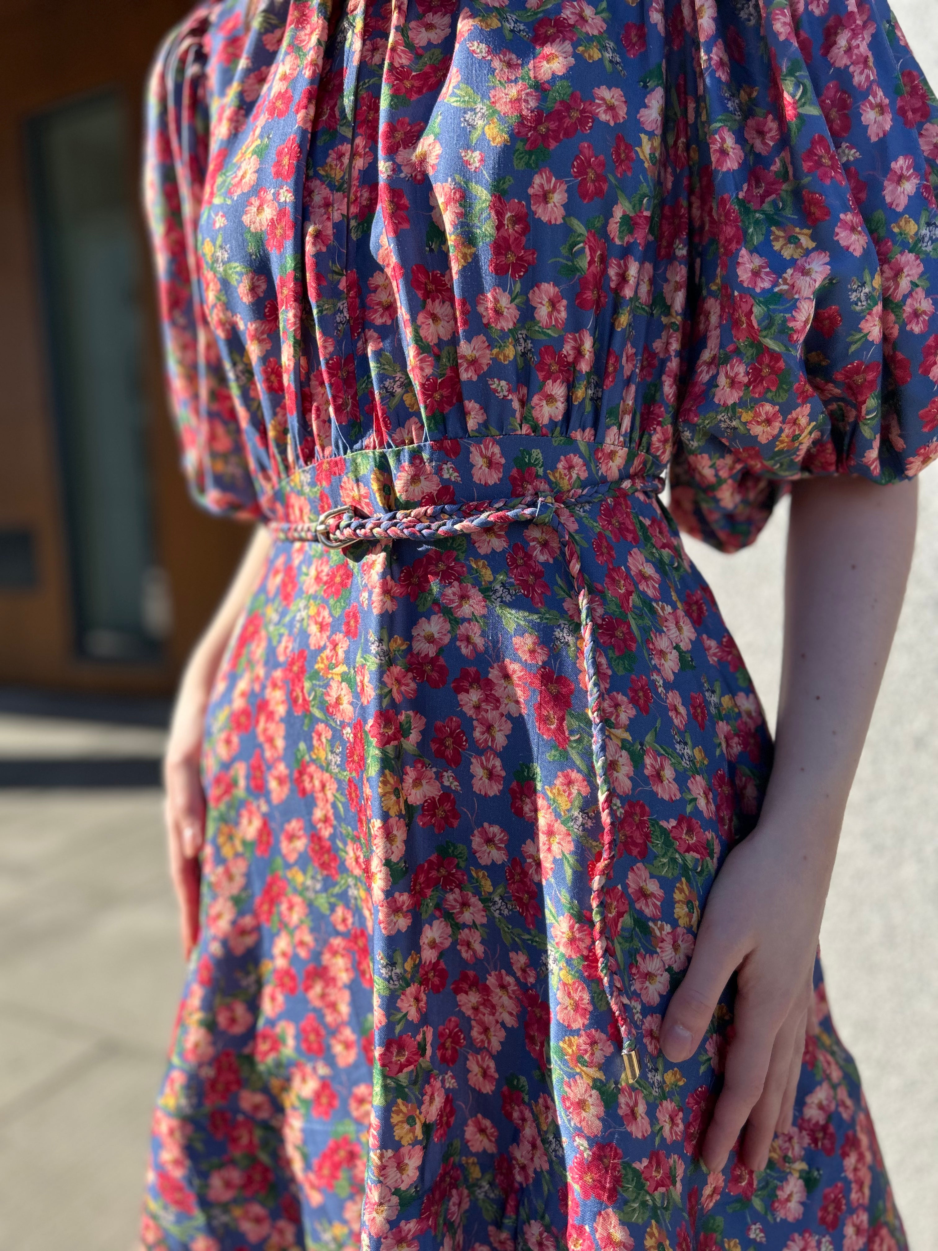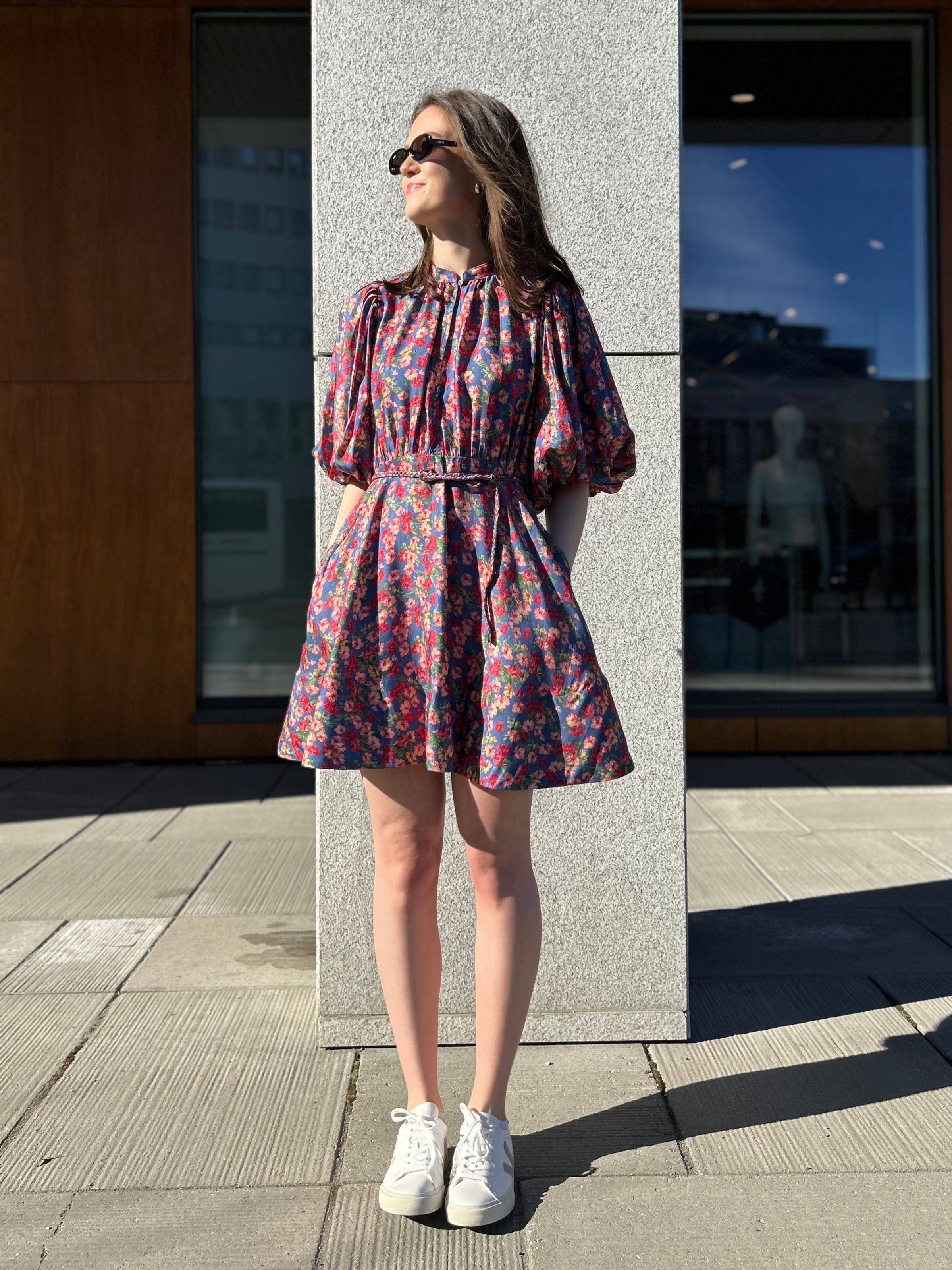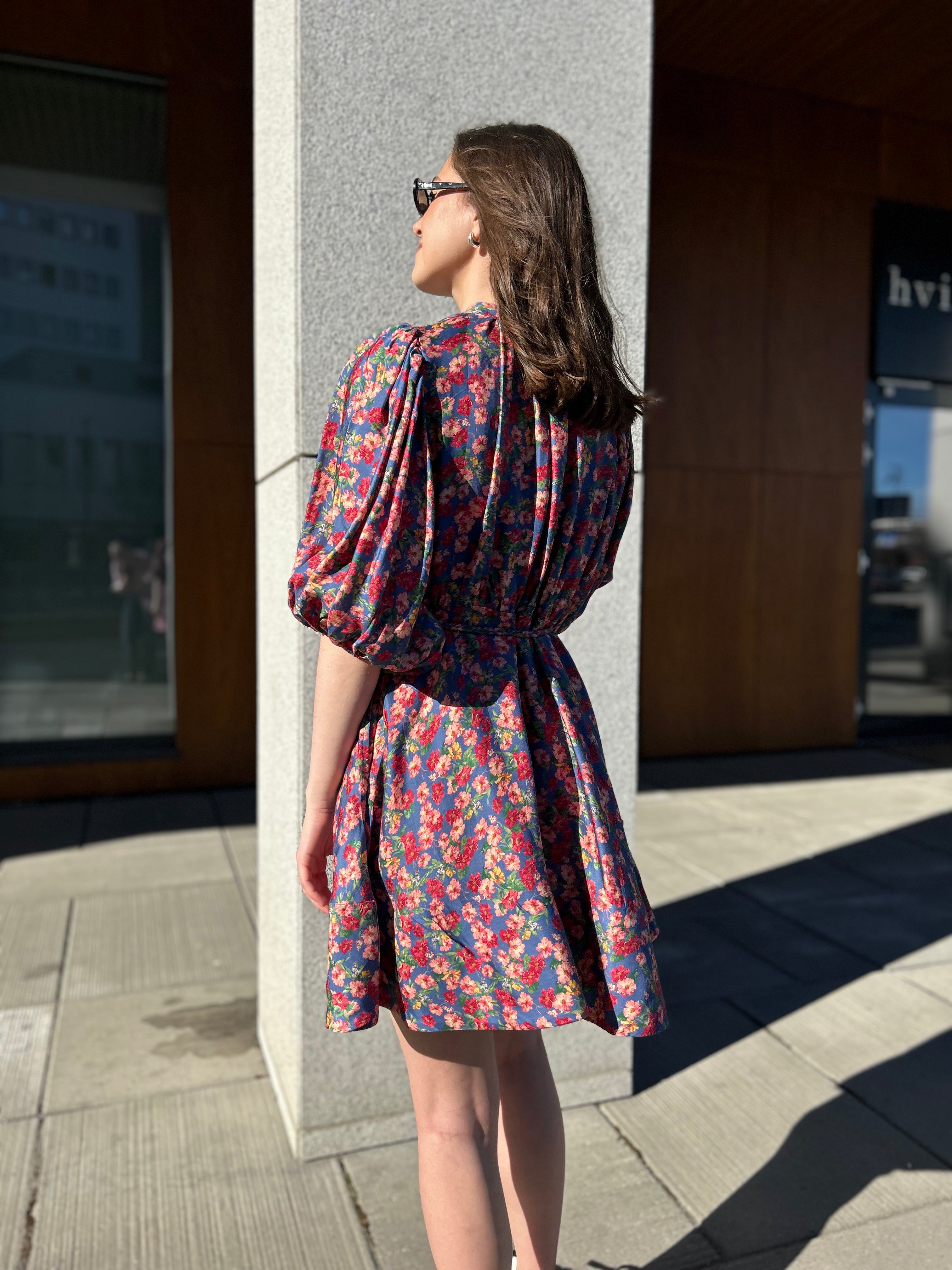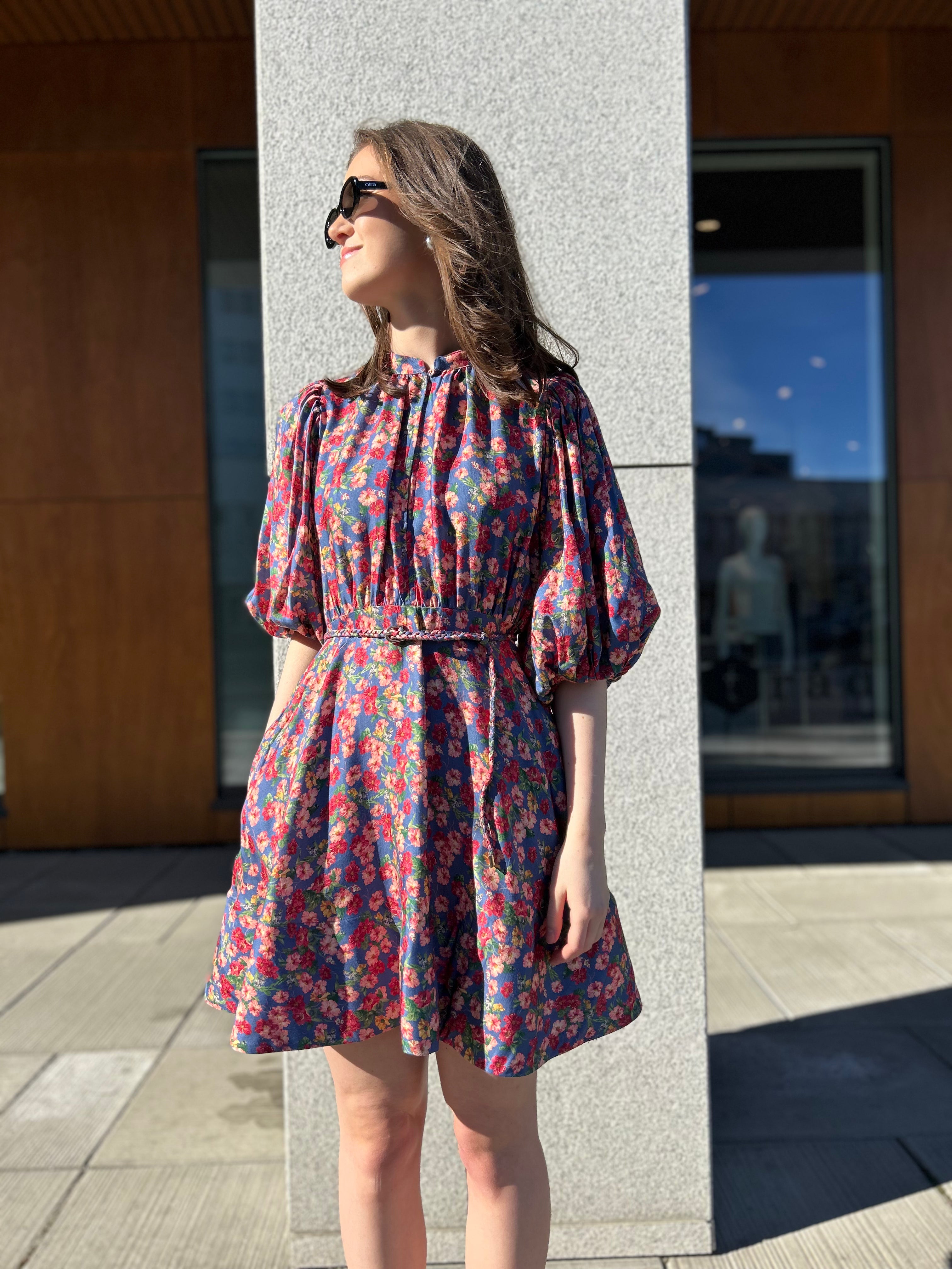 Viscose Belt Dress Delightful fra byTiMo er en nydelig minikjole med rødt og rosa blomsteprint på blå bakgrunn. Kjolen har halvlange puffermer med elastikk og et belte i livet.
