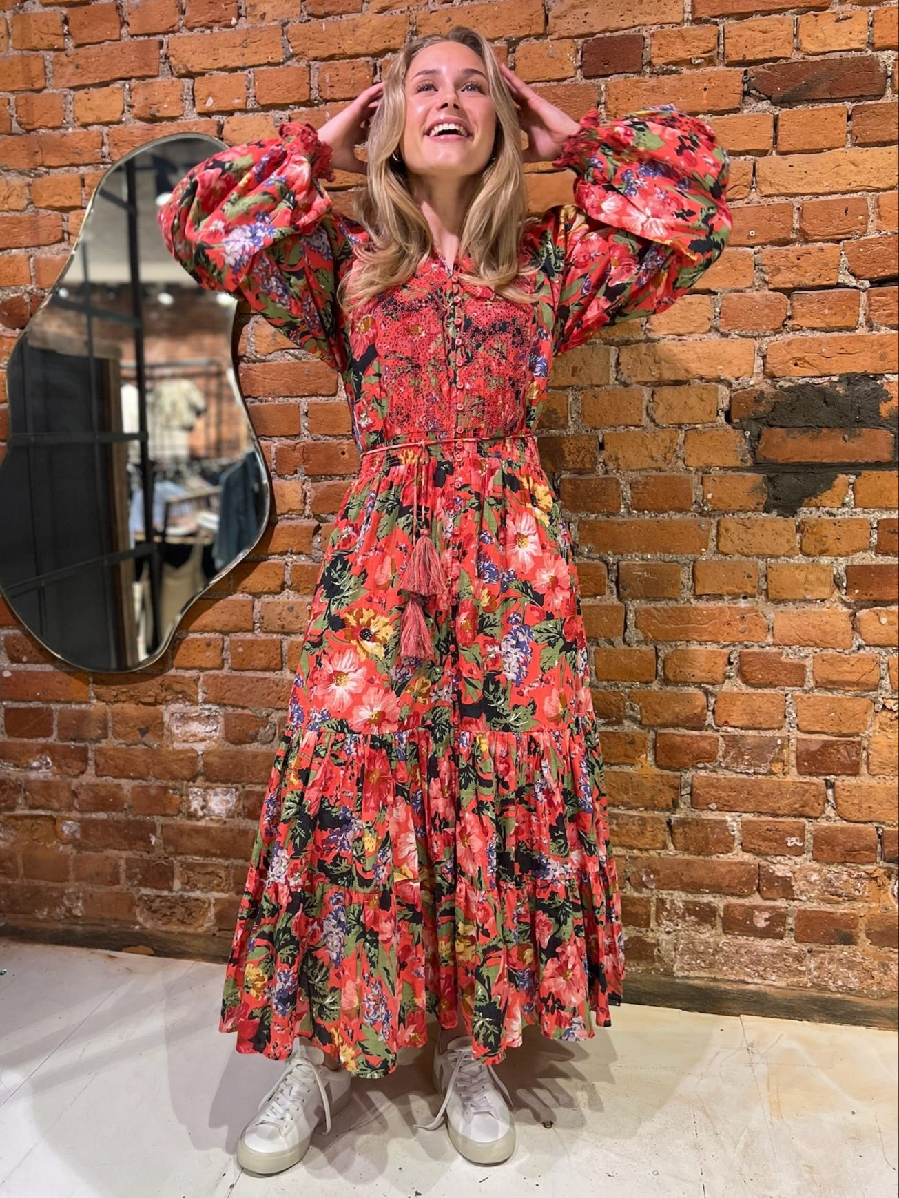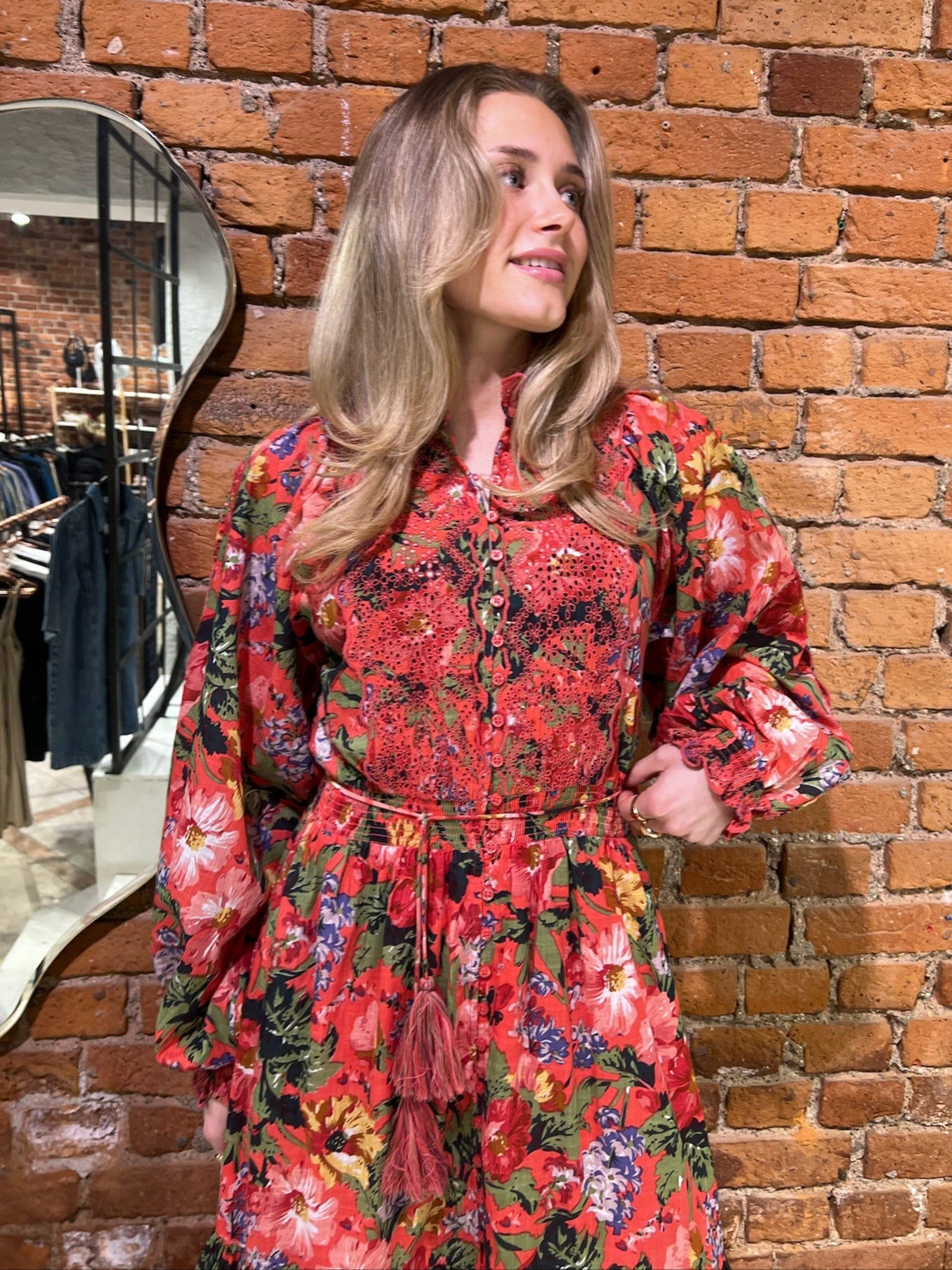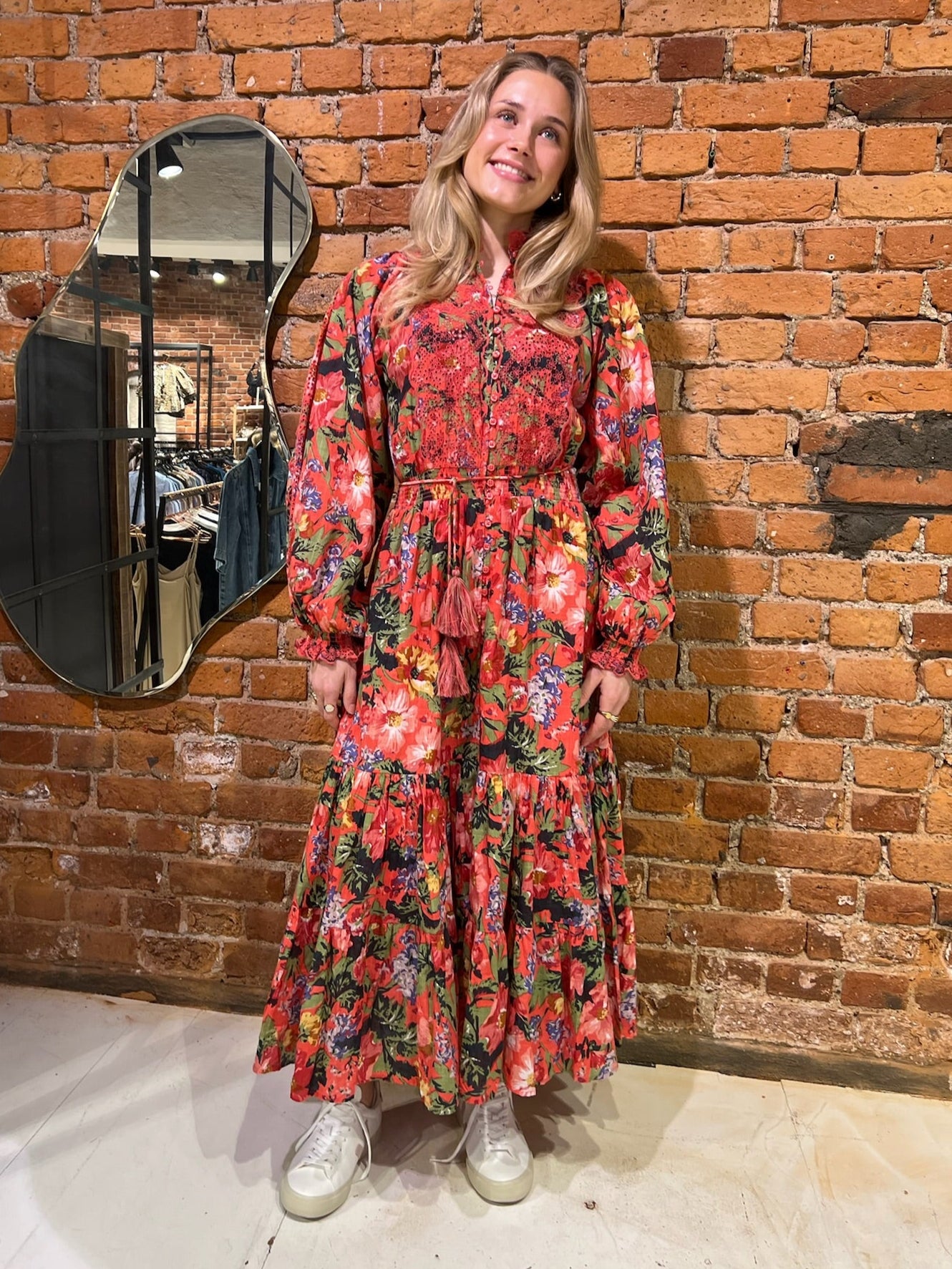 Cotton Slub Midi Dress Pink Blooming fra byTiMo er en nydelig midikjole fra byTiMo. Kjolen er laget av byTiMos lette og myke bomull- og viskoseblanding med slubdetaljer i stoffet. Den har en midilengde og definert, smocket midje. Kjolen har oversizede, vintage-inspirerte, korte ermer og er satt inn med broderie anglaise detaljer på brystet, ermene, mansjettene og halsen. Cotton Slub Midi Dress har et elegant langt skjørt med volum, knappelukking i front og knytebelte i livet.