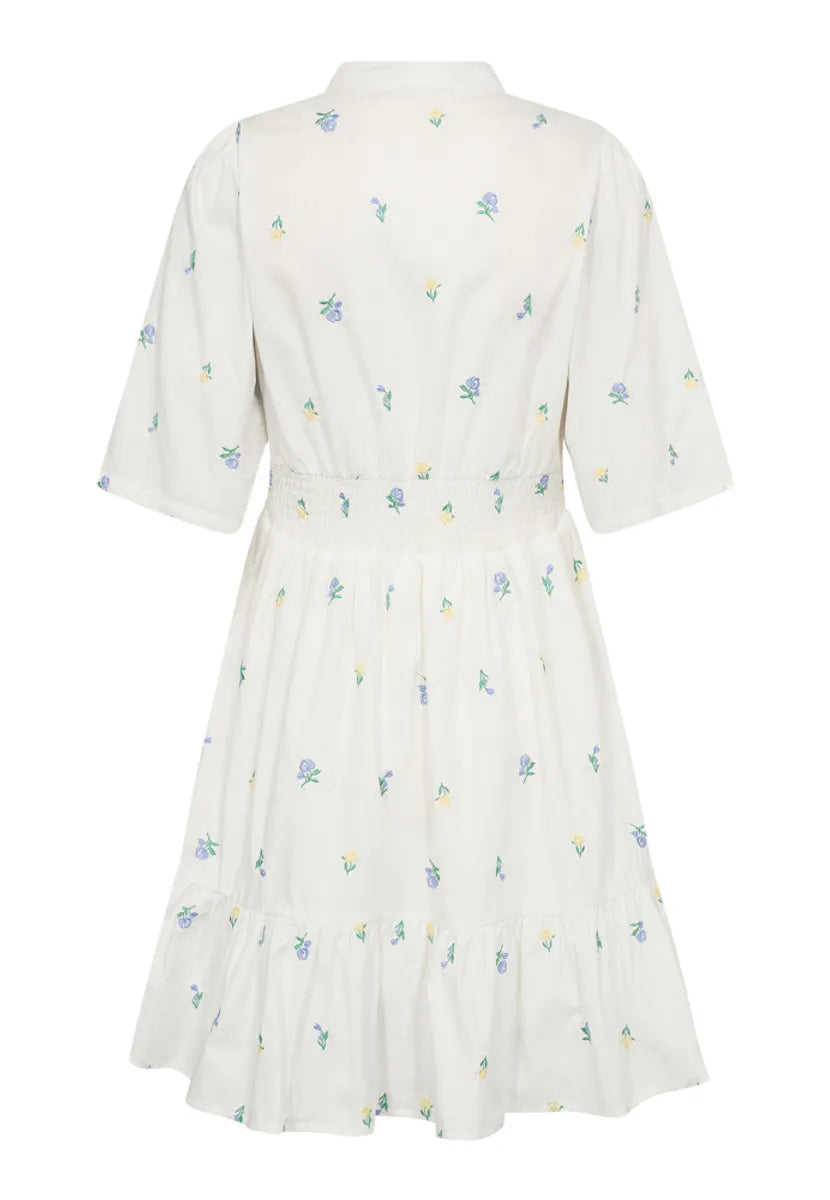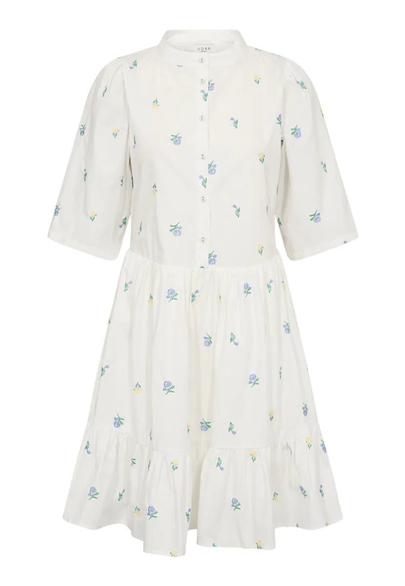 Miluna 2/4 Dress fra Norr er en nydelig kjole i hvit farge med brodert blomsterprint i blått og gult som vil være et herlig tilskudd til garderoben. Kjolen har mini-lengde, rund hals, korte ermer og knappestolpe på brystet. Den har praktiske stikklommer i sidene samt volang-detalj over skuldrene som gir et feminimt preg. Kjolen har en avslappet passform og smockdetaljer bak i ryggen som markerer midjen på en elegant måte, samtidlig som den er komfortabel. Perfekt lengde til ca midt på låret. En kjempefin kjole i myk bomullskvalitet som passer perfekt til vår- og sommersesongen.