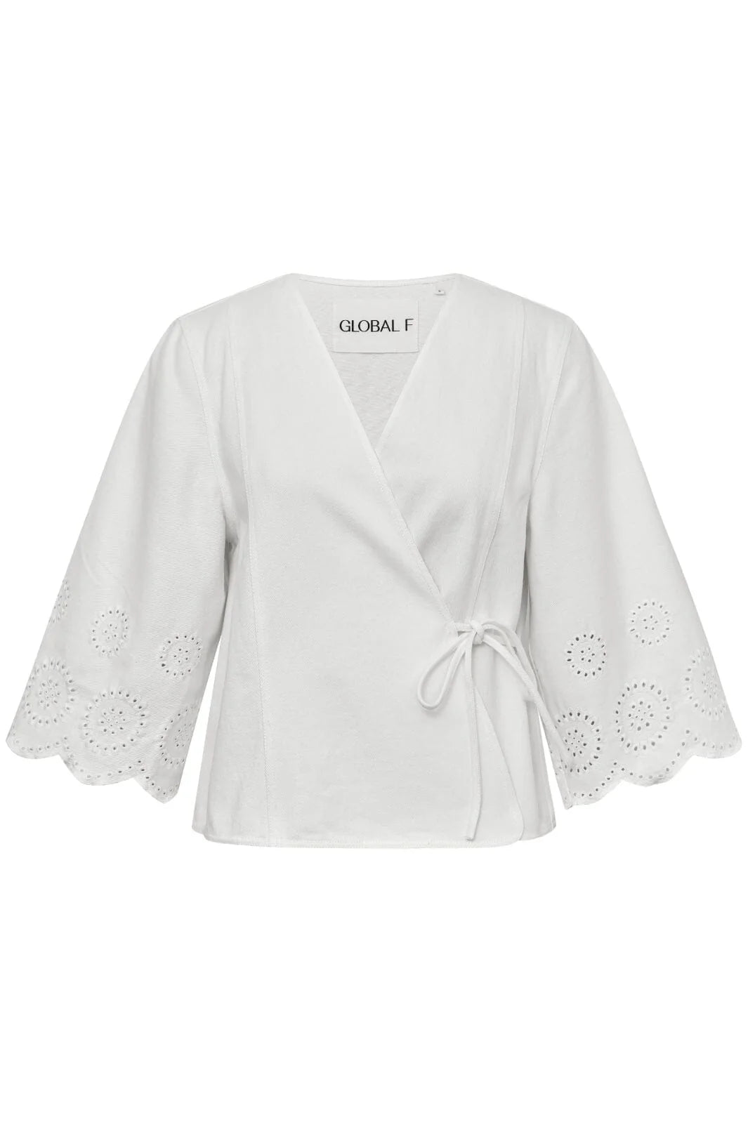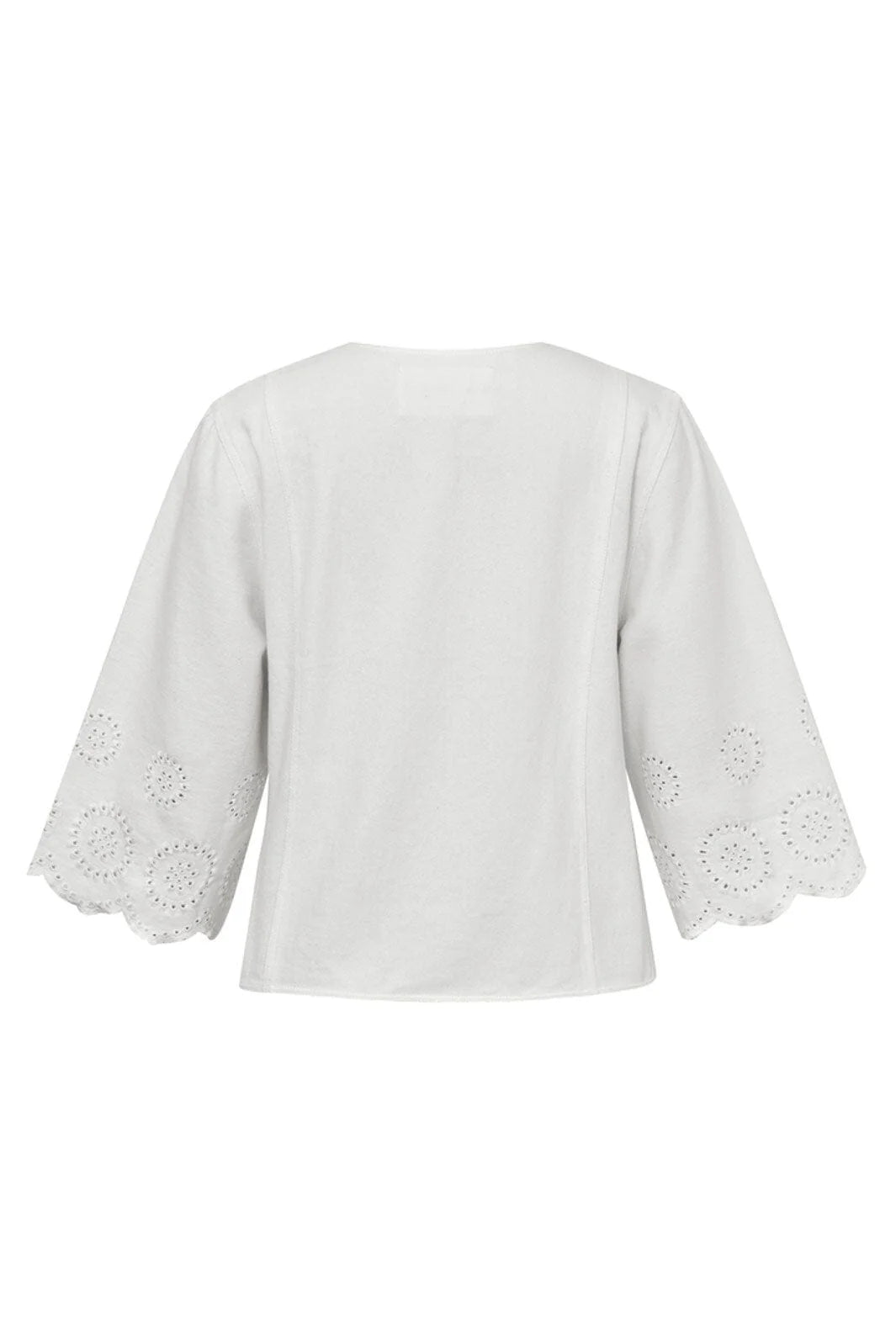 Sunany Scallop-G Aniloula Shirt Blouse White fra Global Funk er en lett og feminin omslagsbluse, perfekt for sommerens varme dager. Den har vide trekvart-ermer med vakre hullbroderier og bølget kant som gir et romantisk og sofistikert preg. Omslagsfasongen knytes elegant i siden og gir en flatterende silhuett. Blusen er laget i 100 % bomull og matcher perfekt med Talina Scallop-G shorts for et gjennomført og sommerlig sett.