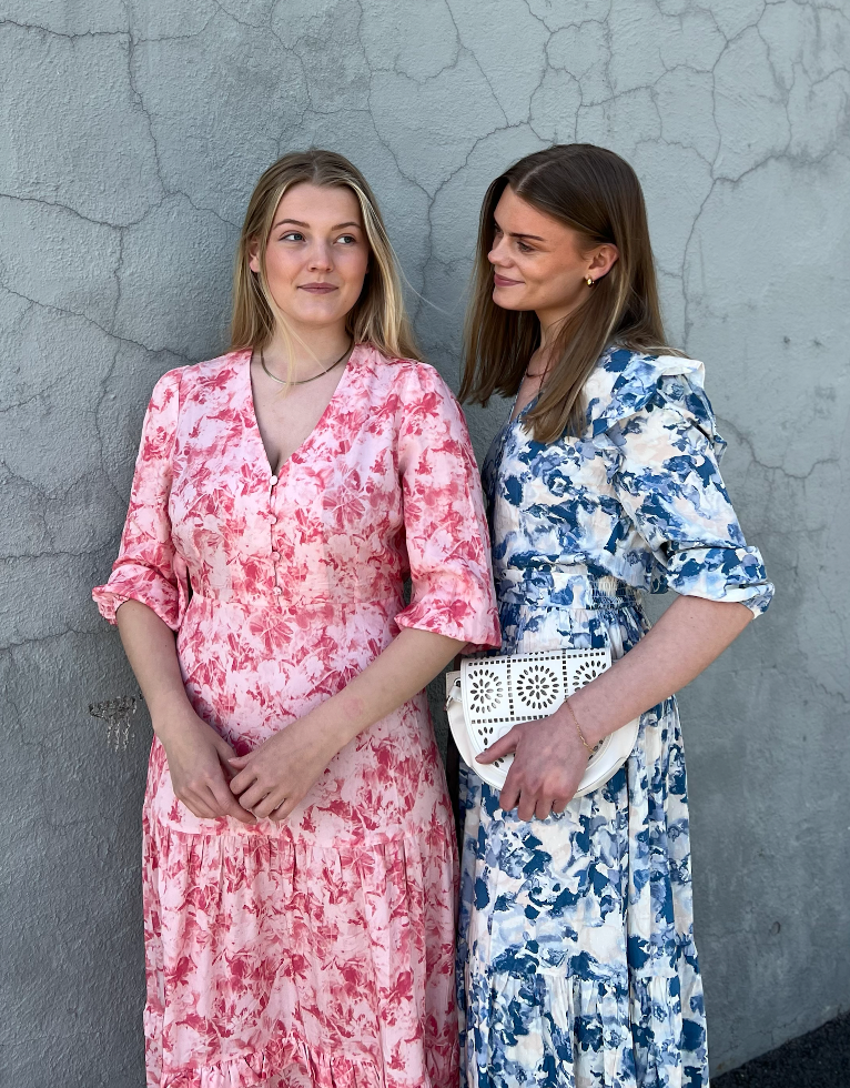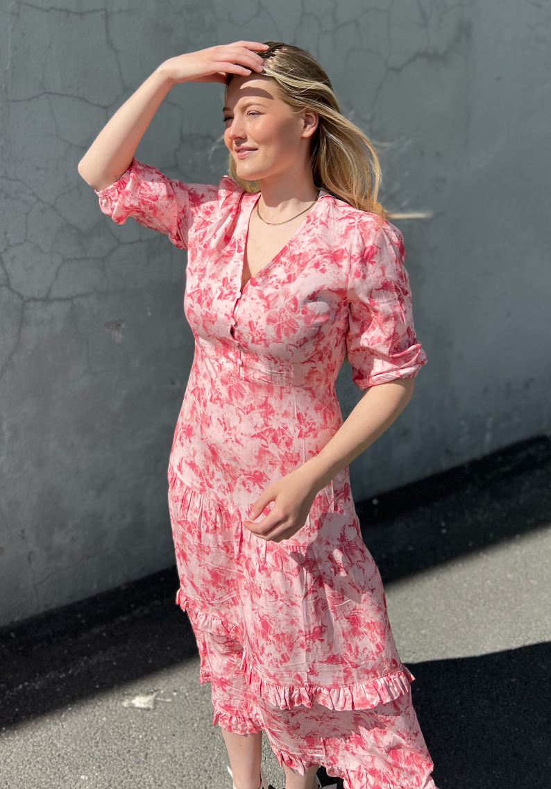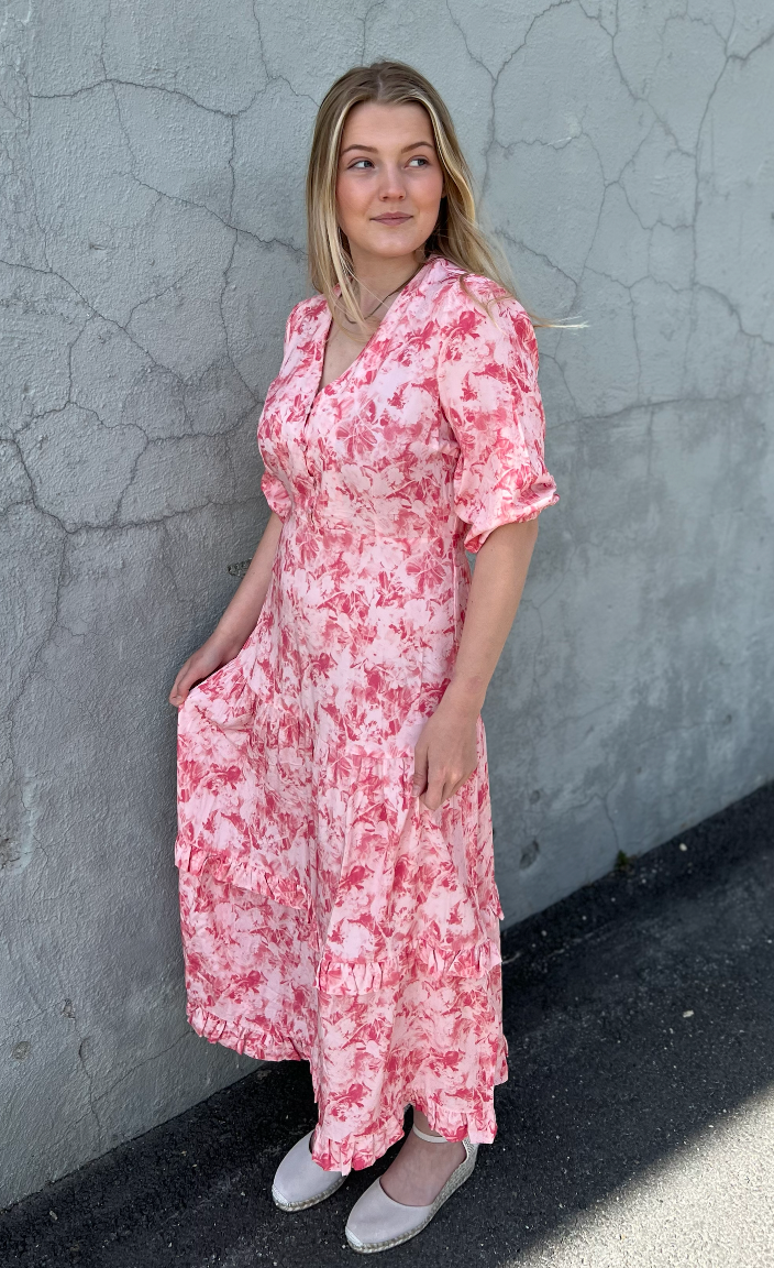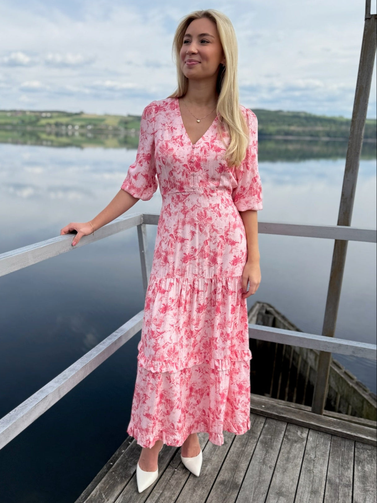 ydelig lang rosa kjole fra Mbym! Kjolen har et skjønt blomsterprint, V-hals, 3/4 armer og trekte knapper på brystet. Denne er perfekt nå mot sommeren!