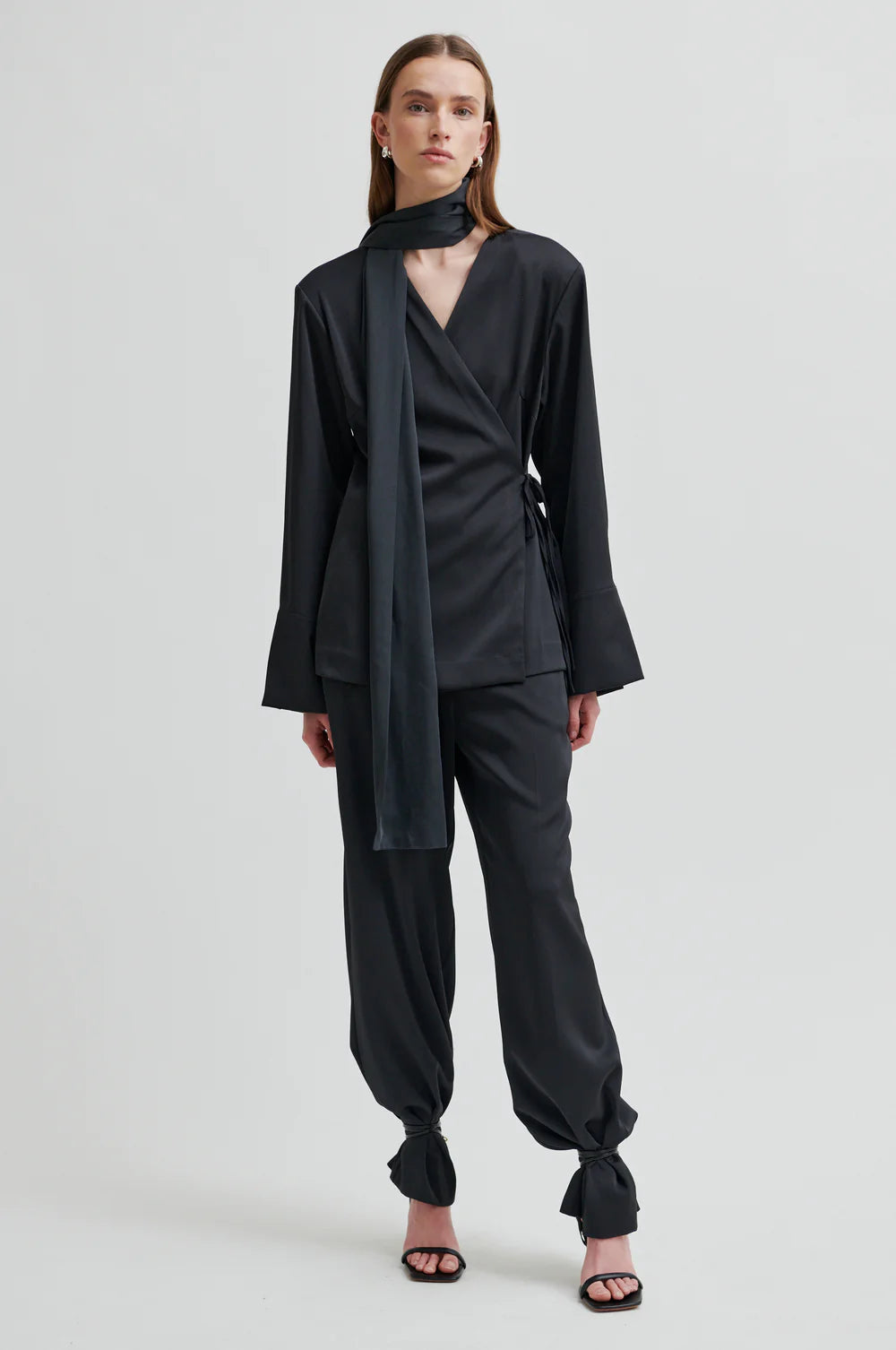 Glari Trousers Black fra Second Female er et par elegante bukser laget i et glatt og flytende materiale som faller pent. Buksene har elastisk midje med dekket strikk og dekorativ gylf, to sidelommer og to pyntelommer bak. Med normal midje og rett, avslappet passform kombinerer de komfort og stil på en sofistikert måte.