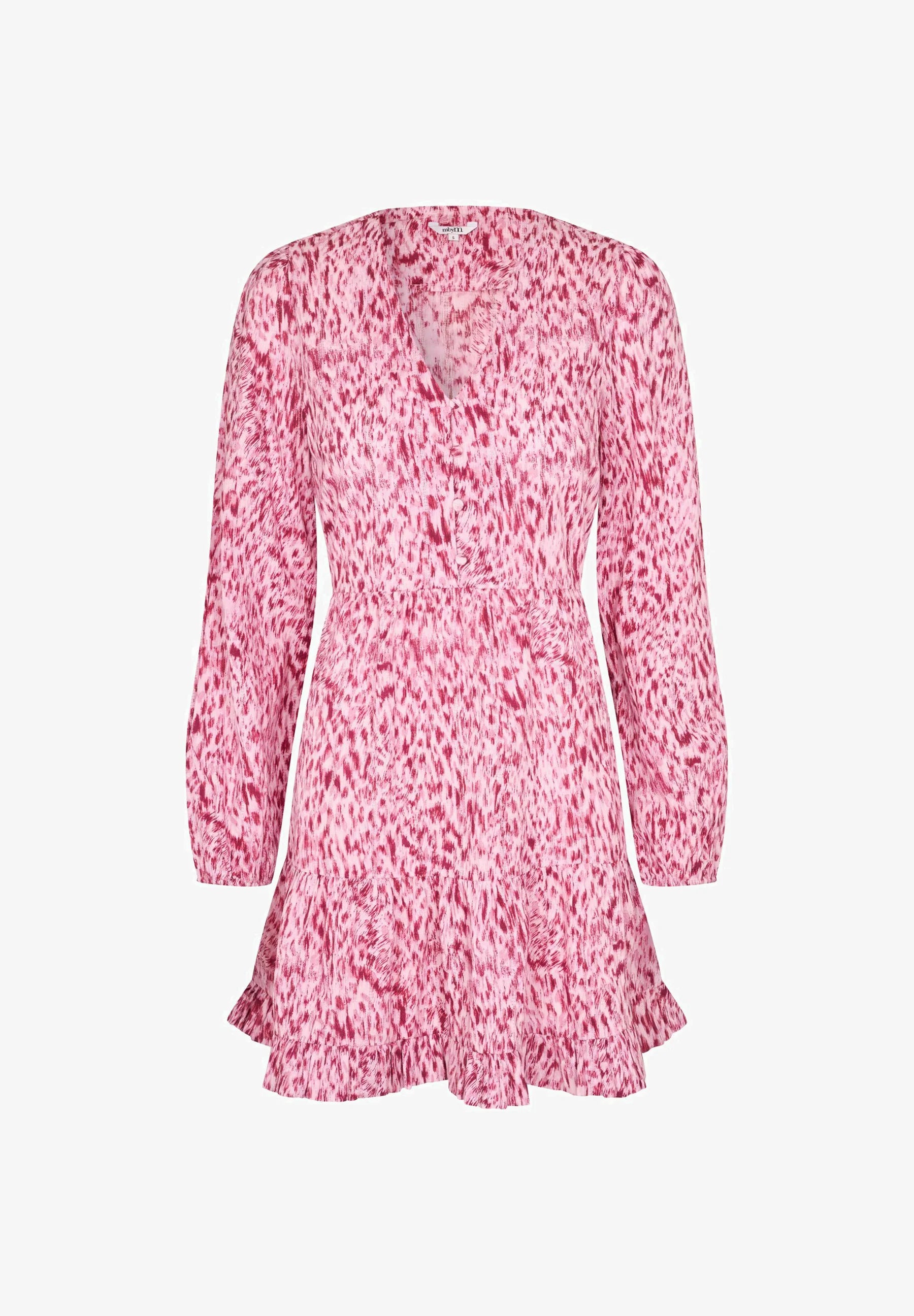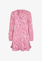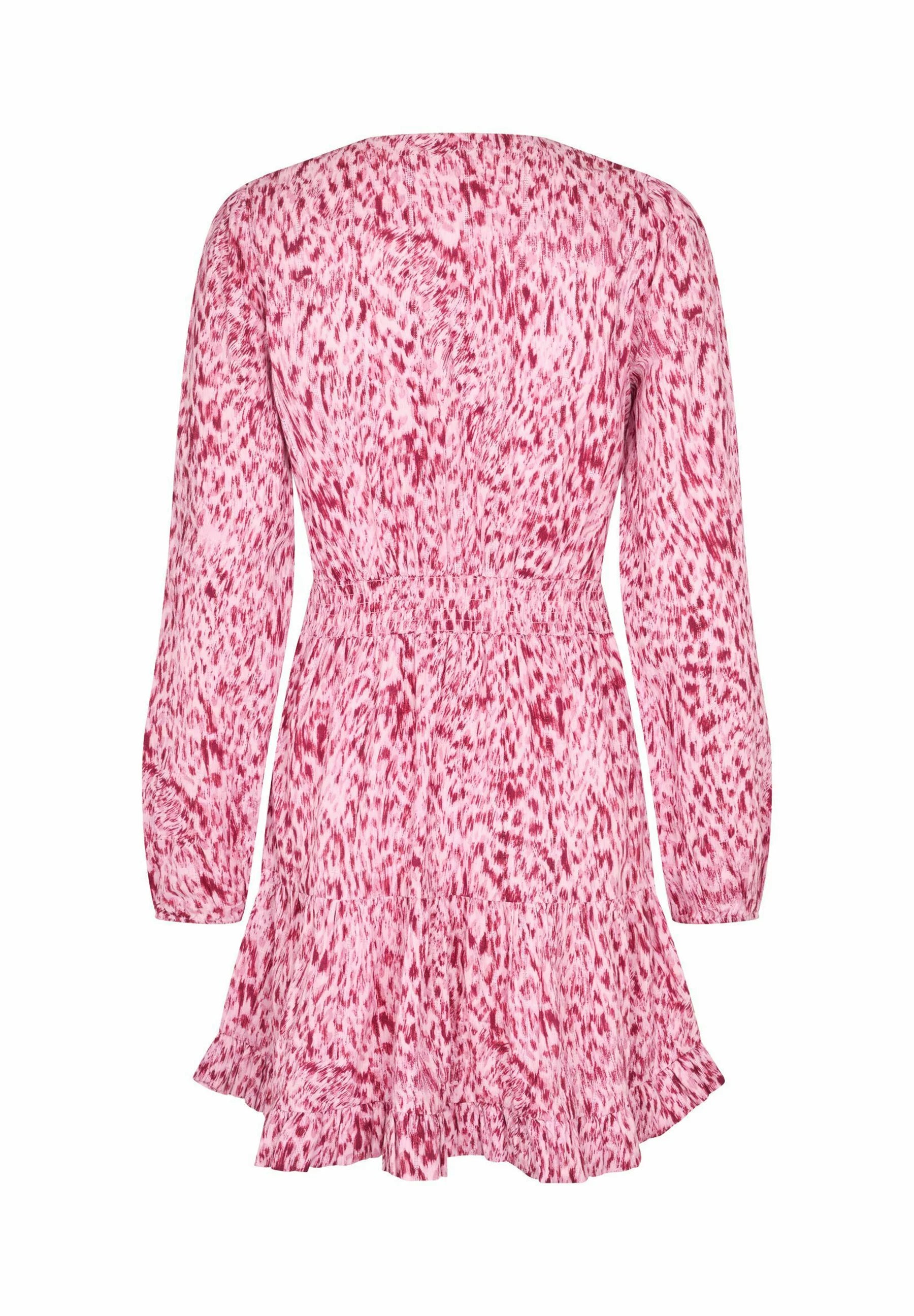 Shinya LS-M Lynx Print Dress fra MbyM er en feminin og lett kjole i et vakkert rosa print. Kjolen har en flatterende V-utringning med knapper foran og lange ermer som gir et elegant uttrykk. Den markerte midjen skaper en fin silhuett, mens det lette skjørtet med volangkant gir kjolen en leken og bevegelig følelse. Perfekt både til hverdags, jobb og sommerlige anledninger. Style den med sandaler for en avslappet look eller med boots og en jakke.